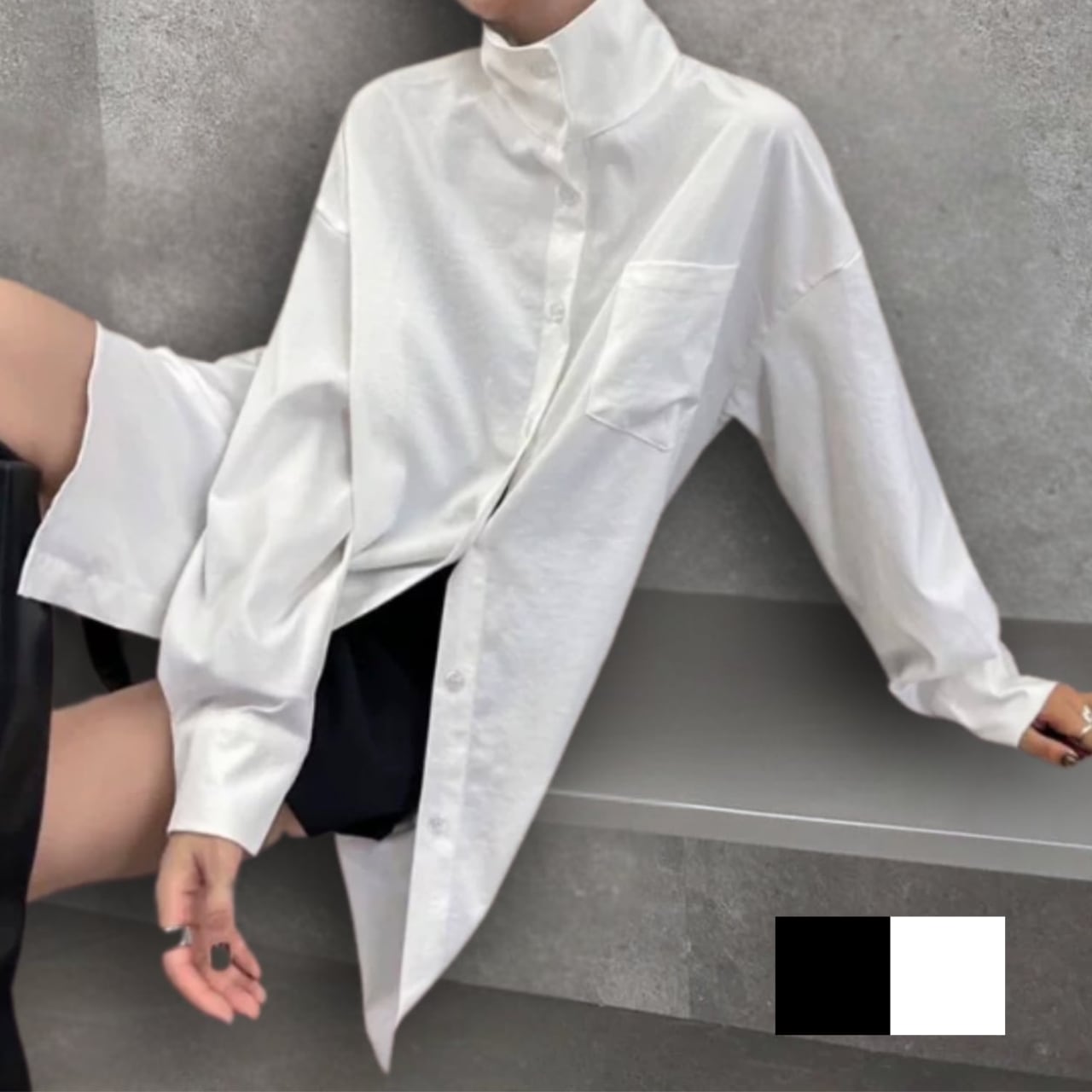 オーバーサイズでアウター感覚で着用できるシャツ。アレンジ可能なハイネックでクールさも演出。