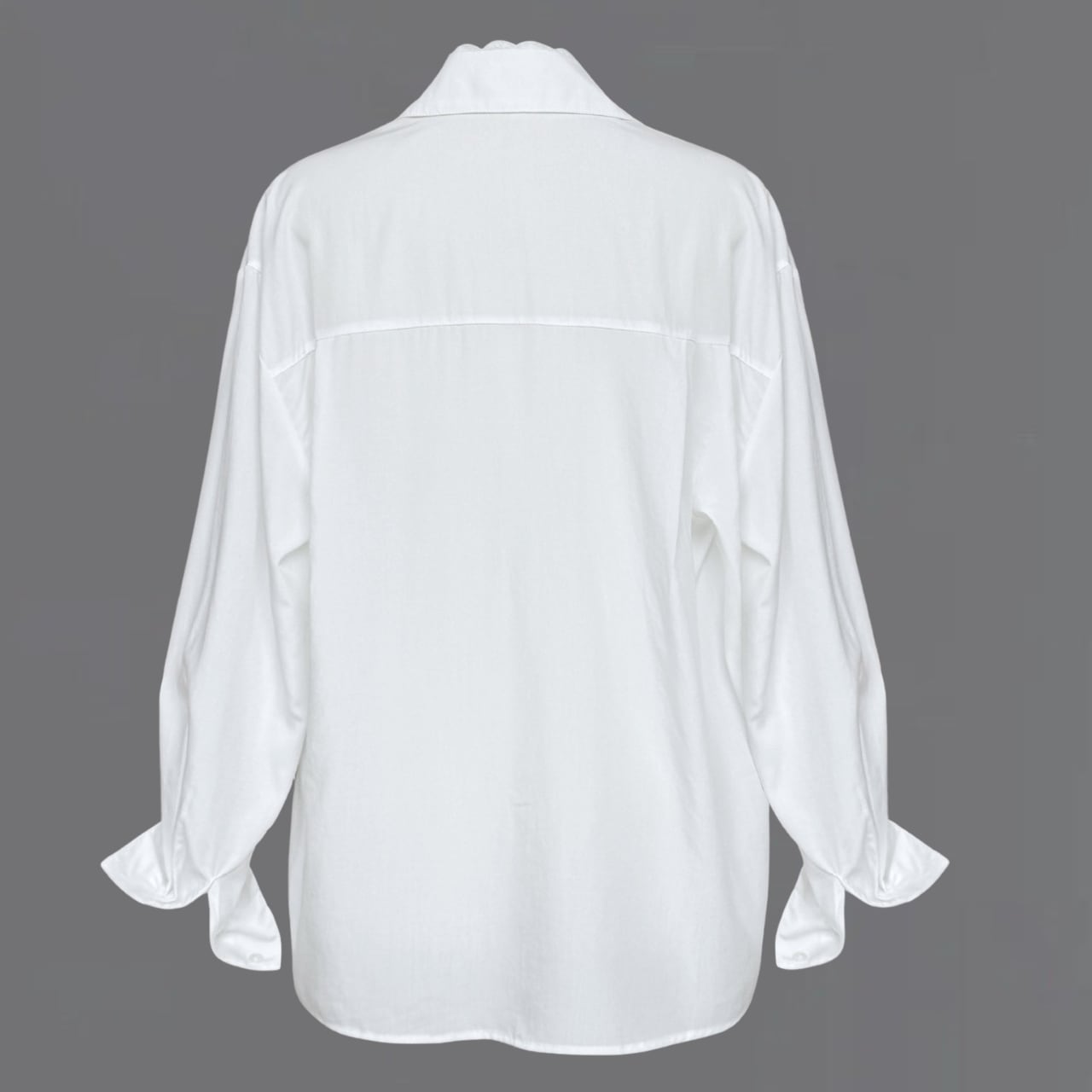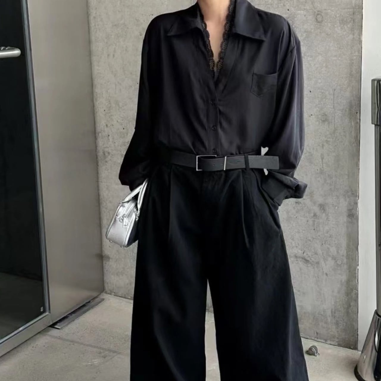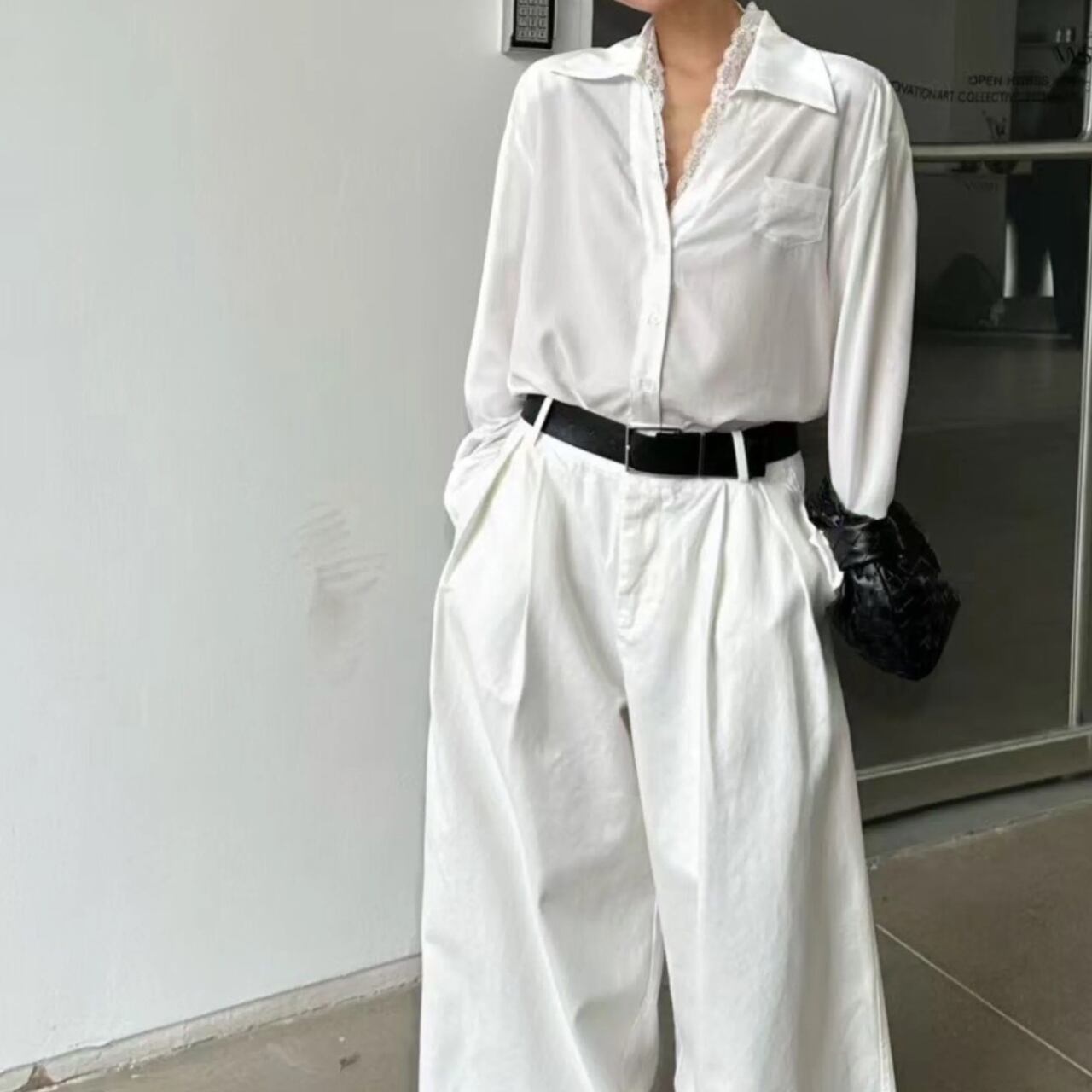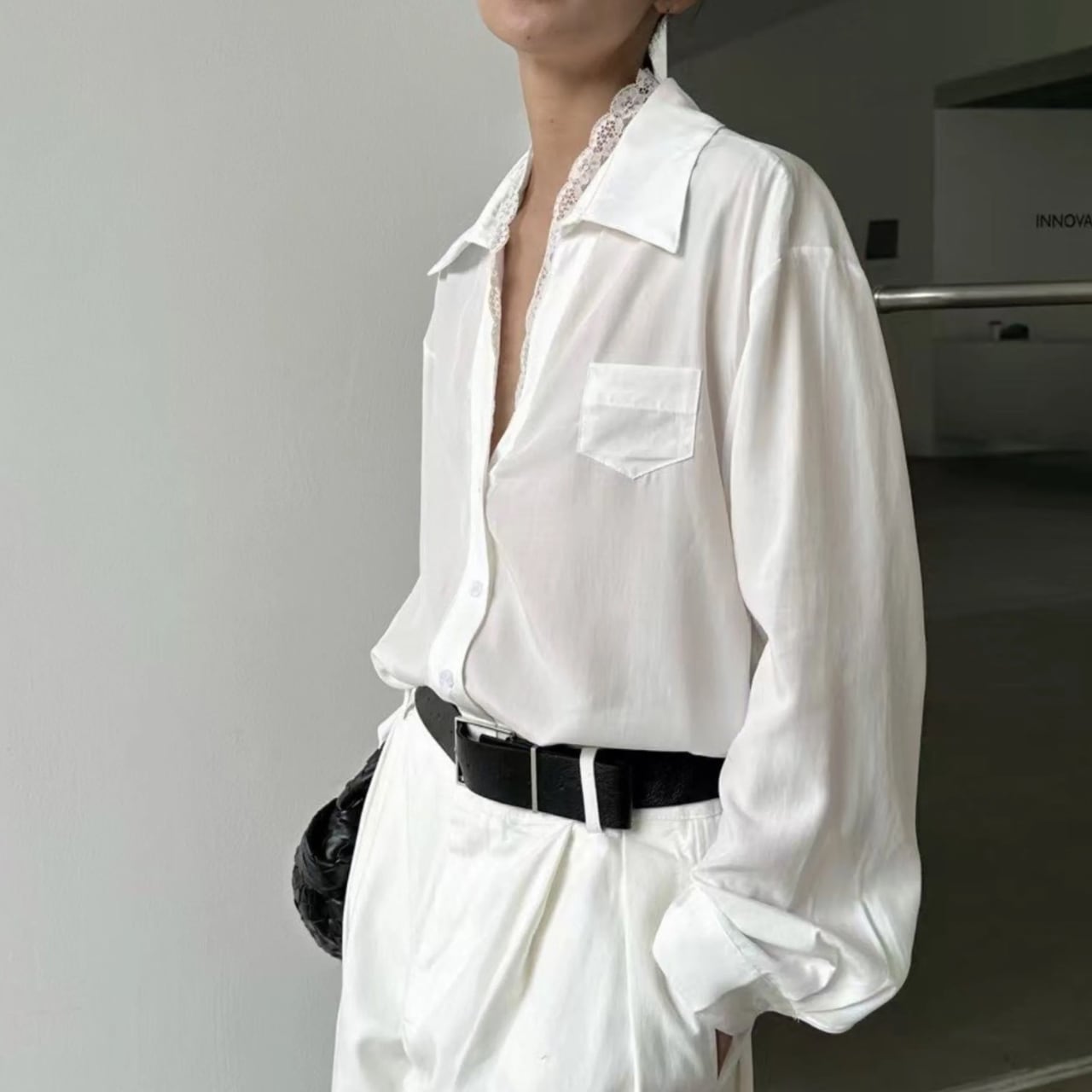オーバーサイズのシャツにレースをトッピング。華やかさをプラスしたトレンド感あるデザイン。小さ目胸ポケットもシャツのアクセントに。