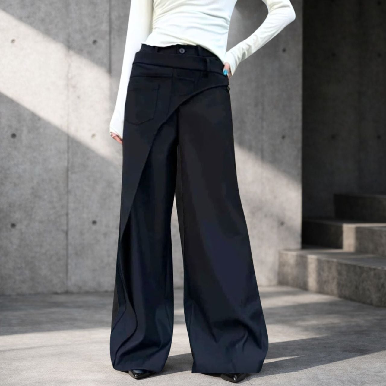 後ろ姿はシンプルなスラックス。フロントはエッジの効いたデザインのラップパンツ。いつものコーデに個性をプラスしてくれる1着。