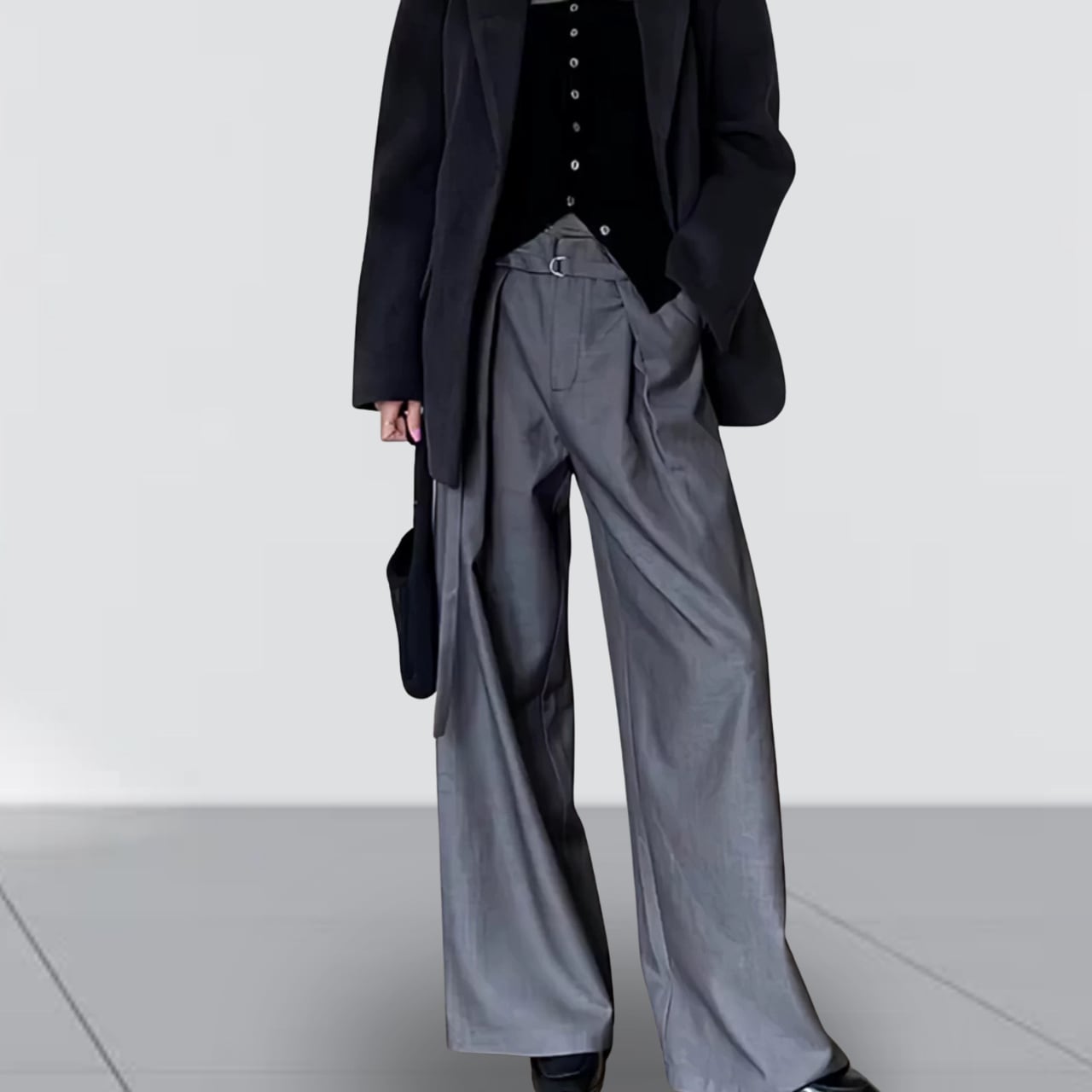ベルトでギュッと締めたタックがデザイン性の高いハイウエストパンツ。きれいめにもカジュアルにもコーディネートできる1着。