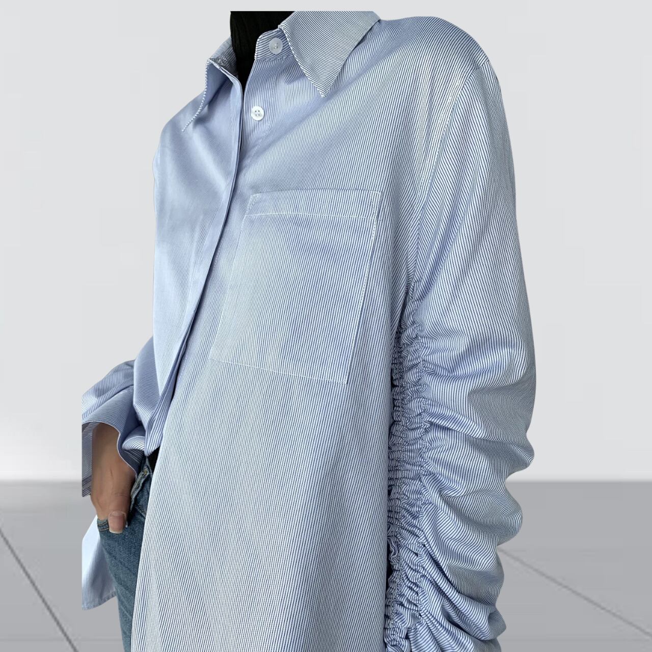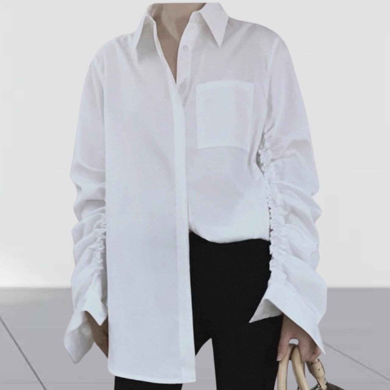 メンズライクなシャツにギャザースリーブをほどこしたデザインシャツ。きちんと感の中に遊び心がある1着。