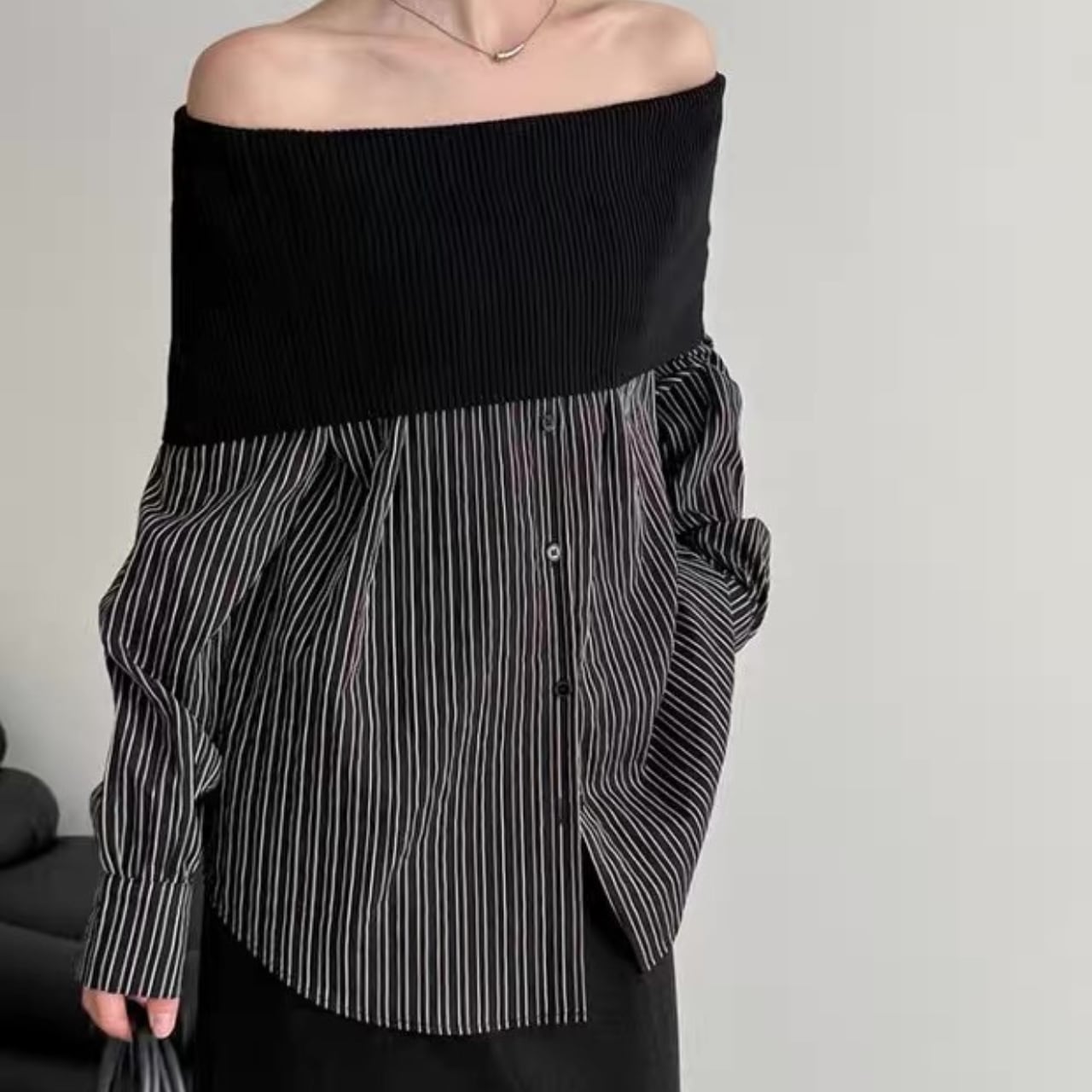 オフショルダーの女性らしさとシャツのきちんと感の良いとこどり。この時期ならではのデザインを思いっきり楽しめるアイテム。