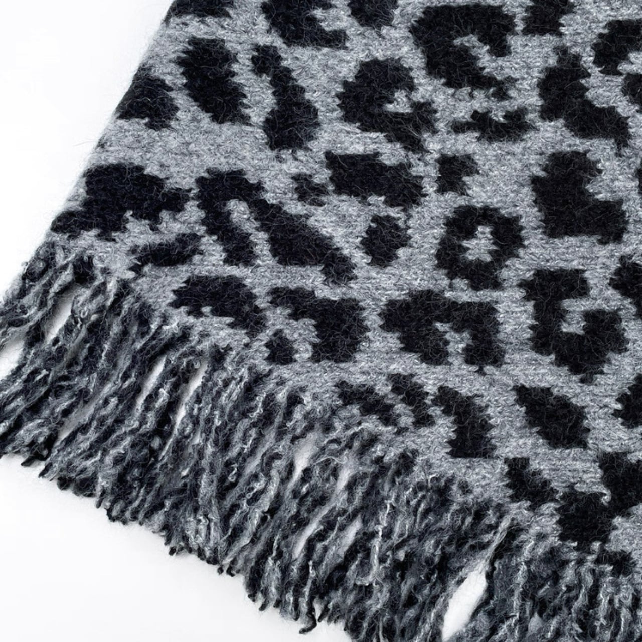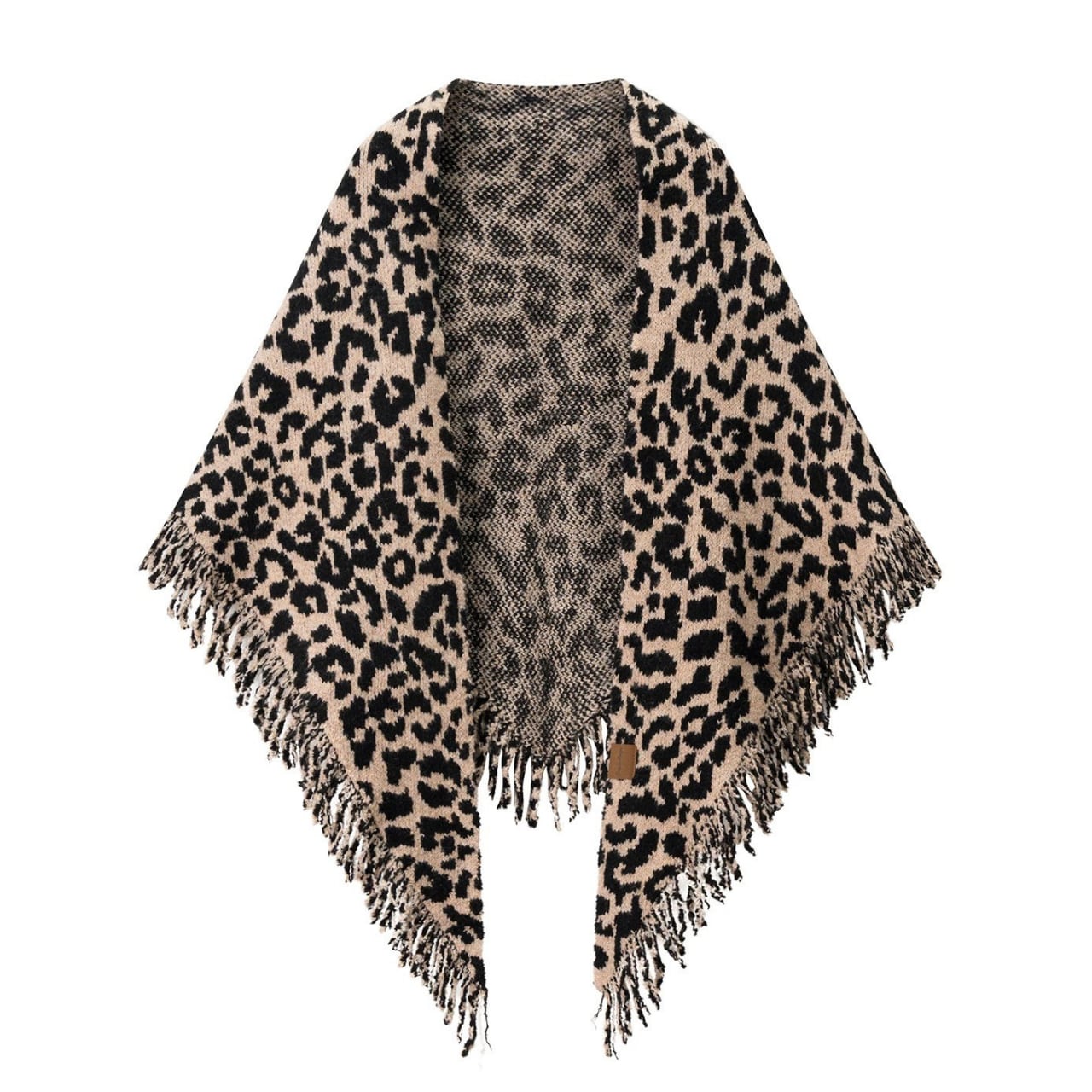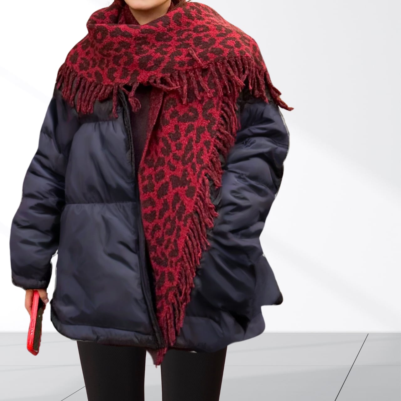 巻き方に悩まない三角形だからさっと巻くだけでスタイル完成。レオパードがシンプルコーデのアクセントに。