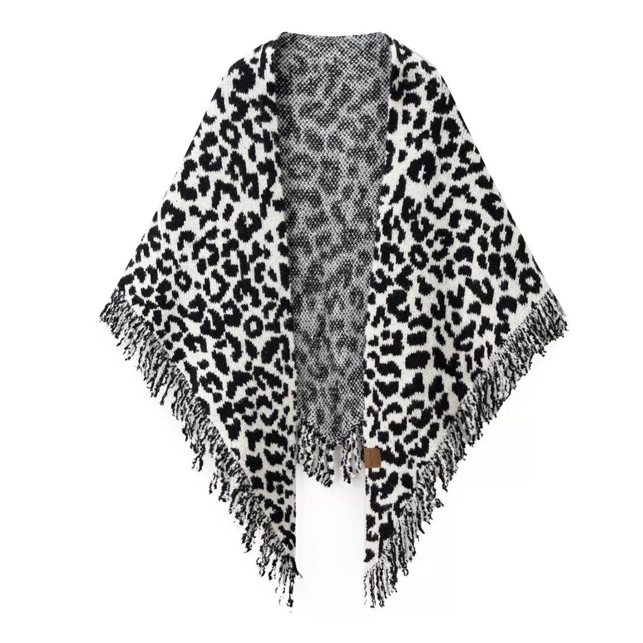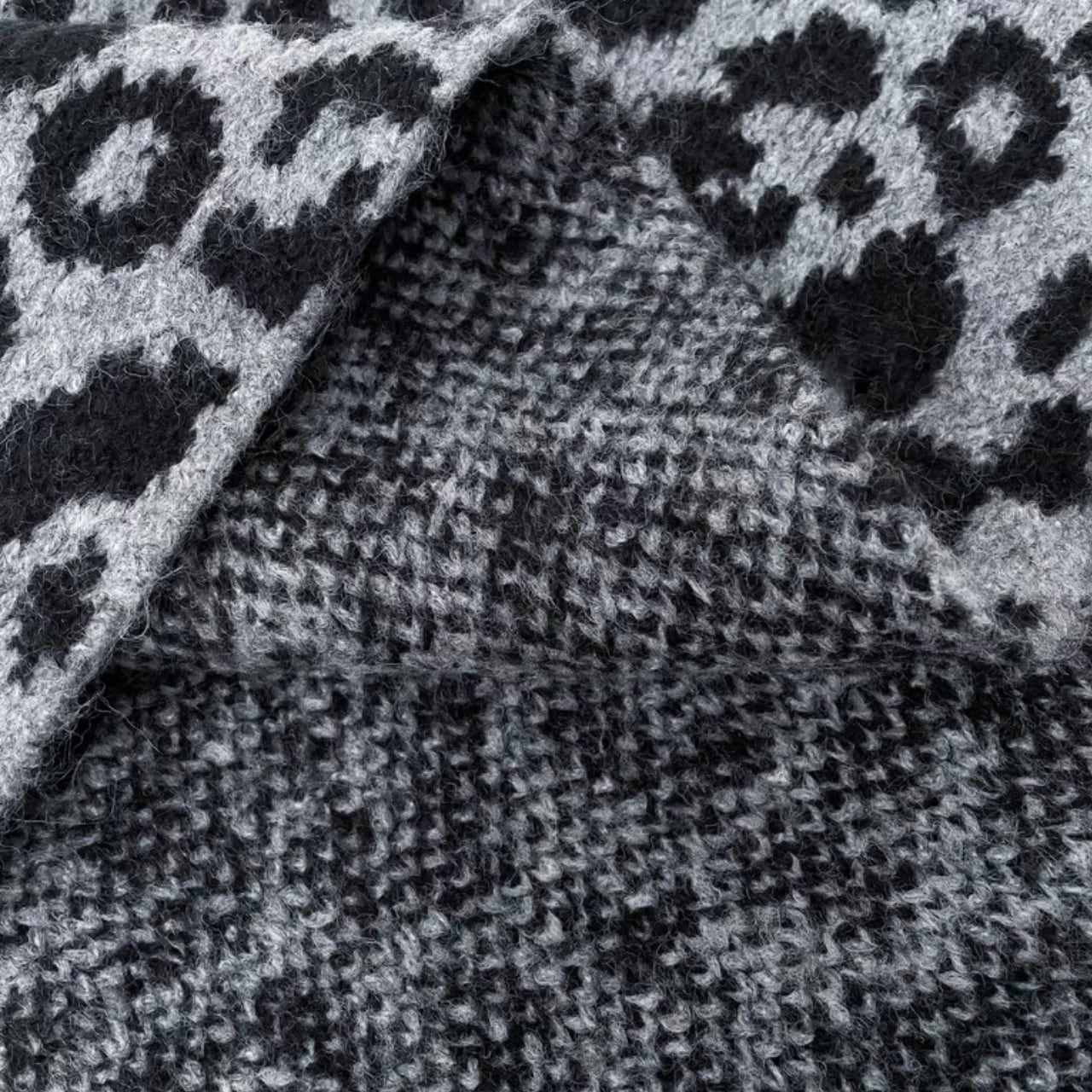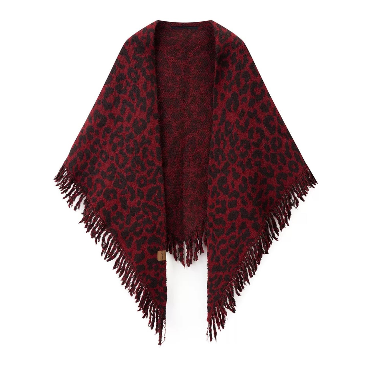 巻き方に悩まない三角形だからさっと巻くだけでスタイル完成。レオパードがシンプルコーデのアクセントに。