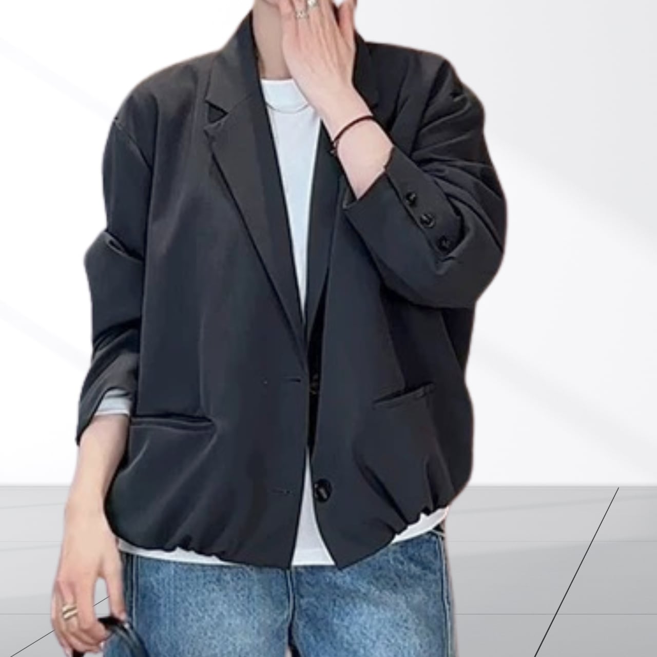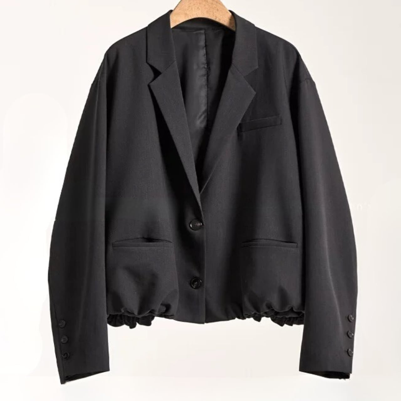 裾がギャザーになった立体感あるテーラードジャケット。遊び心あるデザインでカジュアルにも着こなせる1着。