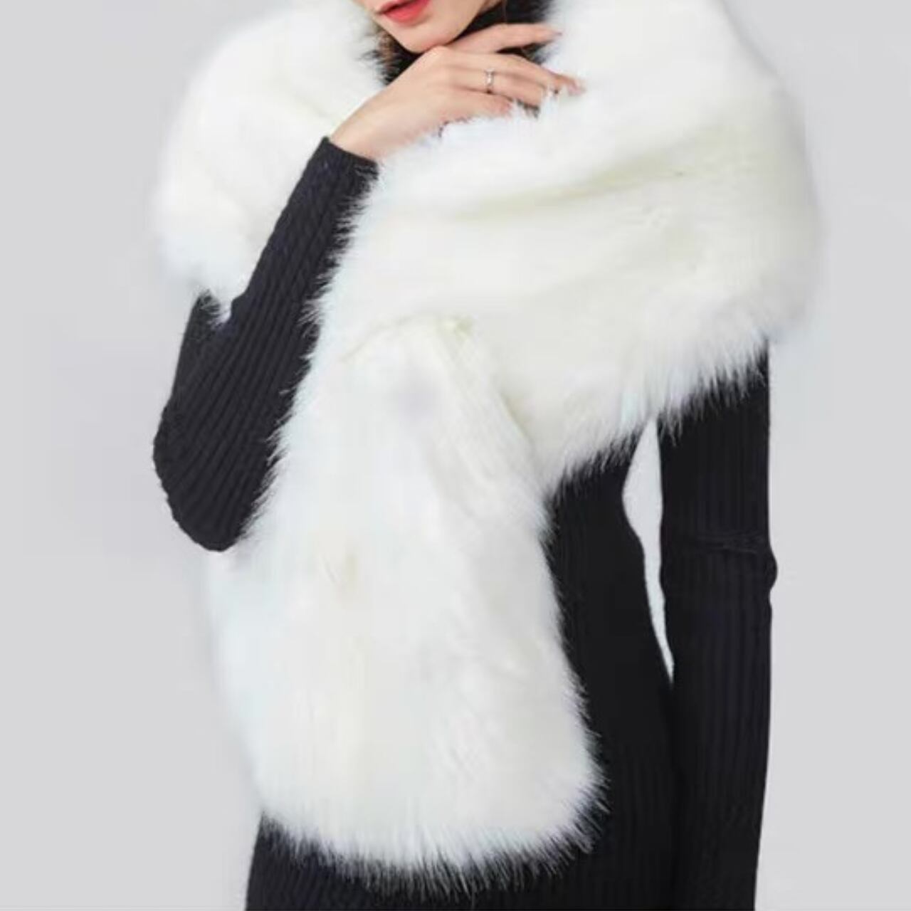 存在感抜群のファーショール。スリットに差し込んで着用も可能。コーディネートにアクセントと暖かさを加える冬のマストアイテム。