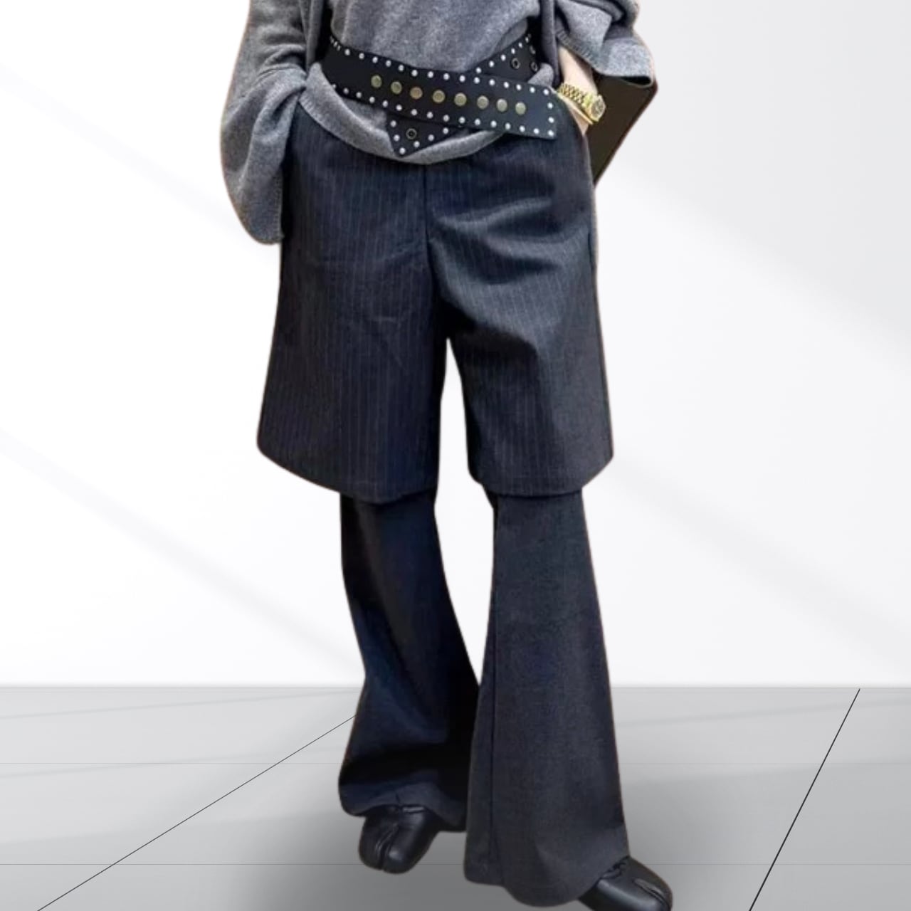 ハーフパンツとフレアパンツをレイヤードしたような1着。コーディネートにエッジを効かせる個性派パンツ。