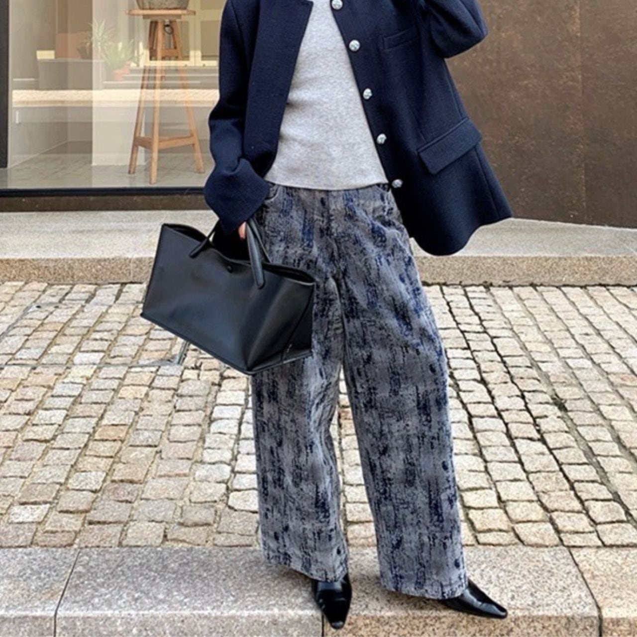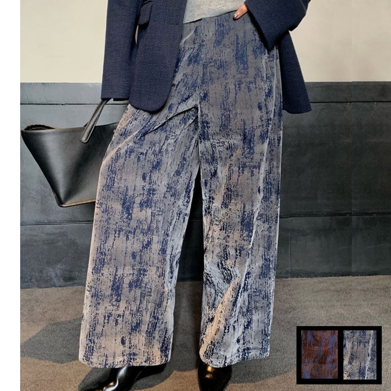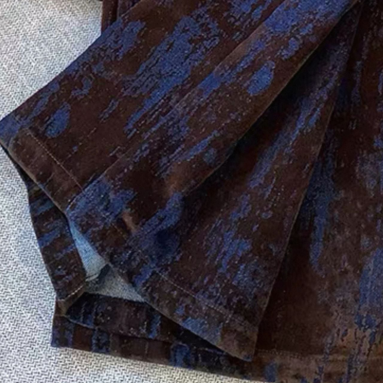 綿のデニムパンツの表面に加工が施されたデザインパンツ。トレンドカラーのブラウンとブルーが印象的。※加工には個体差があります。