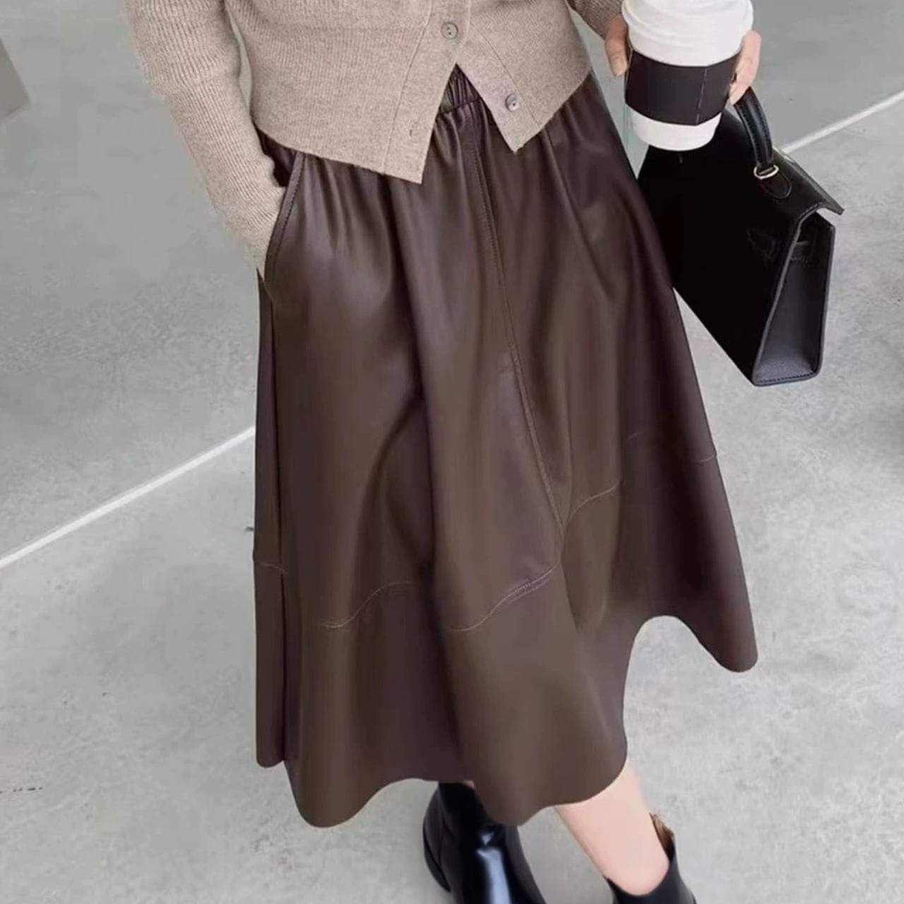 堅苦しさのないフェイクレザースカートは着回し力抜群。ポケットもついて実用性も◎※裾は切りっぱなしのデザインのため多少粗い仕上がりとなっています。デザイン上のものであり、不良品ではありません。気になる場合は購入前によくご検討ください。