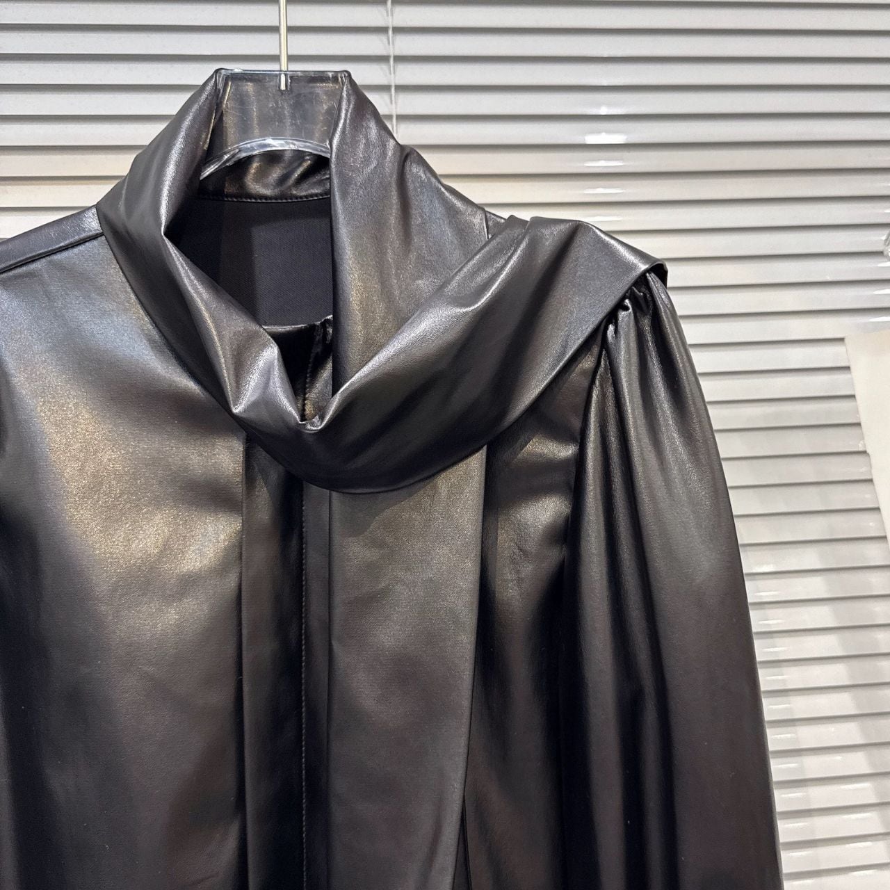ボウタイデザインに艶やかなエコレザー素材を掛け合わせた、洗練された一枚。モードな雰囲気を纏いながらも、着る人の個性を引き立てる大人のための主役シャツ。