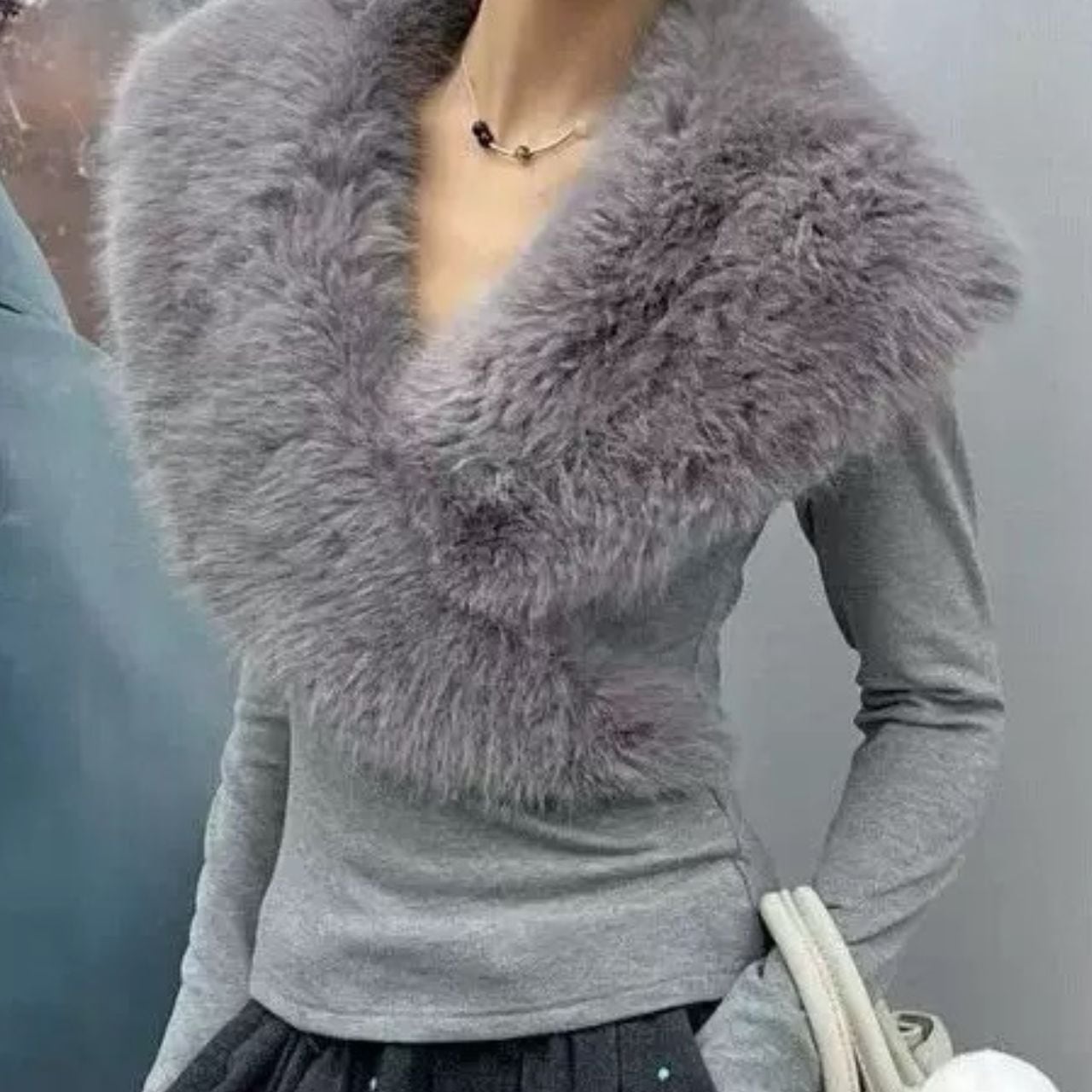 ビッグファーカラーVネックトップス 0535