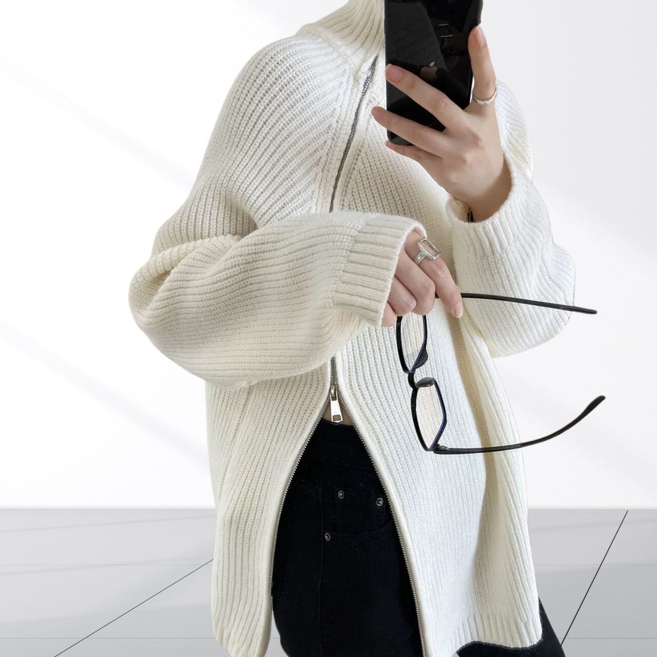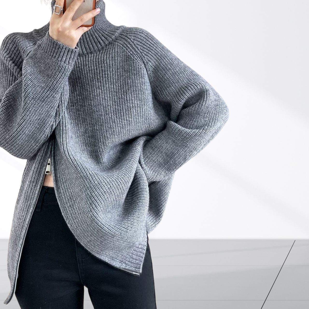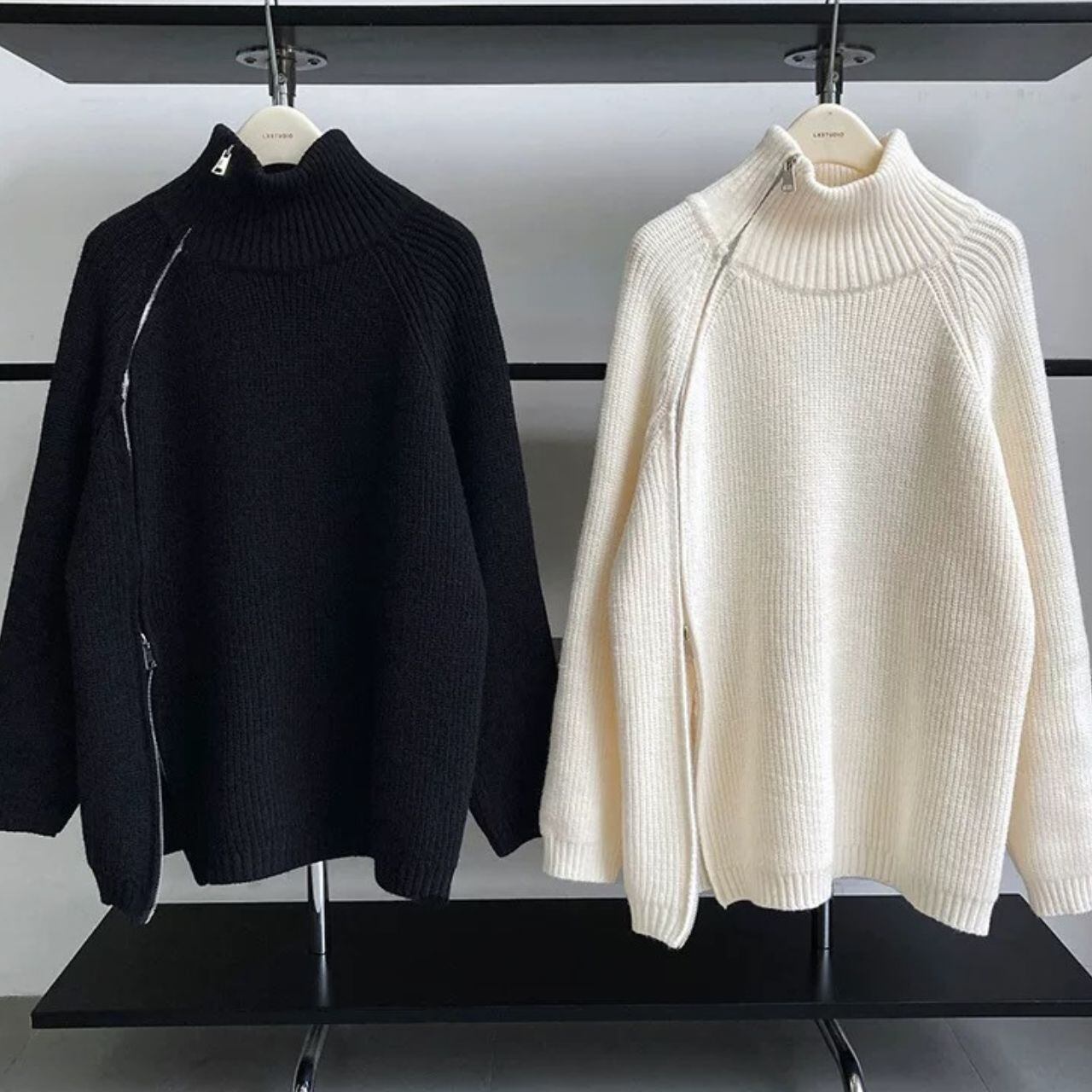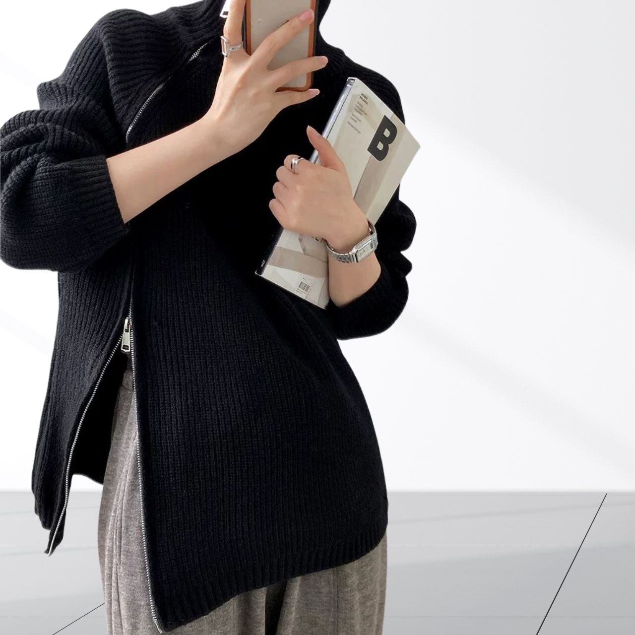 サイドのWジッパーを開けてインナーを見せれてこなれたレイヤードスタイルに。閉じればミニマルで洗練された雰囲気に。1枚で様々な表情を楽しめるデザインニット。