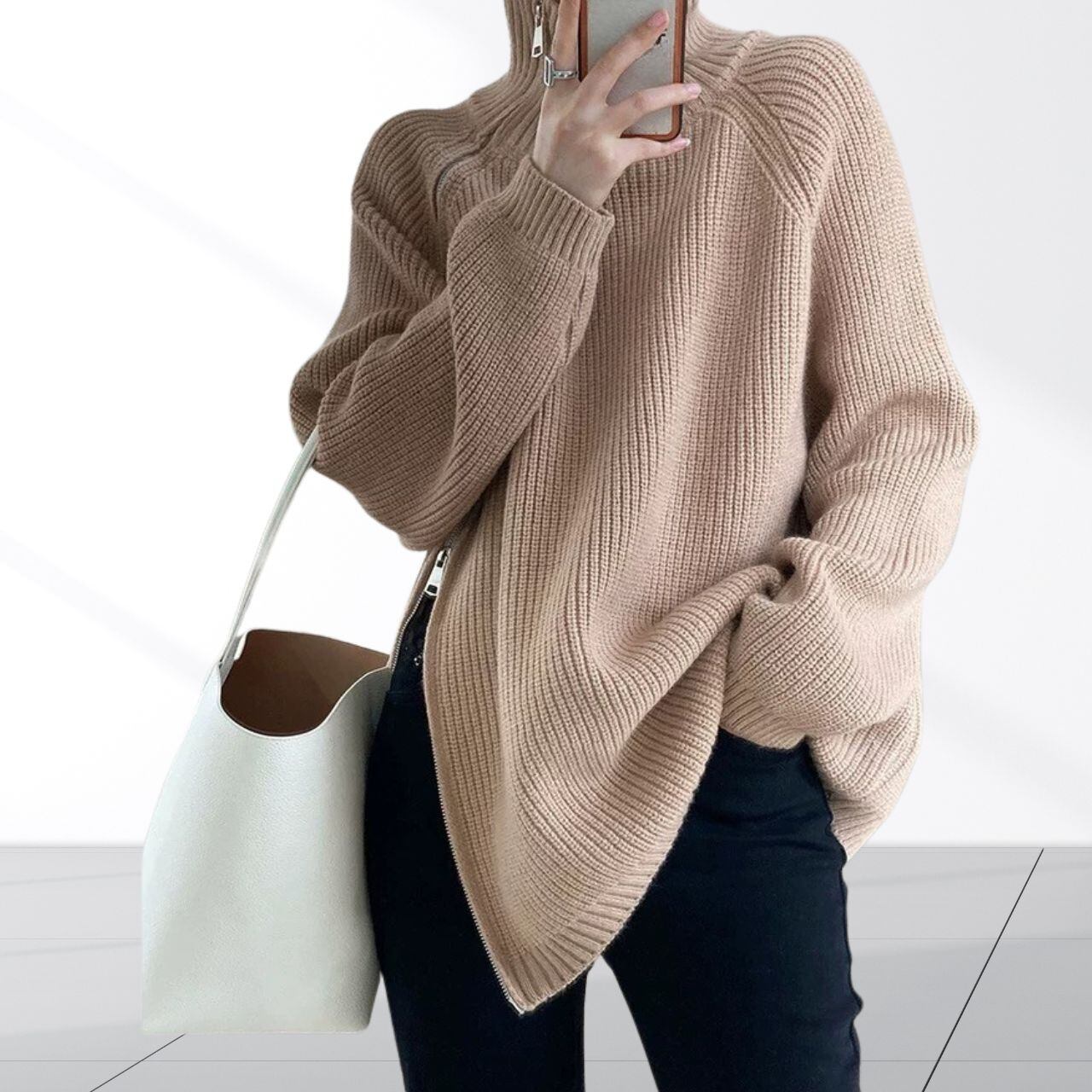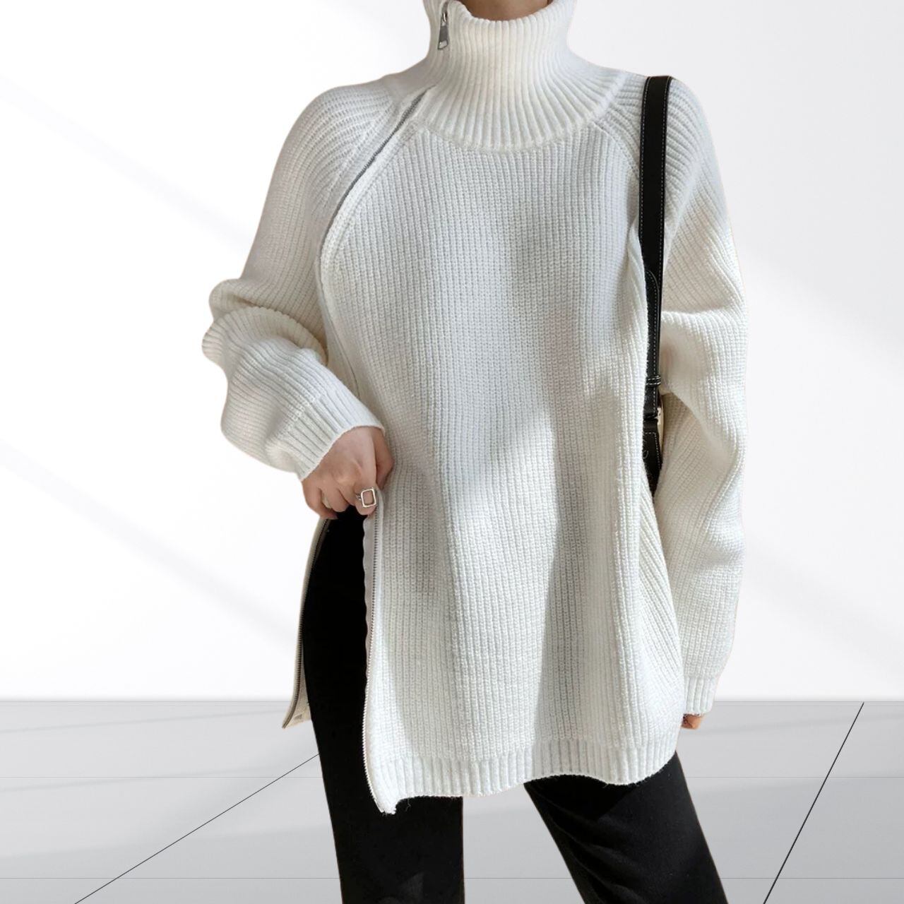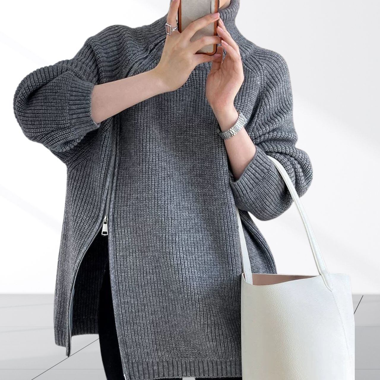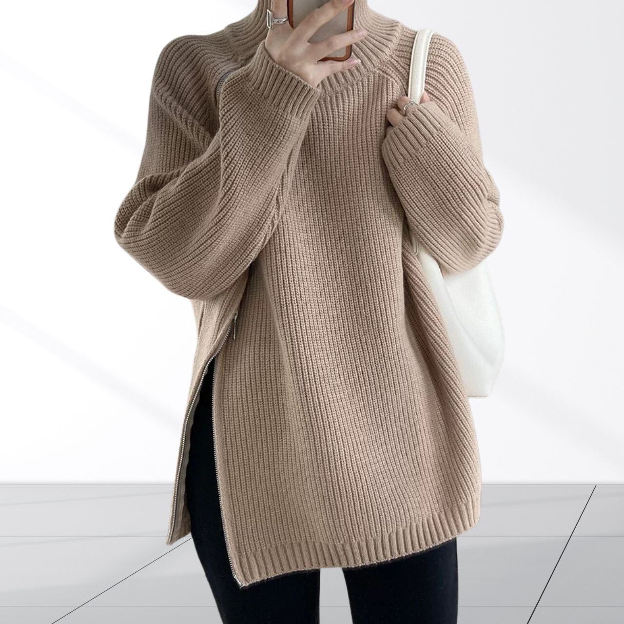 サイドのWジッパーを開けてインナーを見せれてこなれたレイヤードスタイルに。閉じればミニマルで洗練された雰囲気に。1枚で様々な表情を楽しめるデザインニット。