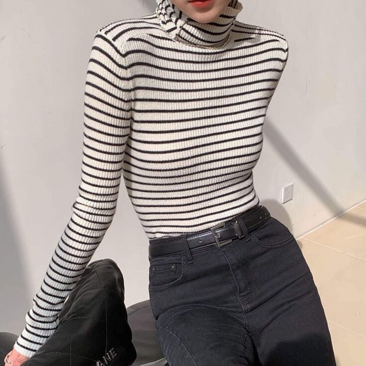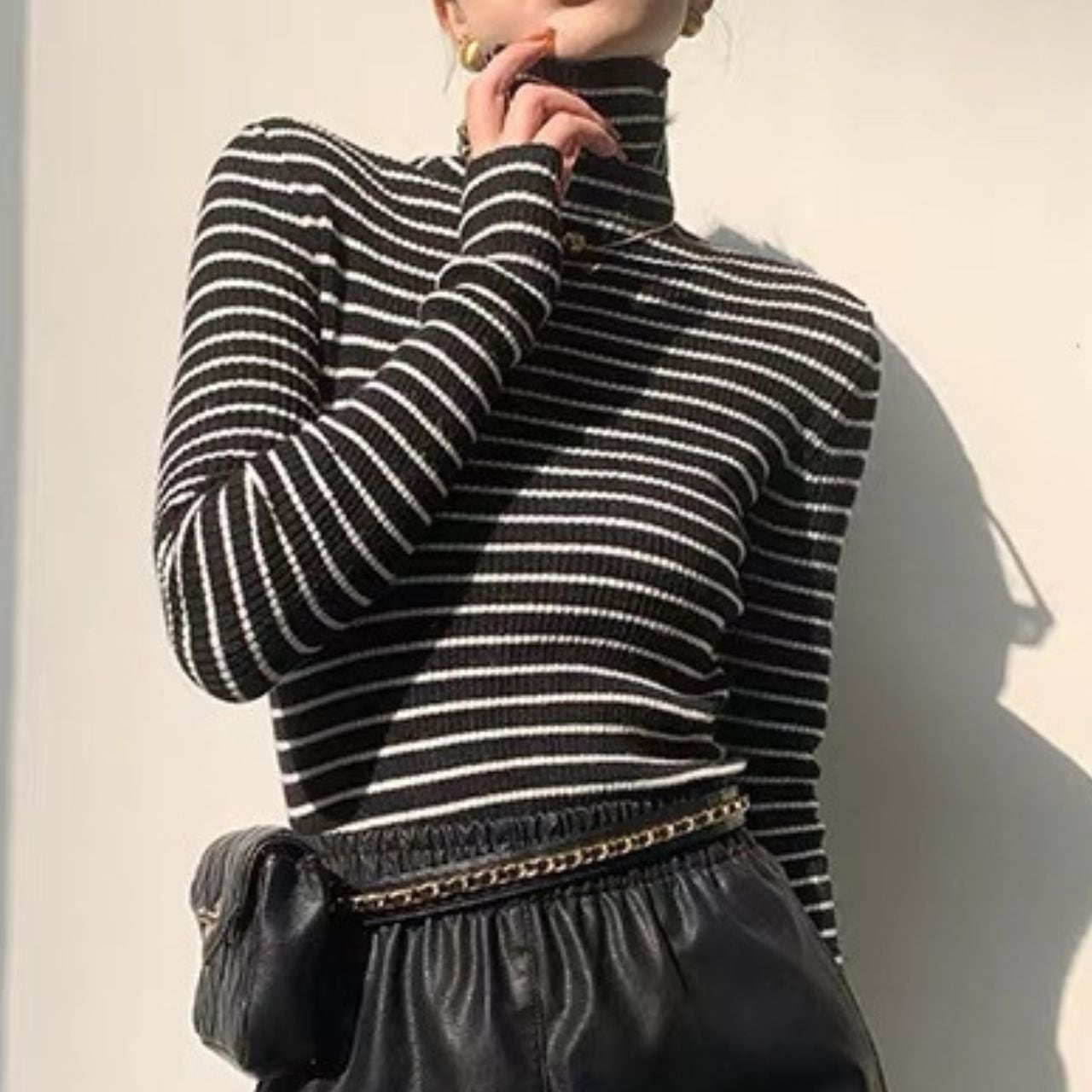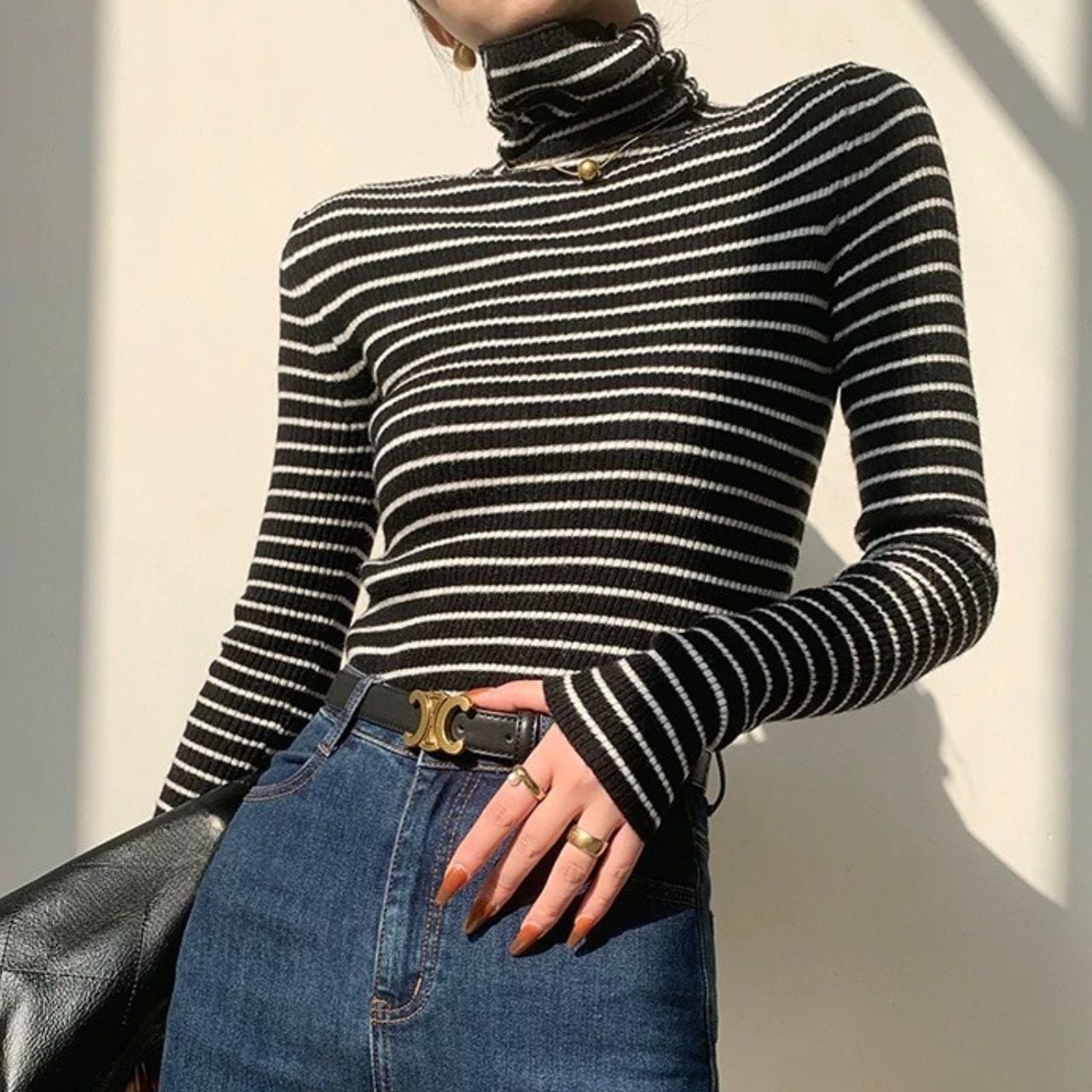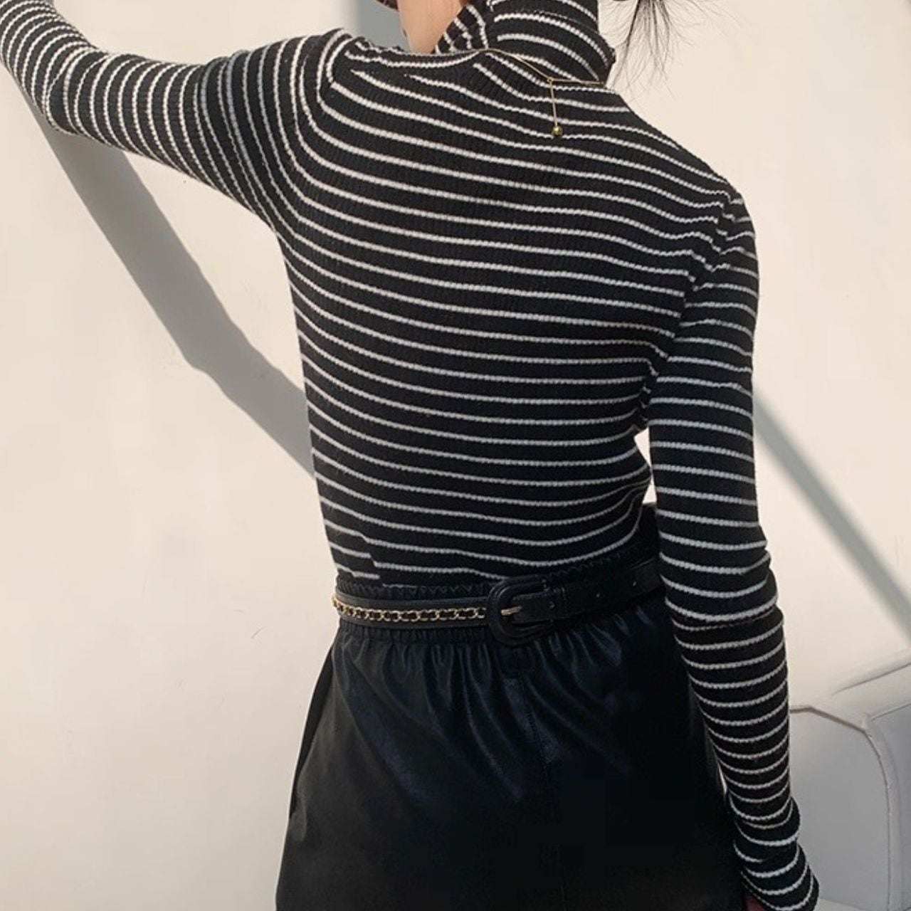 首元から手元までしっかりと覆うロングスリーブ仕様で、寒い季節もスタイリッシュに。モノトーンの細ボーダーが、コーデに程よいアクセントを添えてくれる1着。