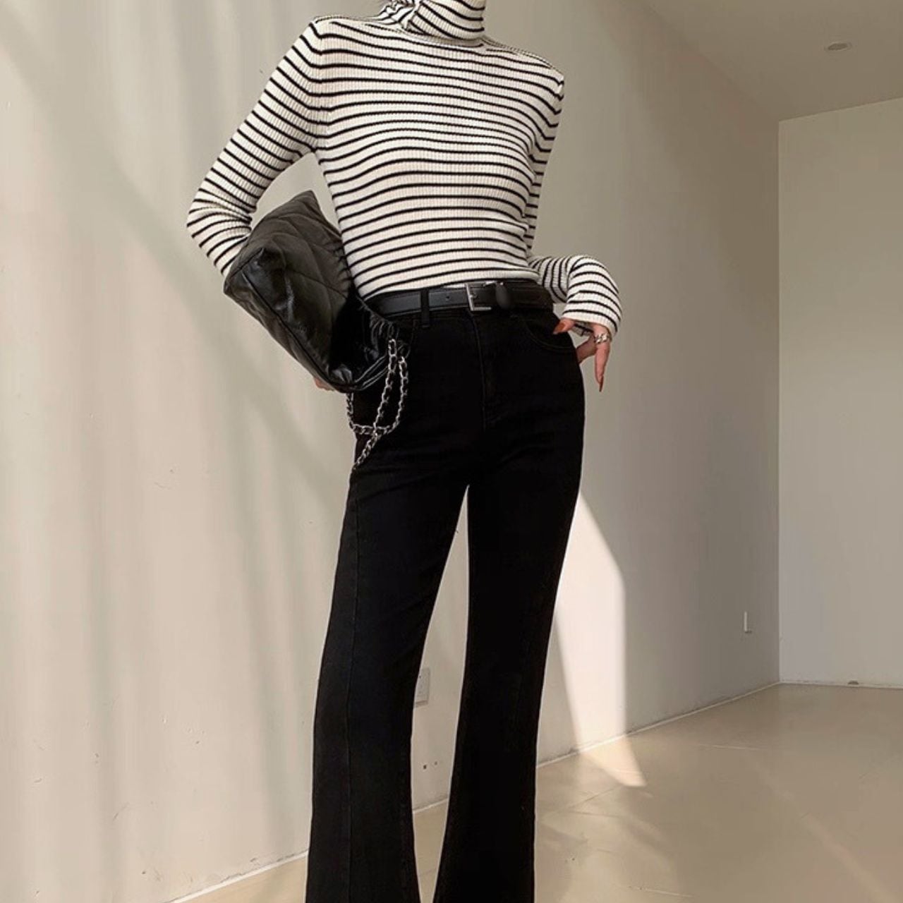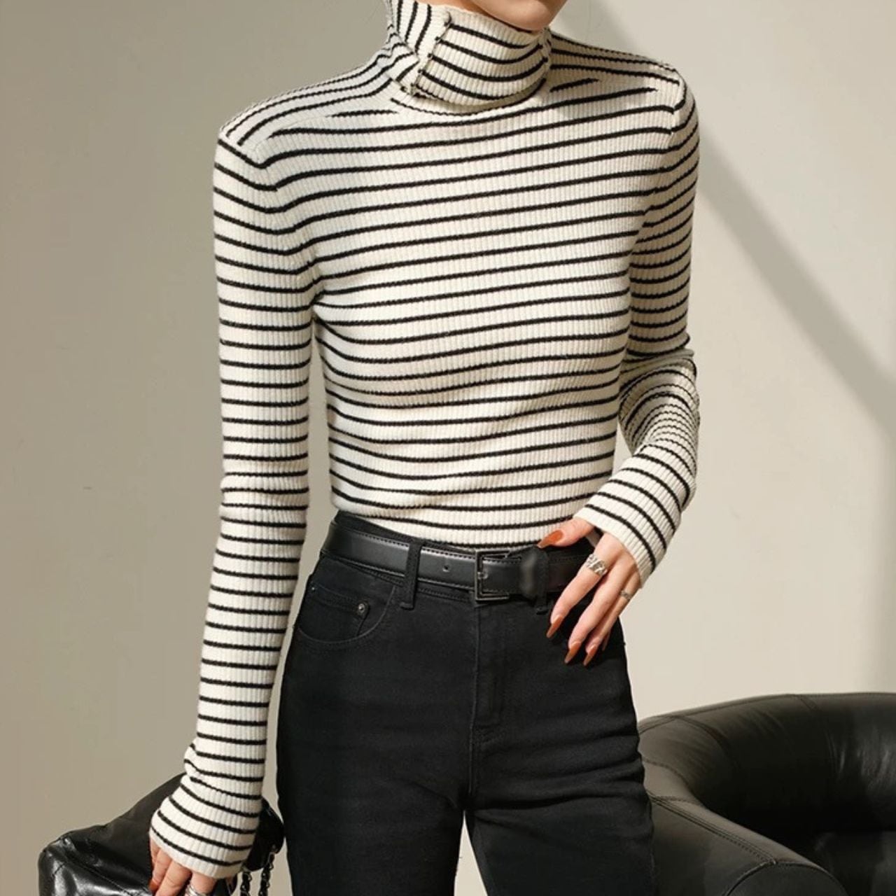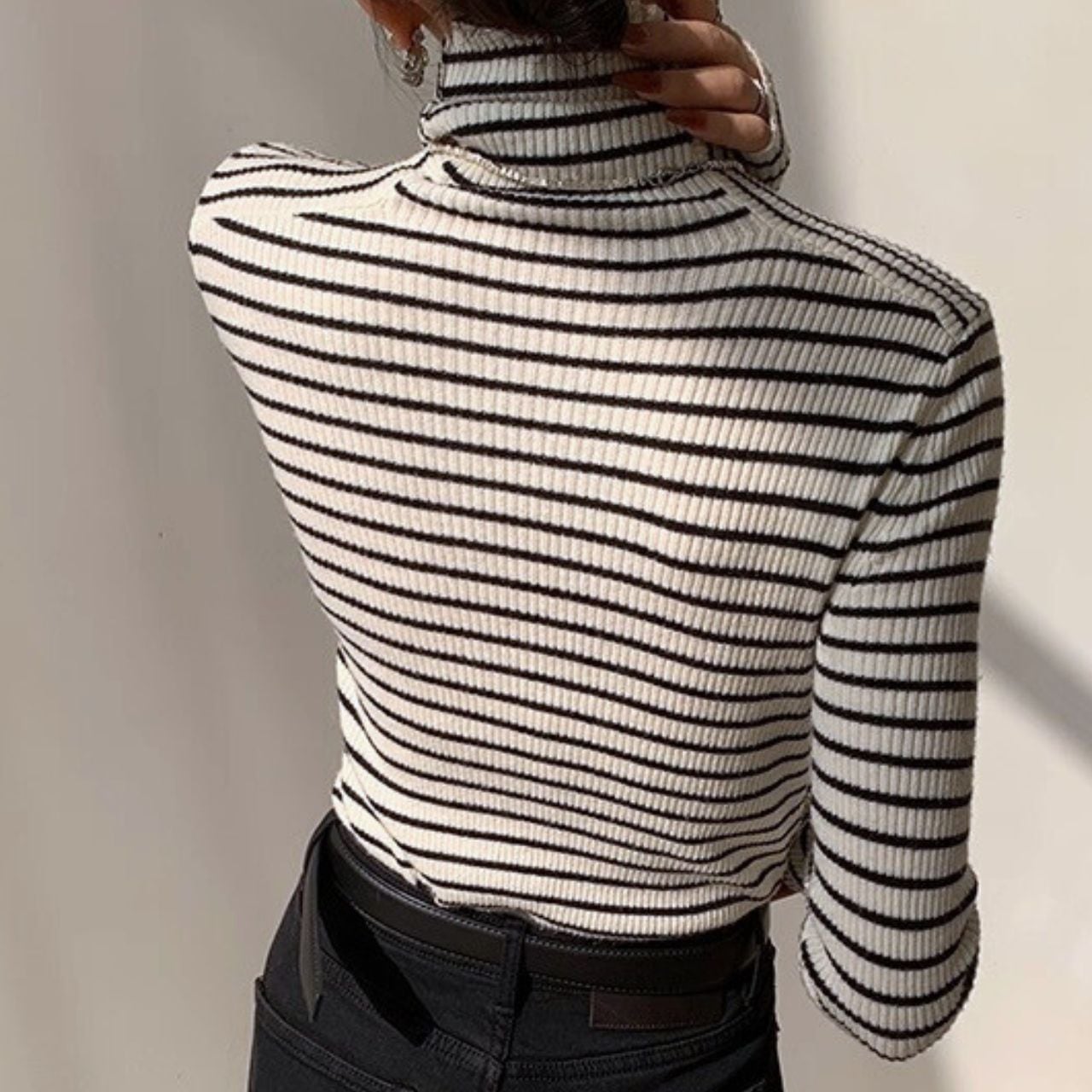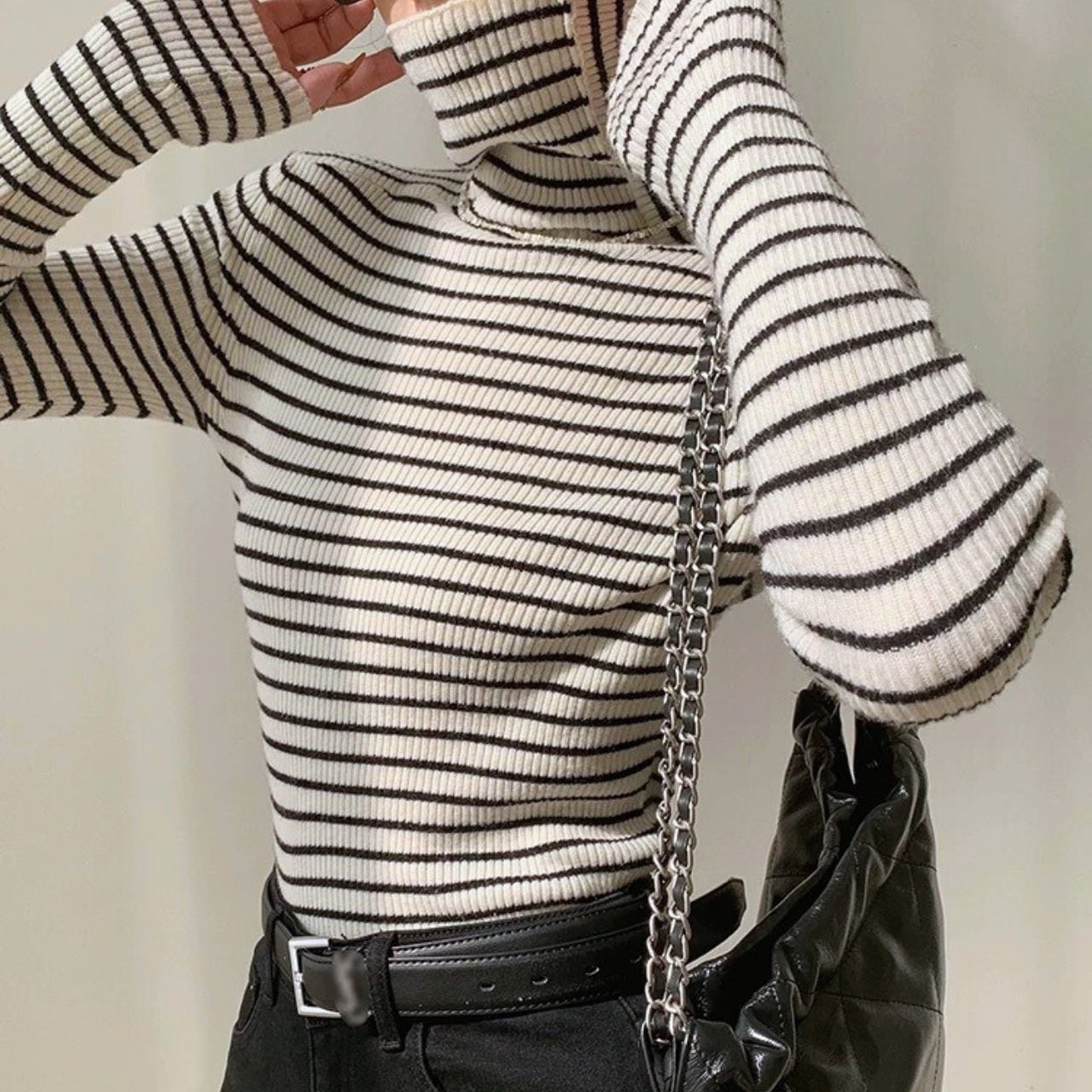 首元から手元までしっかりと覆うロングスリーブ仕様で、寒い季節もスタイリッシュに。モノトーンの細ボーダーが、コーデに程よいアクセントを添えてくれる1着。