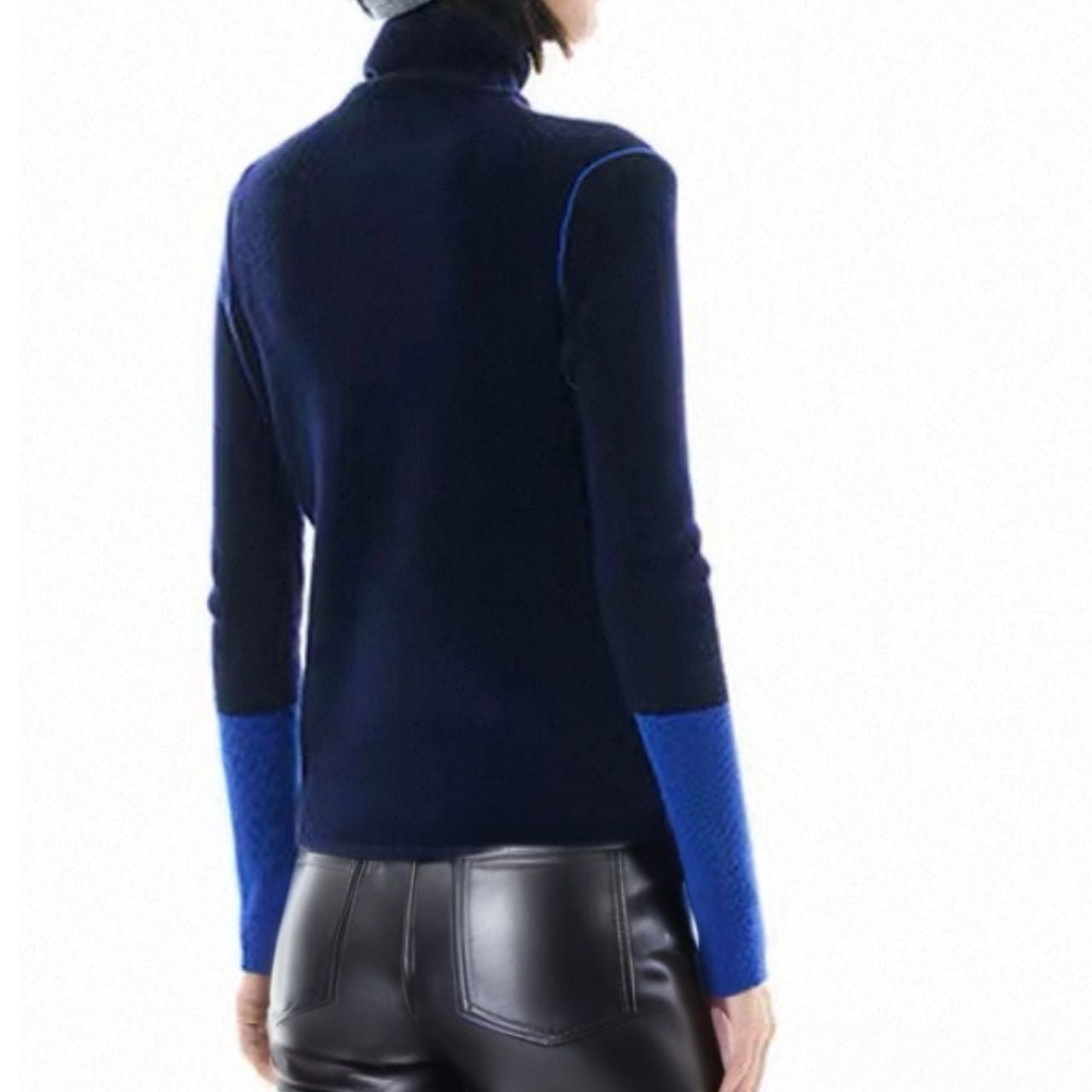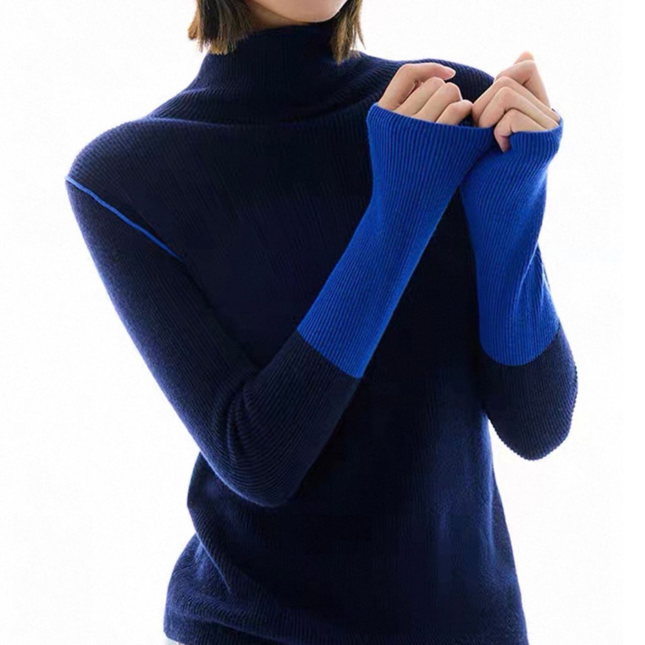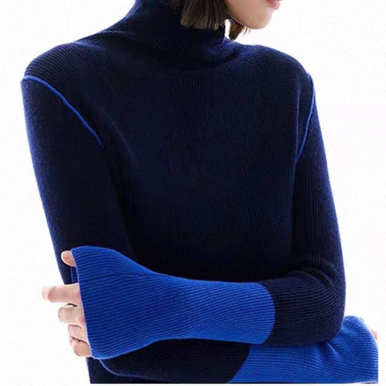 深みのあるネイビーに、鮮やかなブルーのスリーブが映えるハイネックニット。シンプルながらも存在感のある1着。