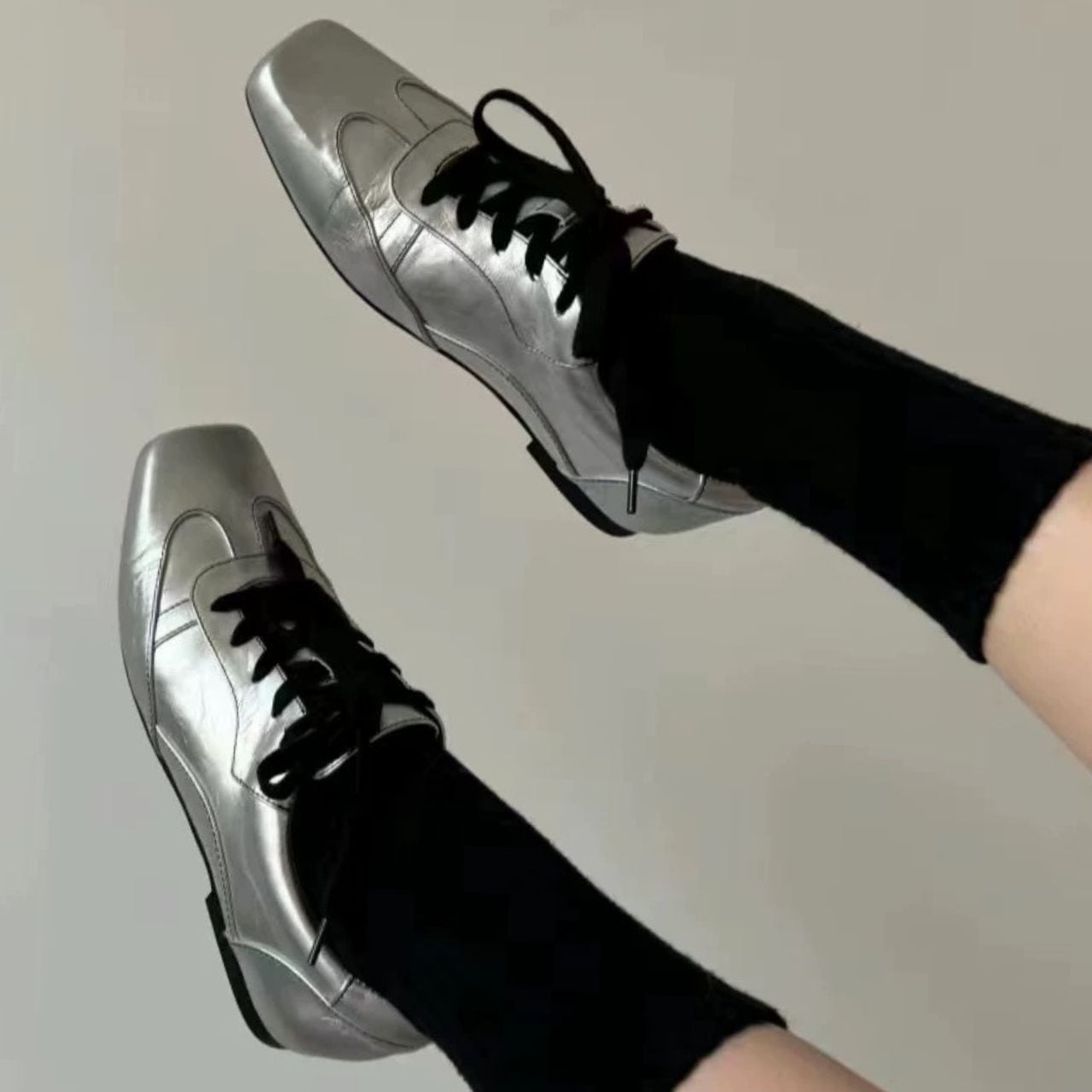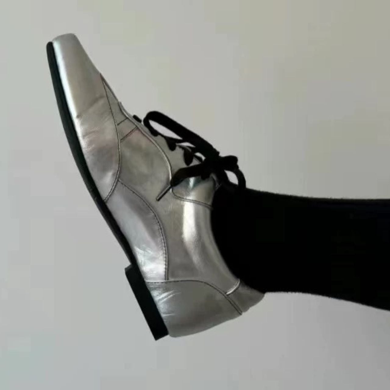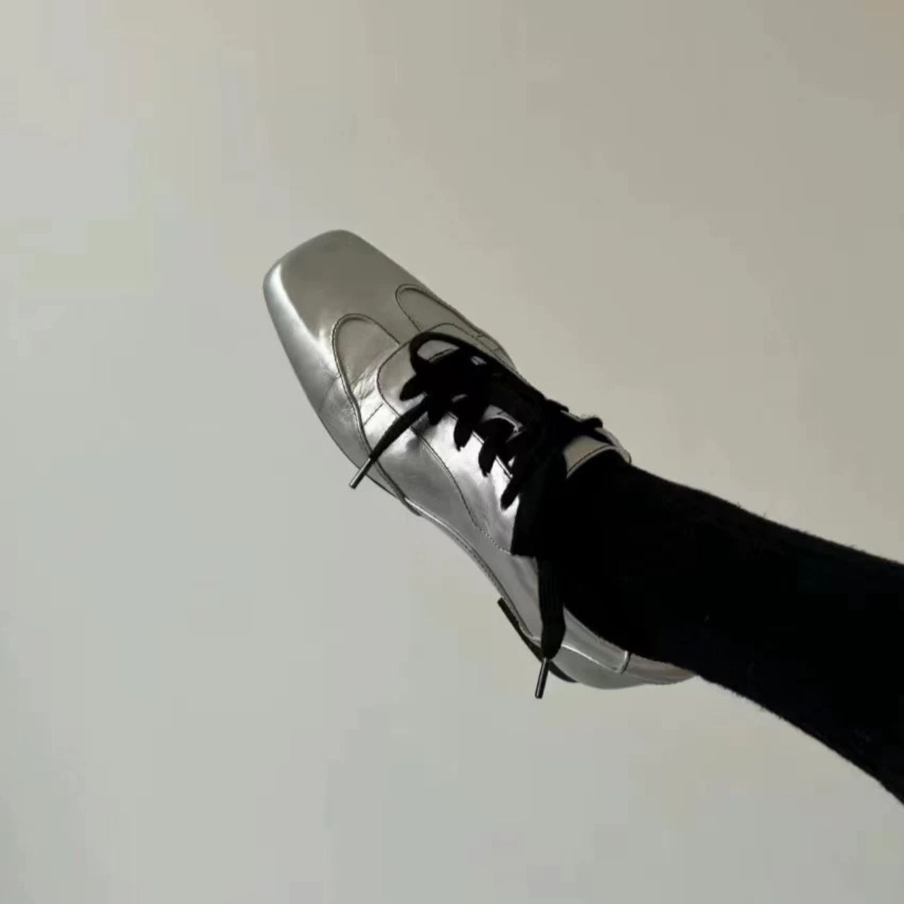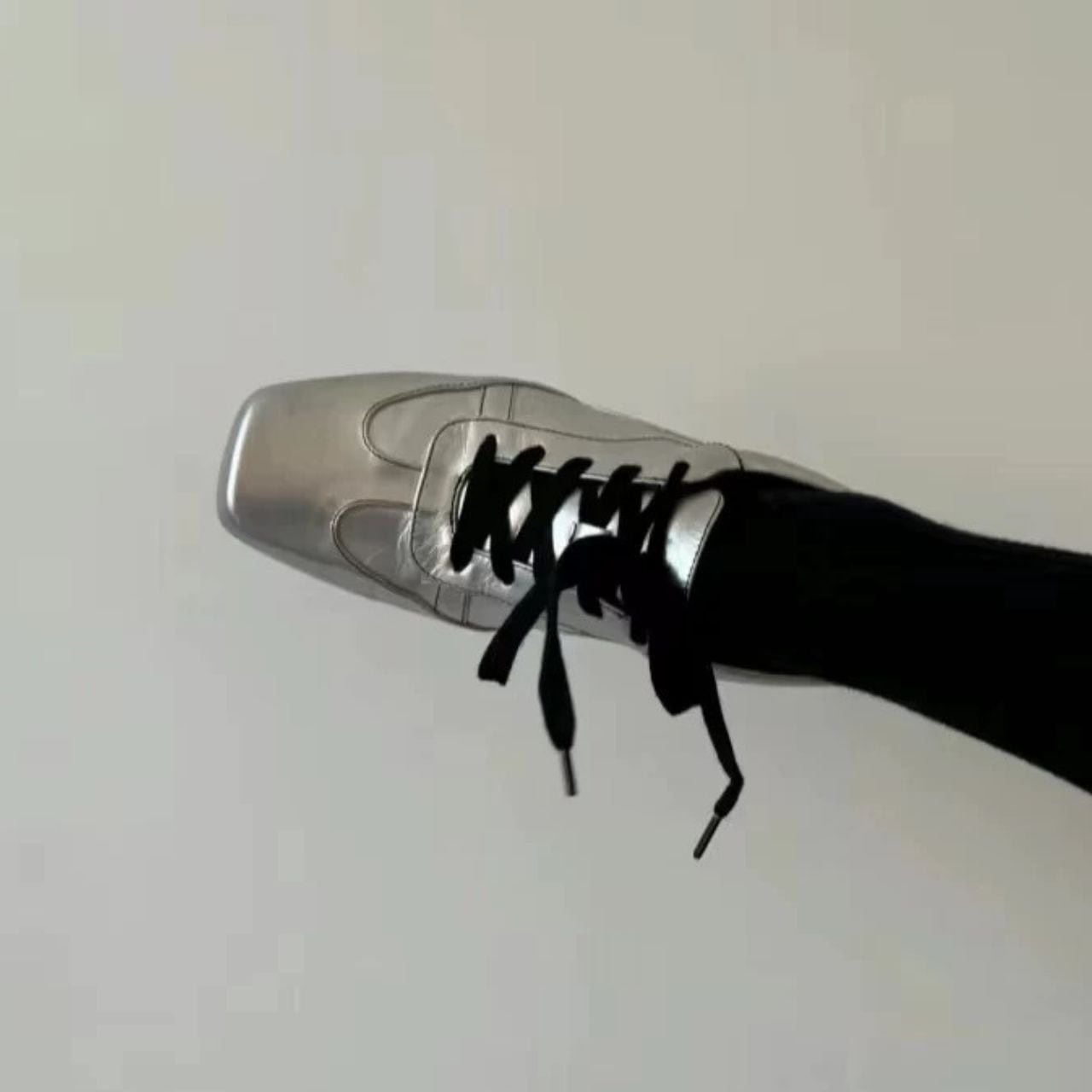 メタリックシルバーが放つ存在感。靴ひもの黒のアクセントでモードなエッジをプラスする1足。