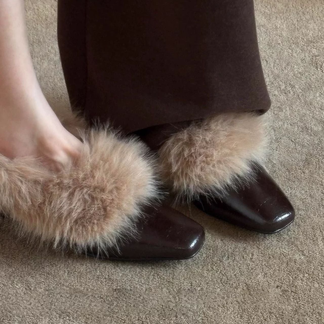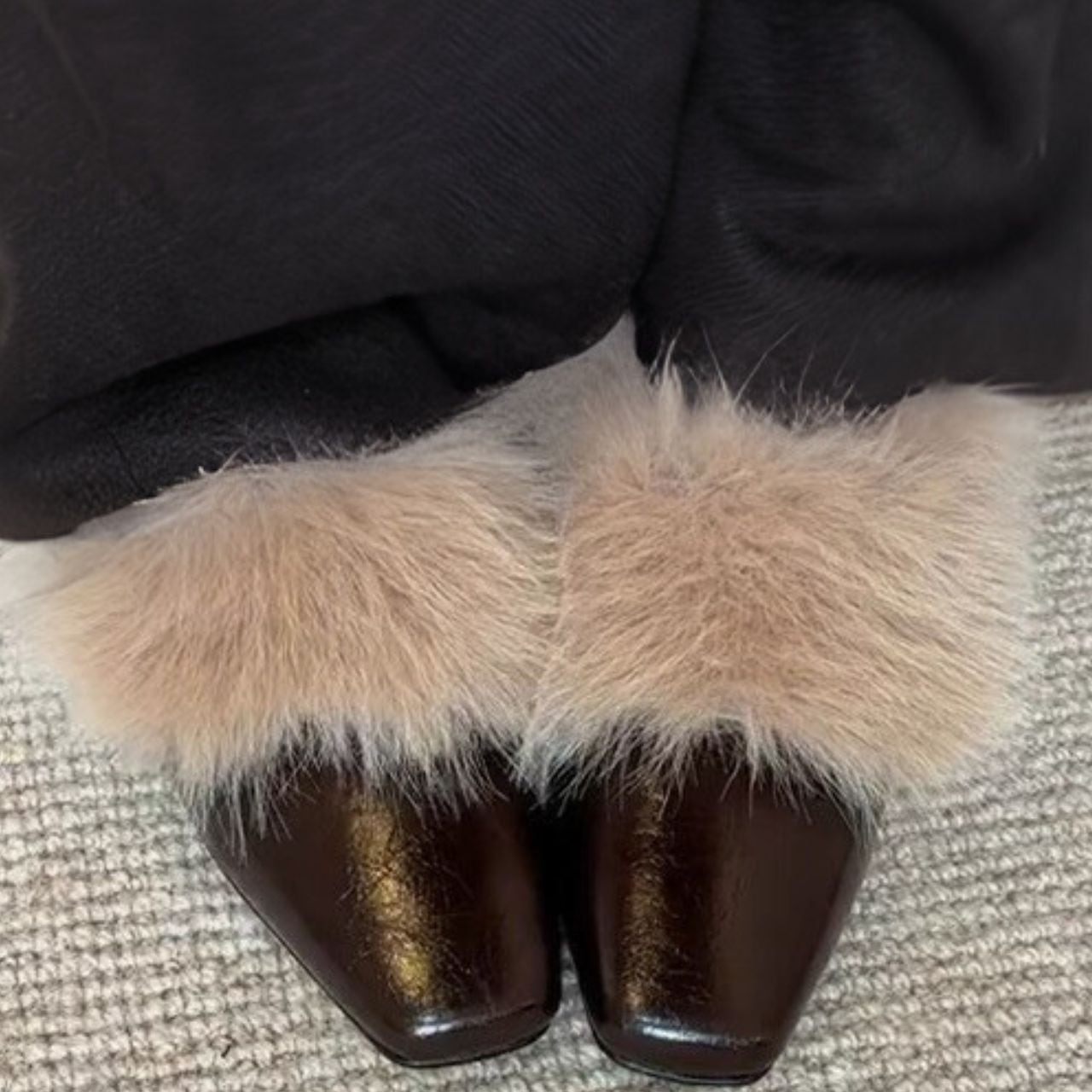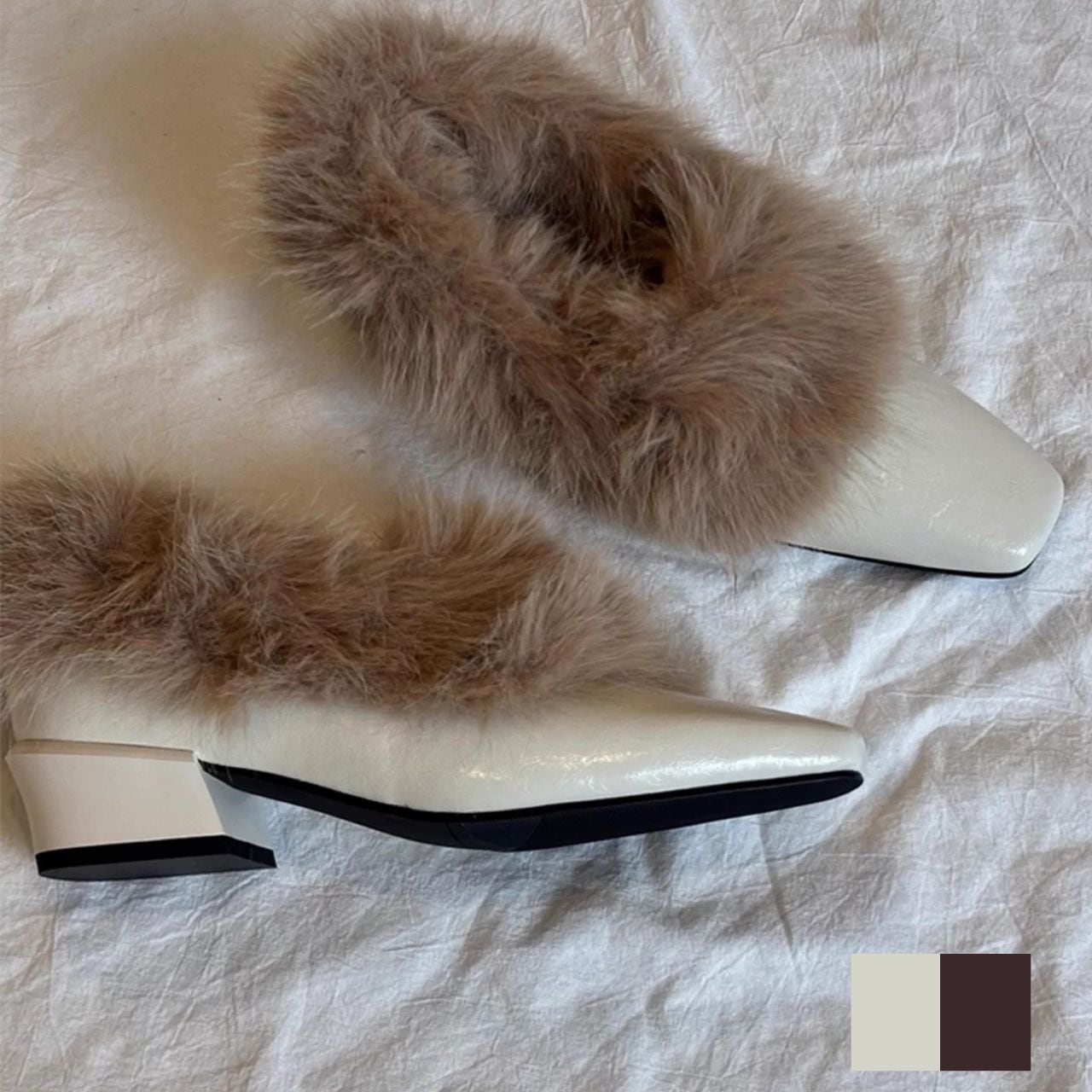 スクエアトゥに、フェイクファーをあしらった一足。モードな佇まいとトレンド感を足元にプラスしてくれるデザイン。