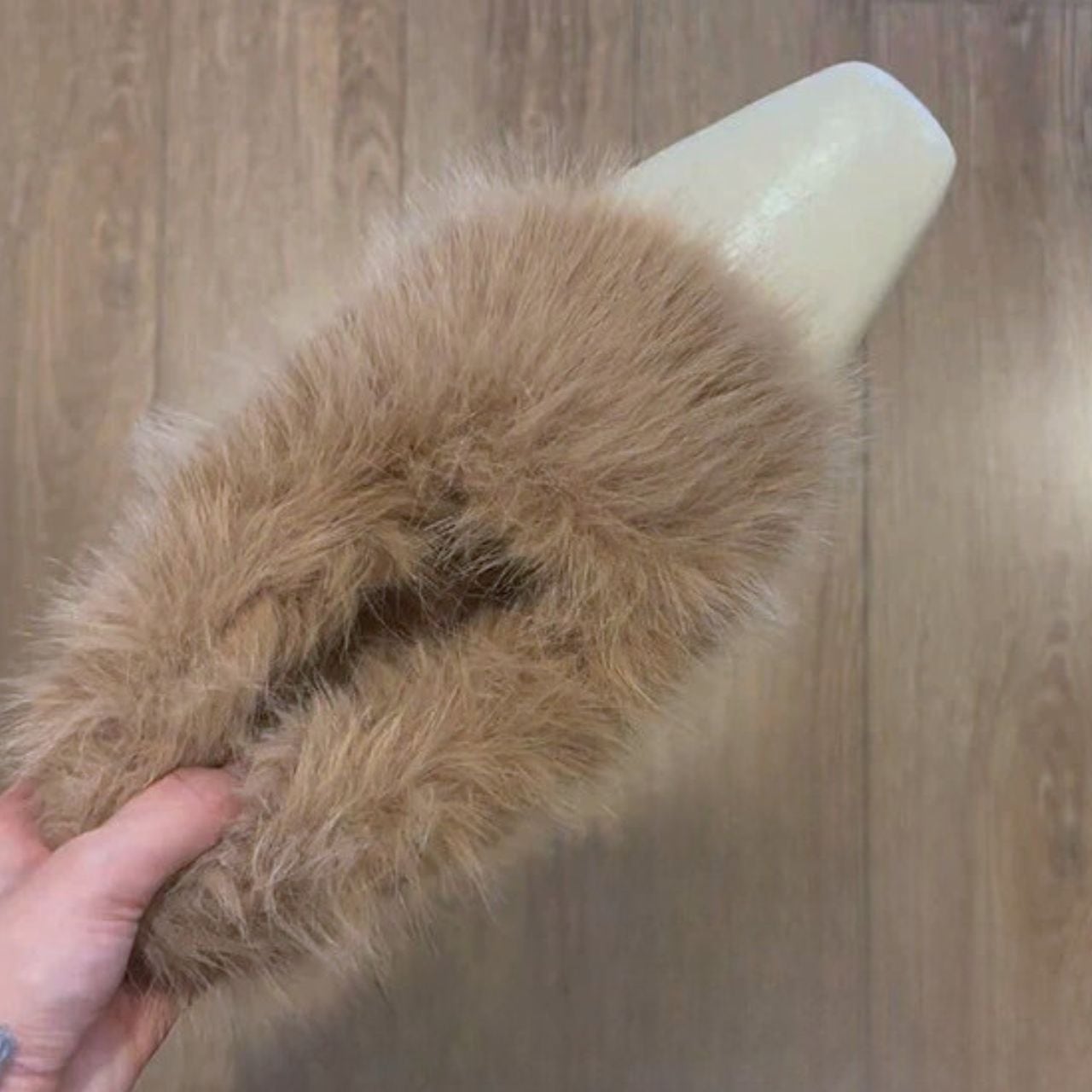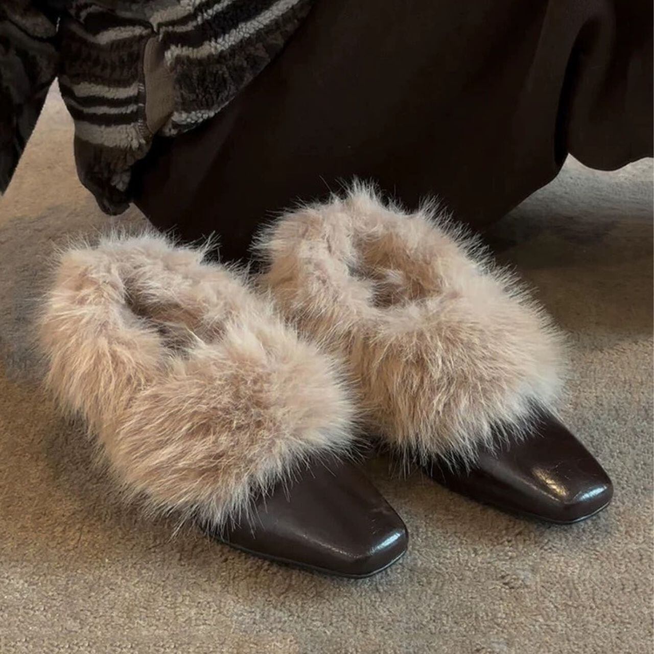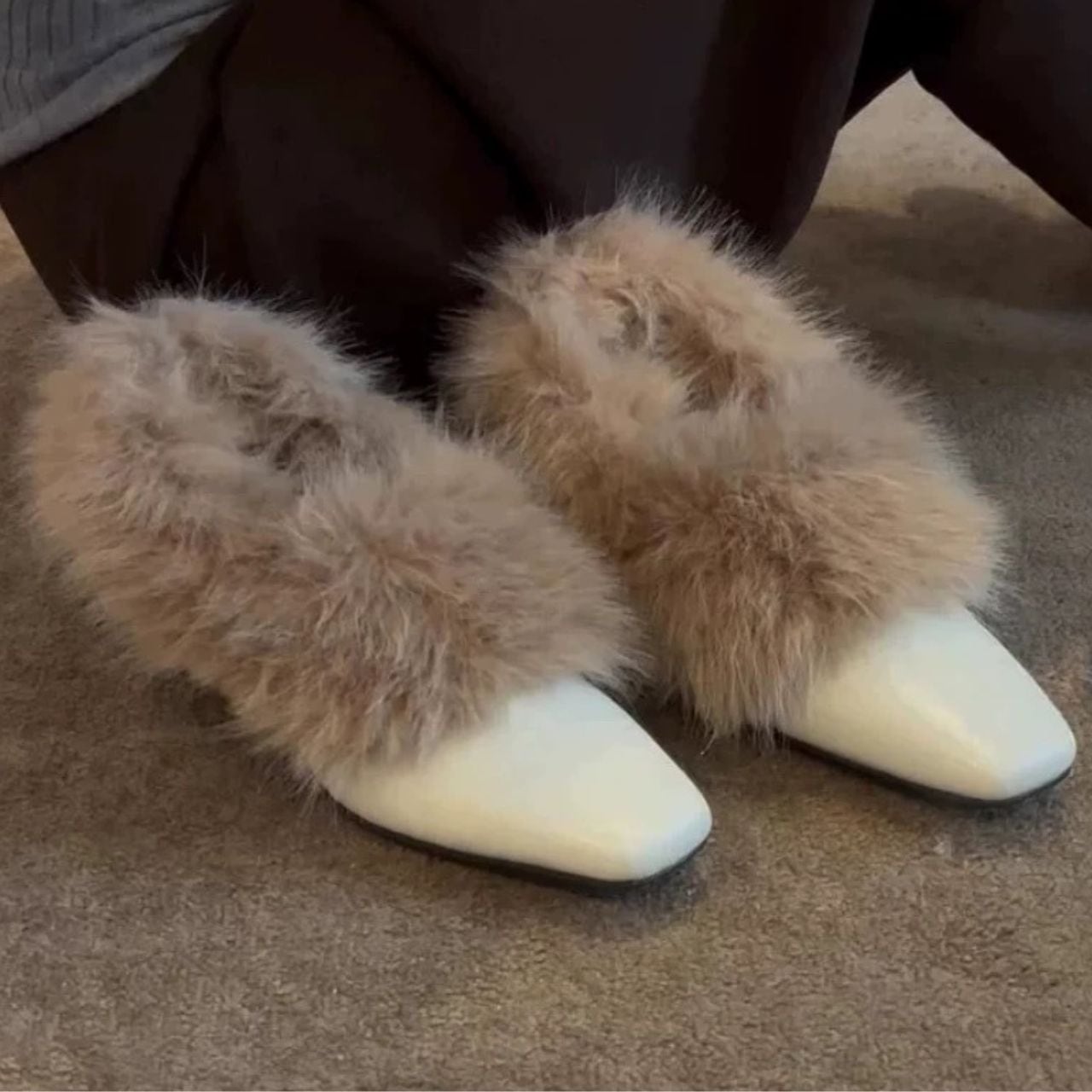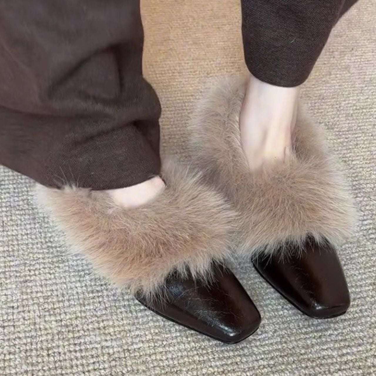 スクエアトゥに、フェイクファーをあしらった一足。モードな佇まいとトレンド感を足元にプラスしてくれるデザイン。