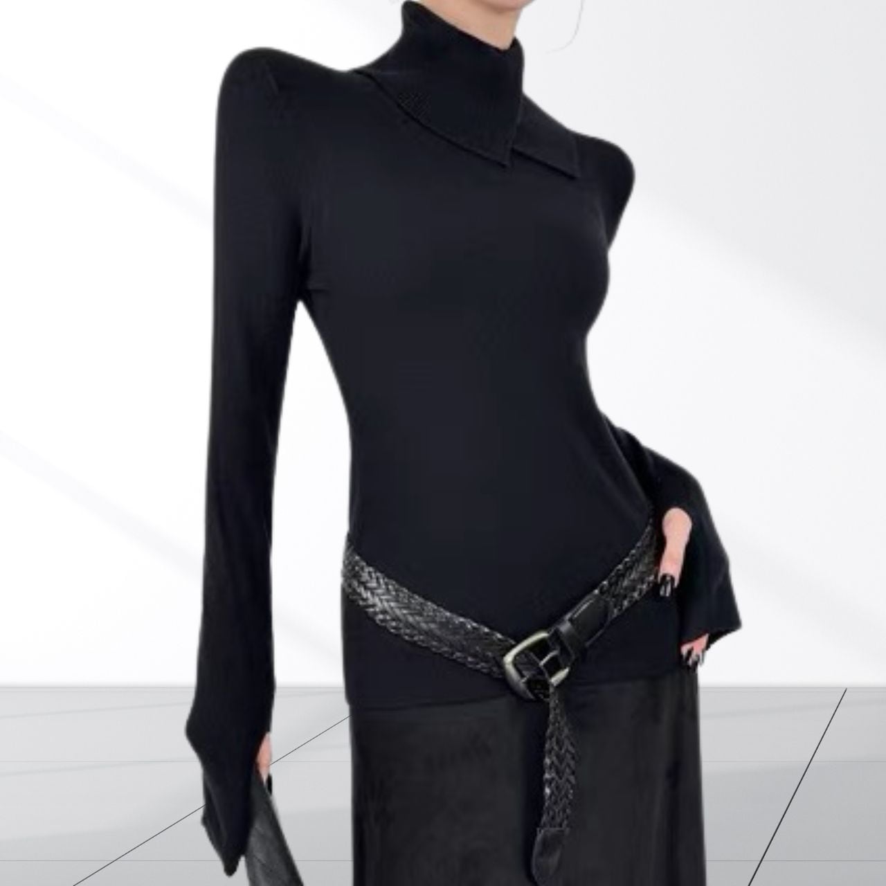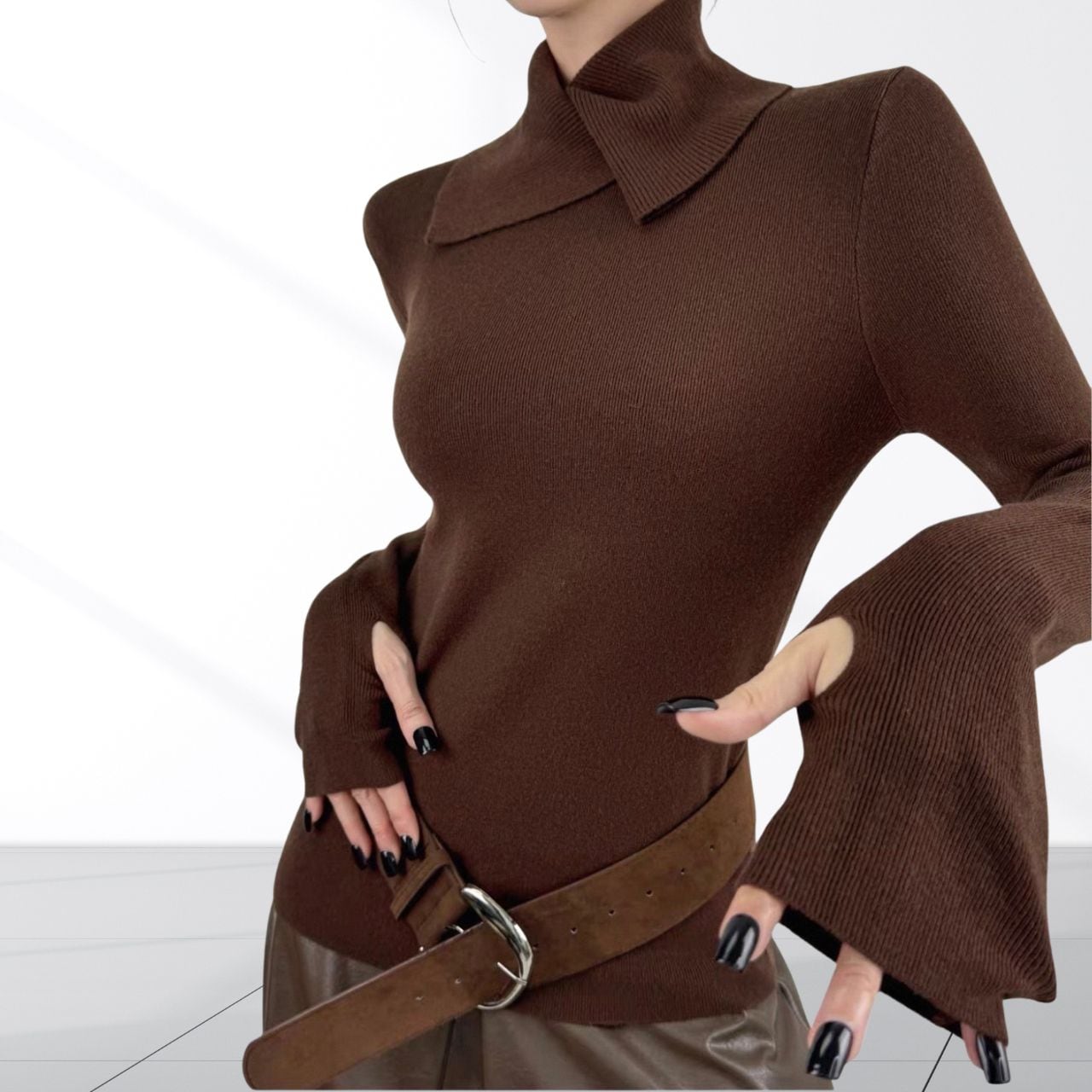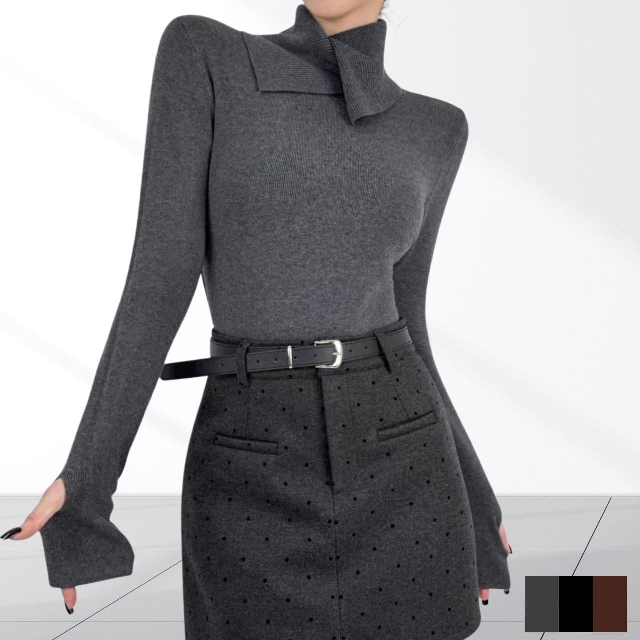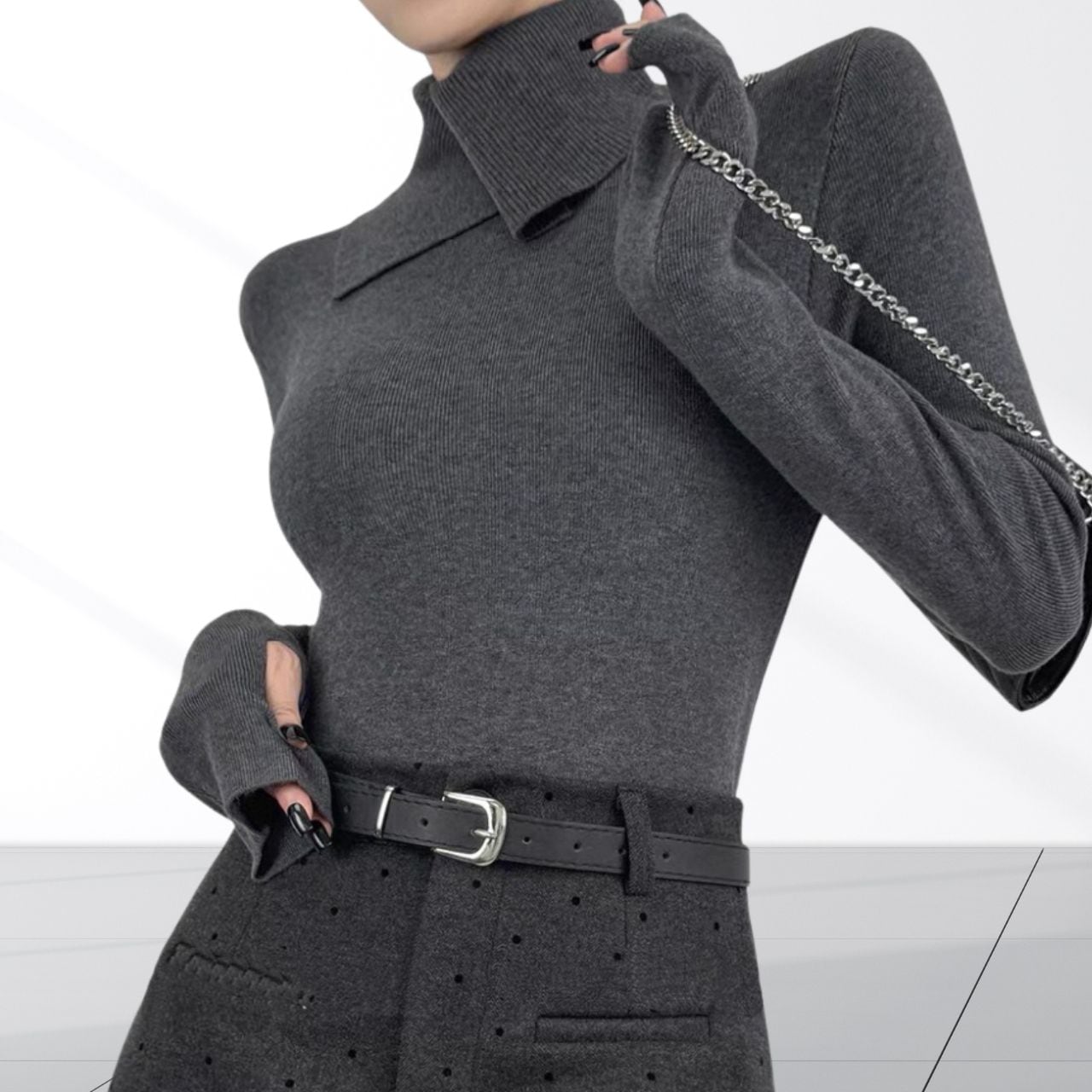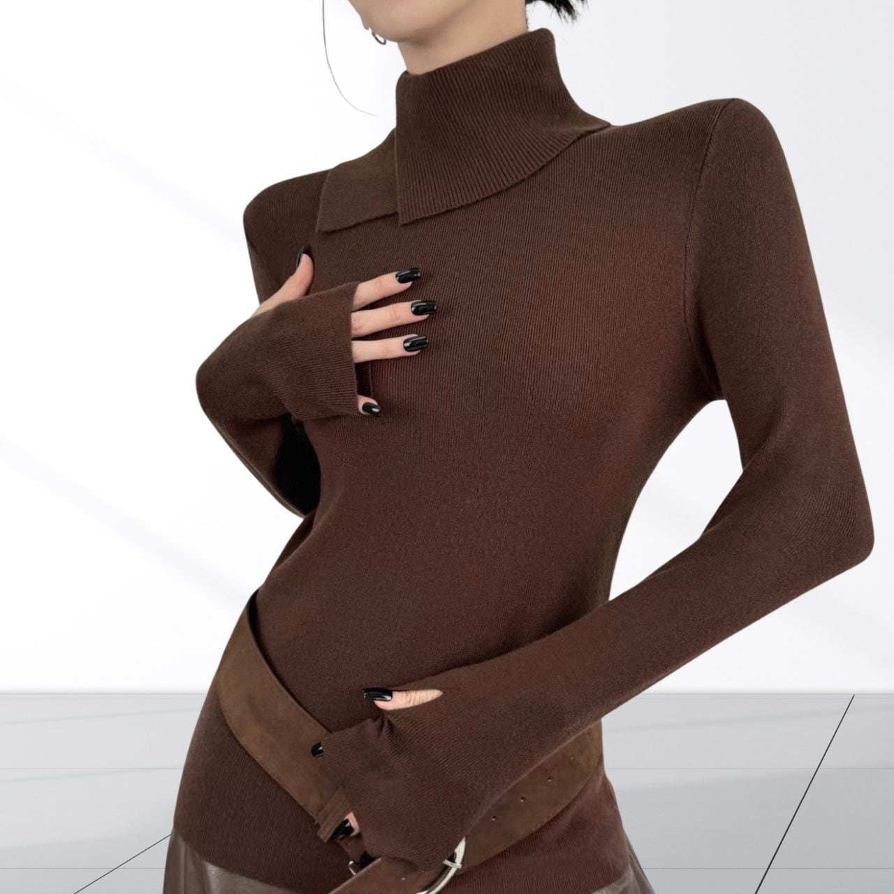 立体的なネックデザインが首元にアクセントを加えるニットトップス。袖口には指穴を備え手の甲までしっかりカバー。デザイン性と防寒性を兼ね備え、首まわりと手元を同時に暖かく保てるのがポイント。