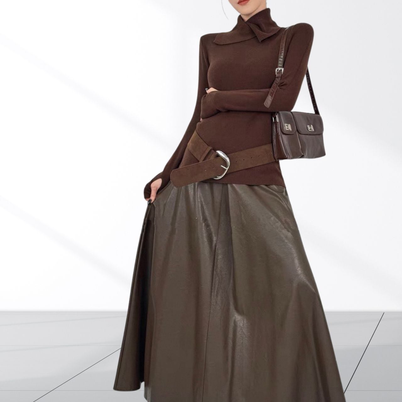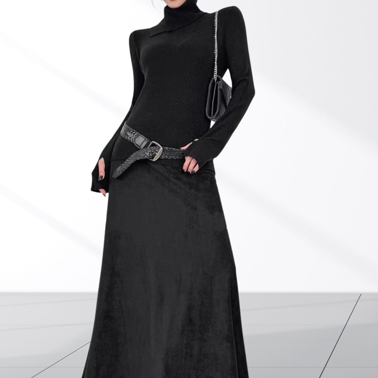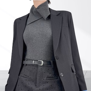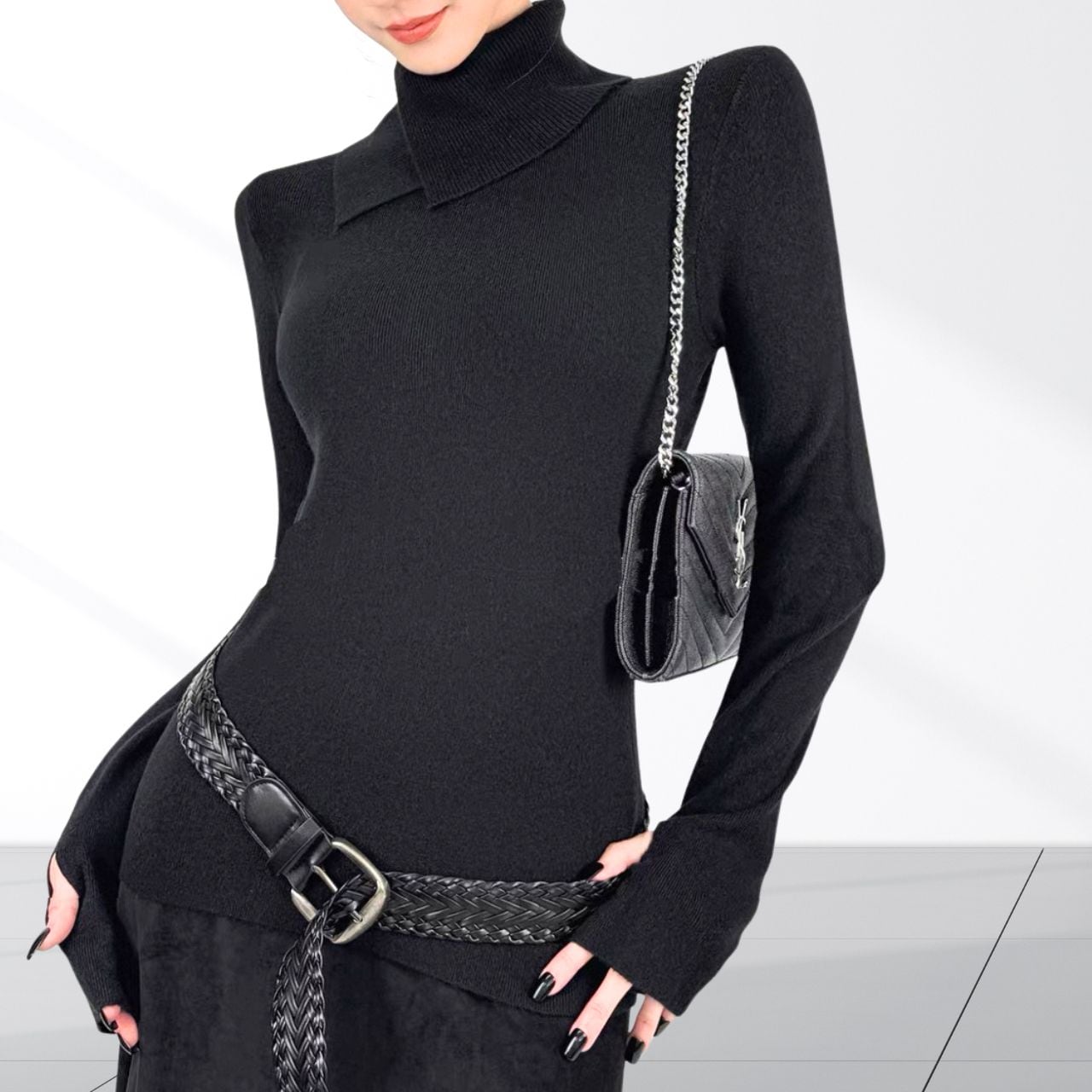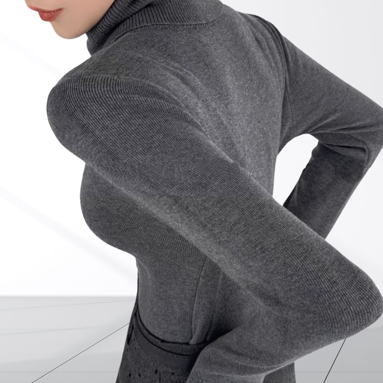 立体的なネックデザインが首元にアクセントを加えるニットトップス。袖口には指穴を備え手の甲までしっかりカバー。デザイン性と防寒性を兼ね備え、首まわりと手元を同時に暖かく保てるのがポイント。