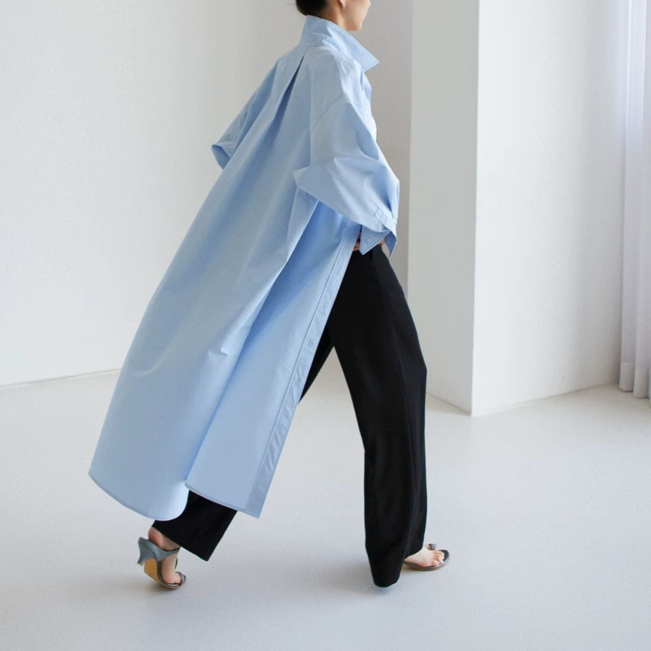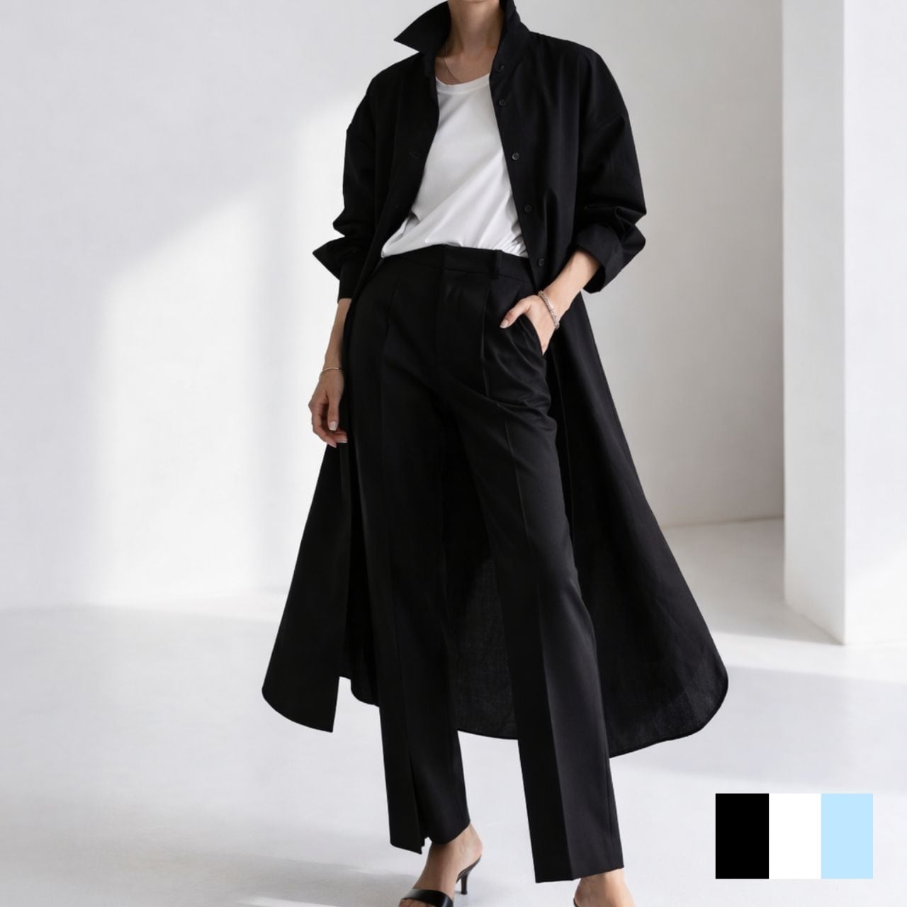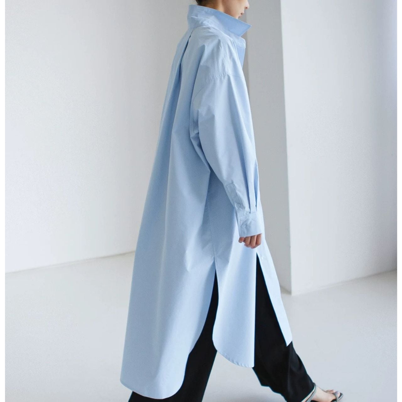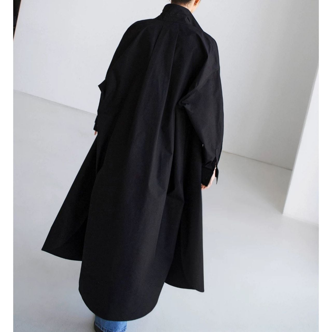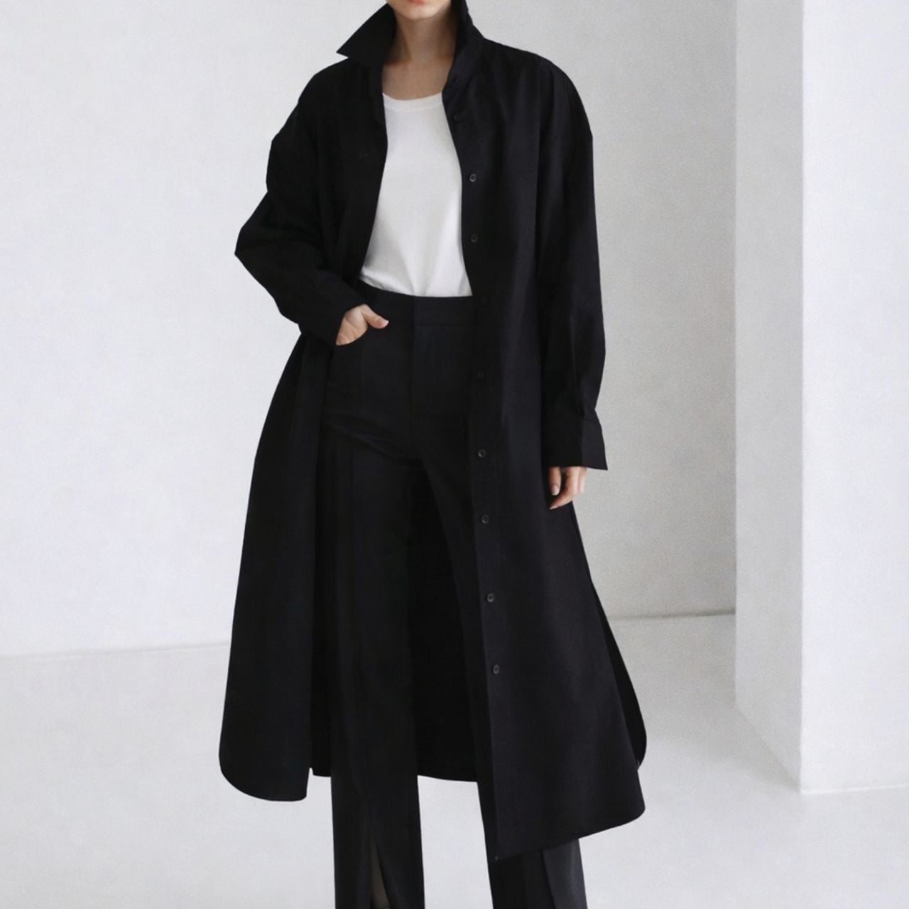 ロング丈が縦を強調し、佇まいに緊張感を生む。
