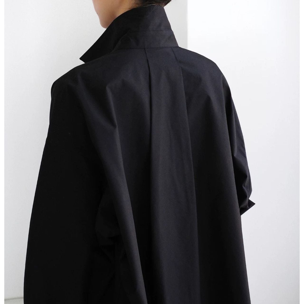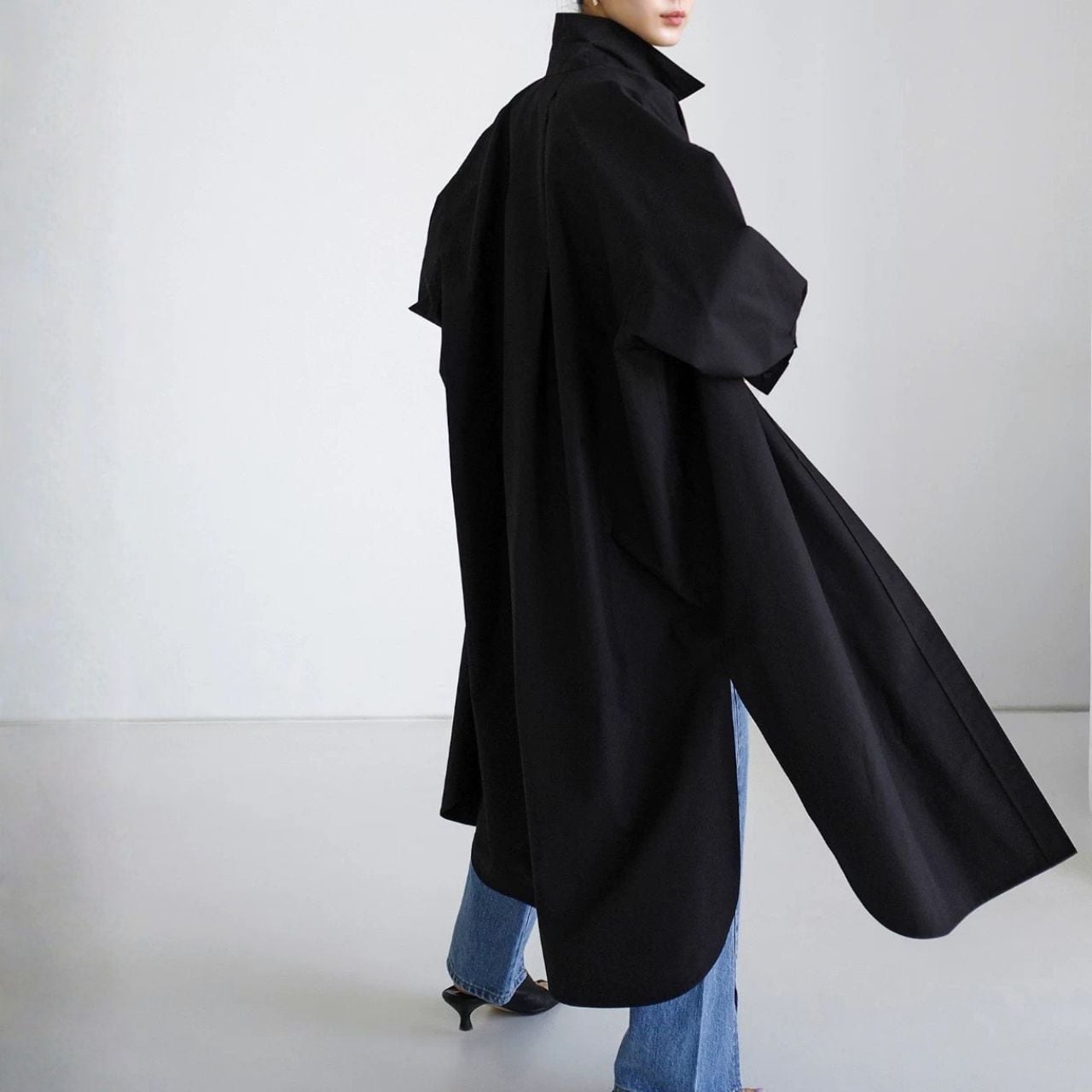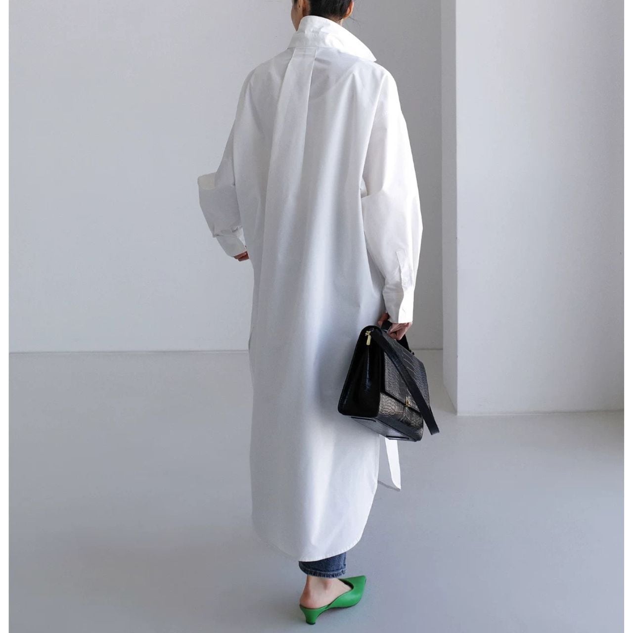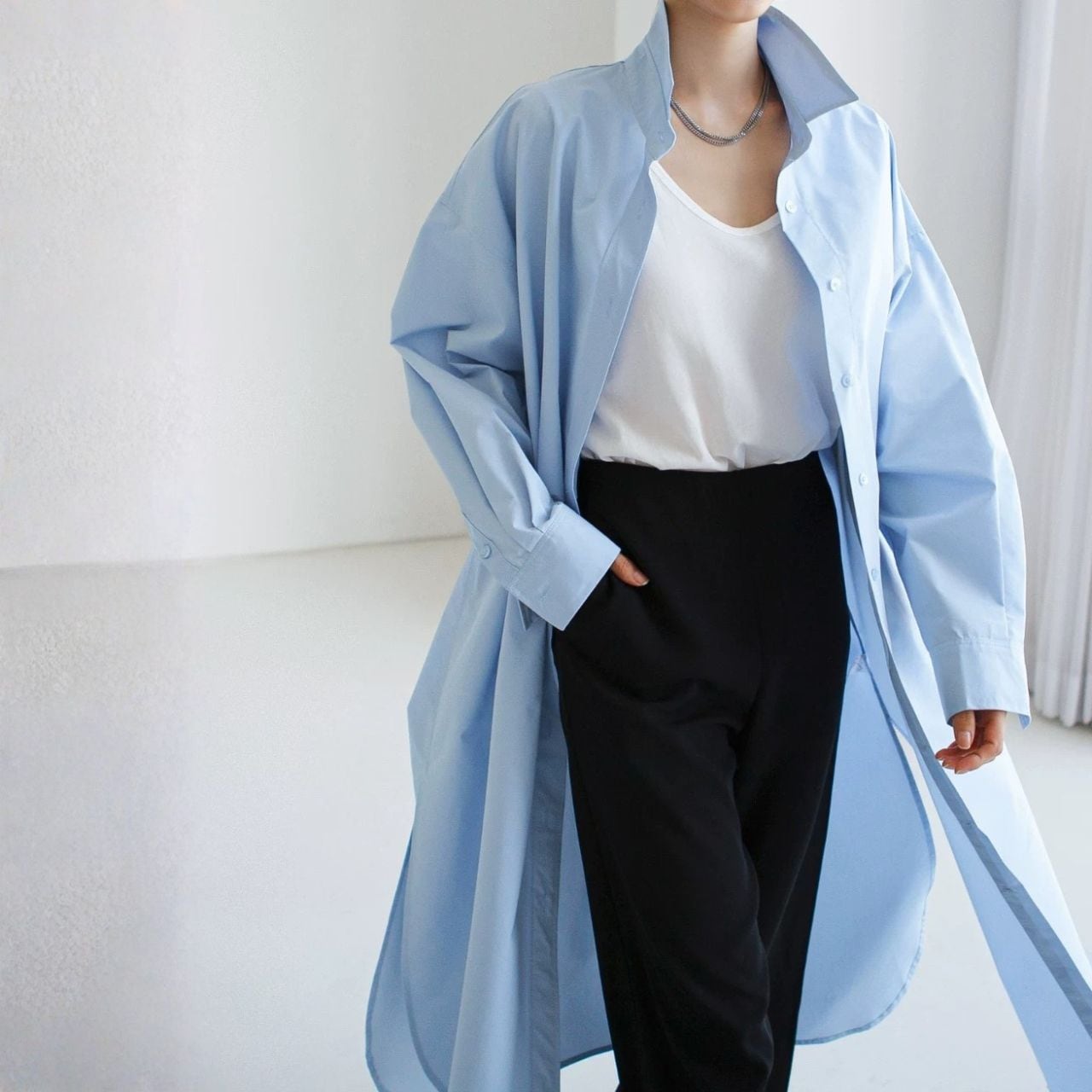 ロング丈が縦を強調し、佇まいに緊張感を生む。