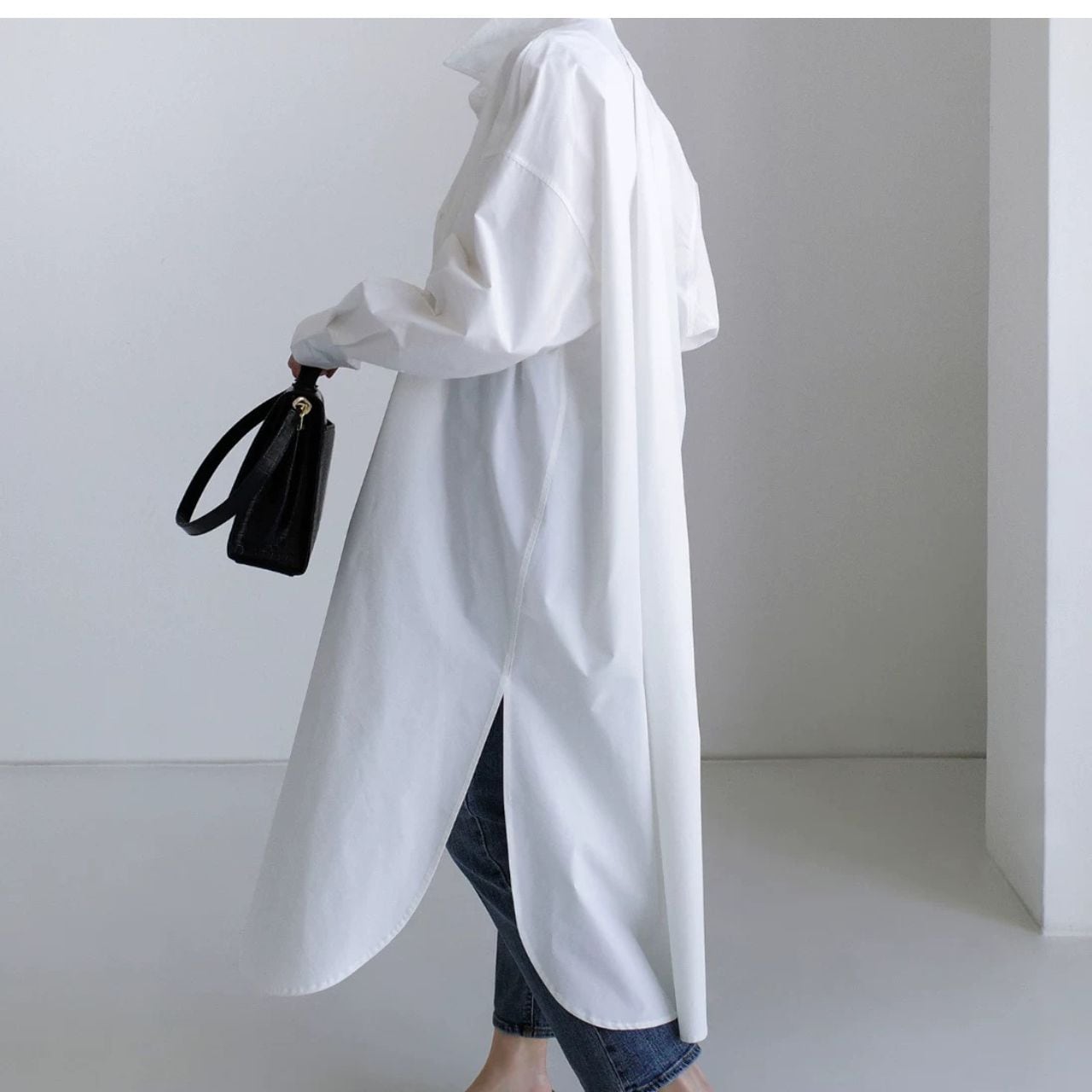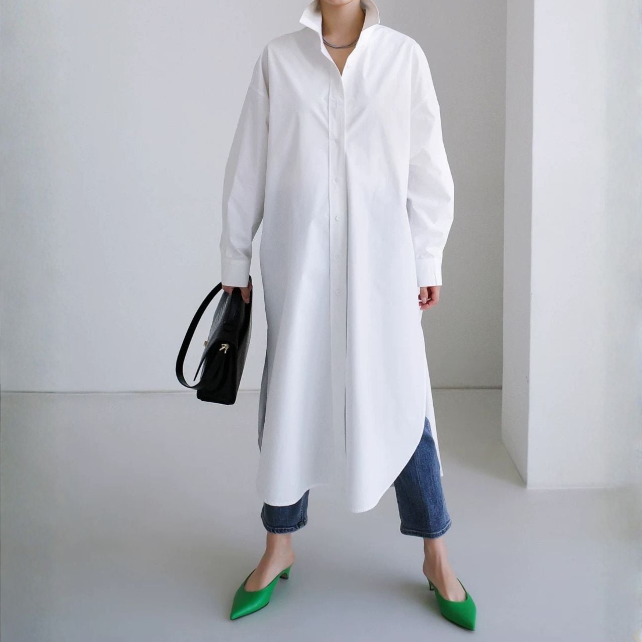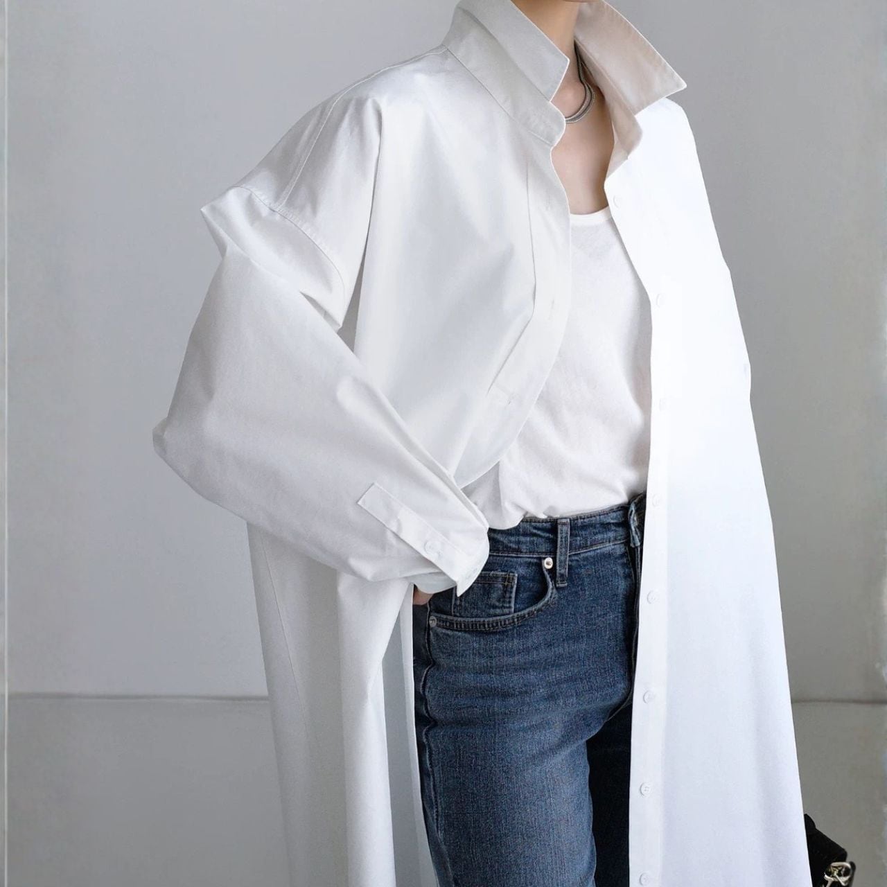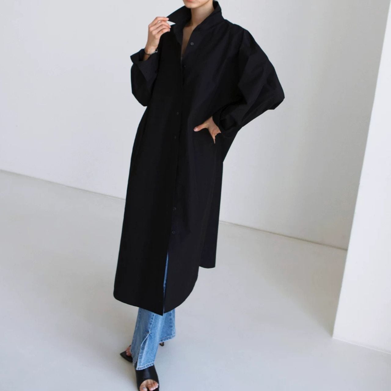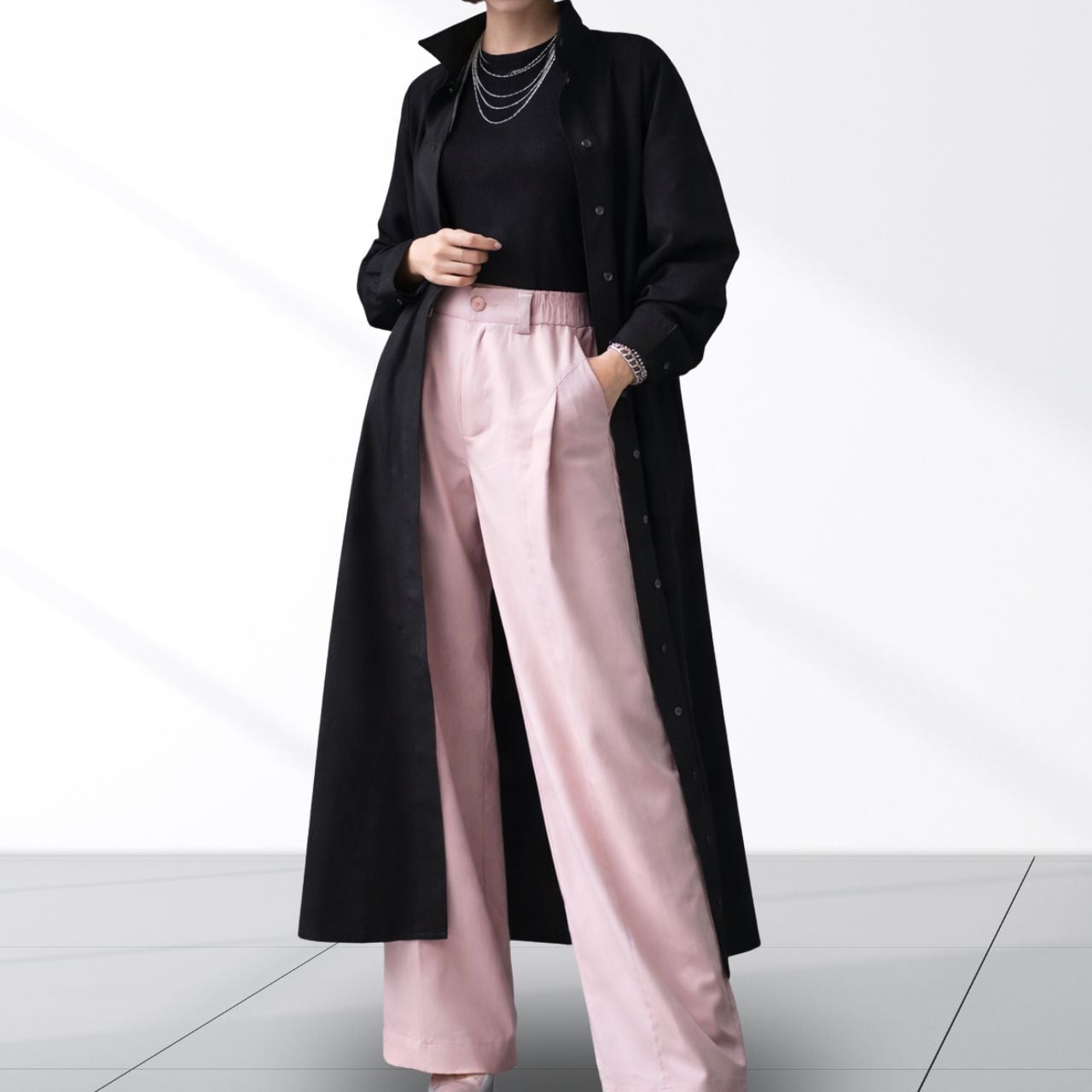 ロング丈が縦を強調し、佇まいに緊張感を生む。