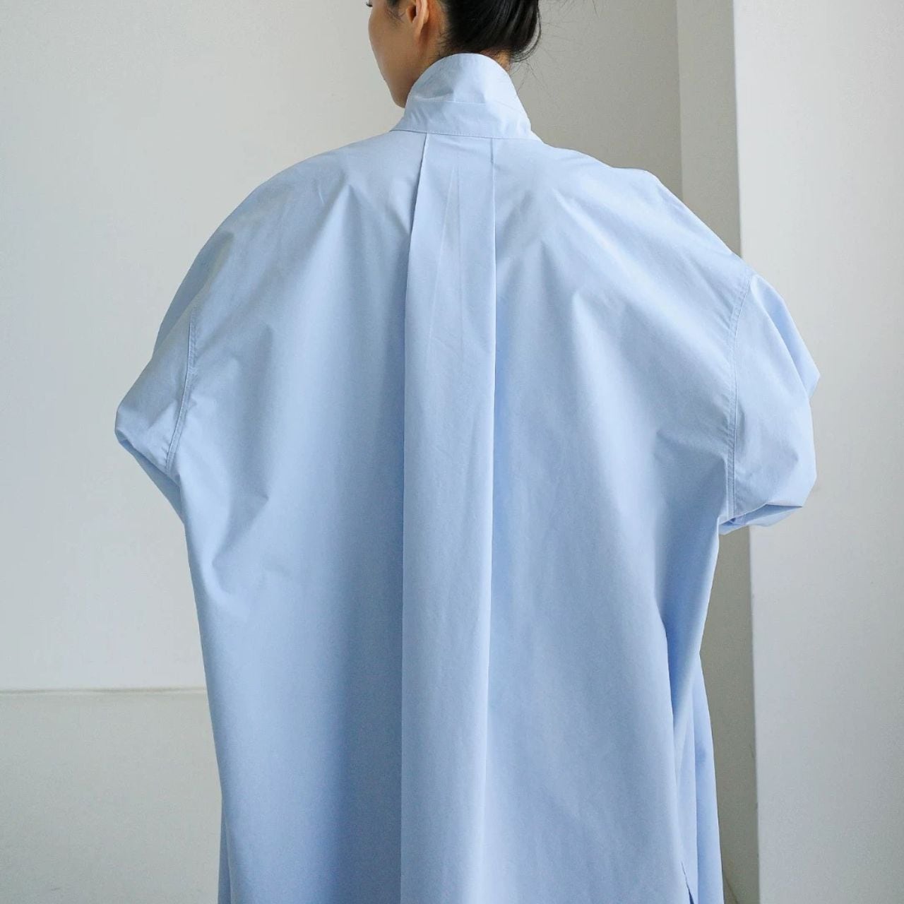 立体的な衿が視線を引き上げる。