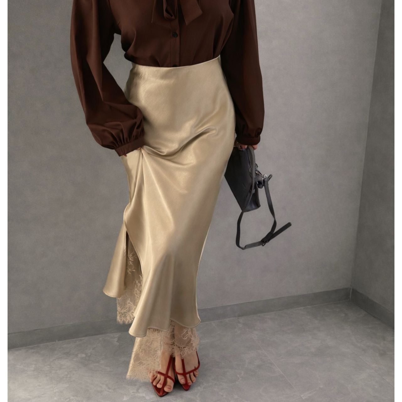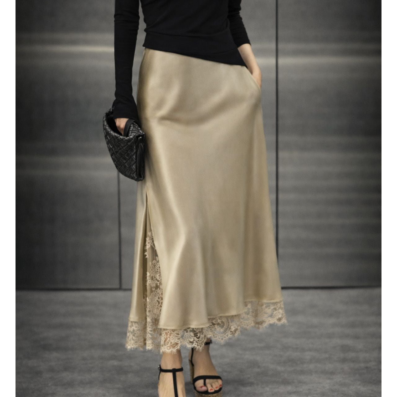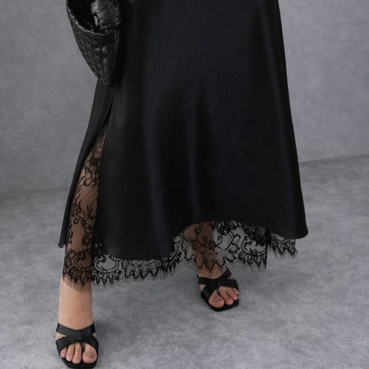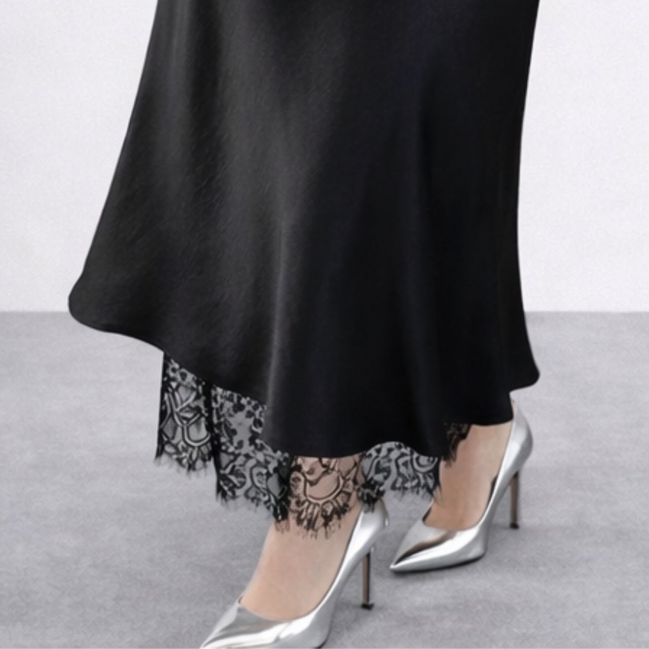裾とサイドスリットに繊細なレースをあしらった