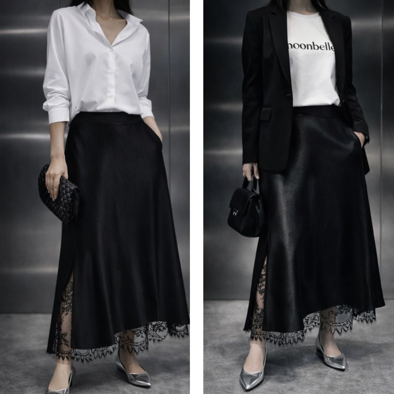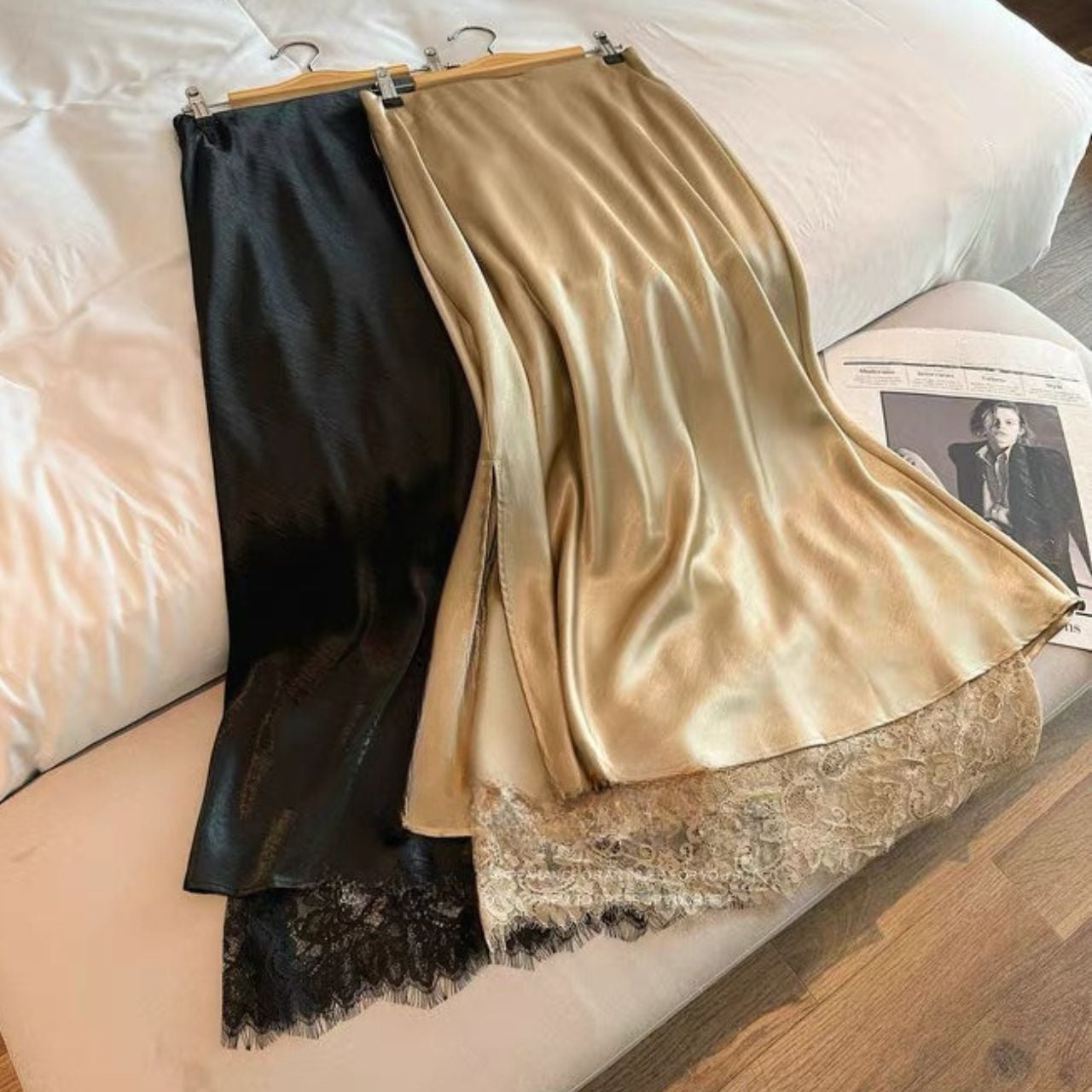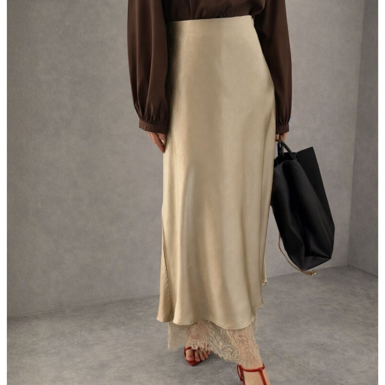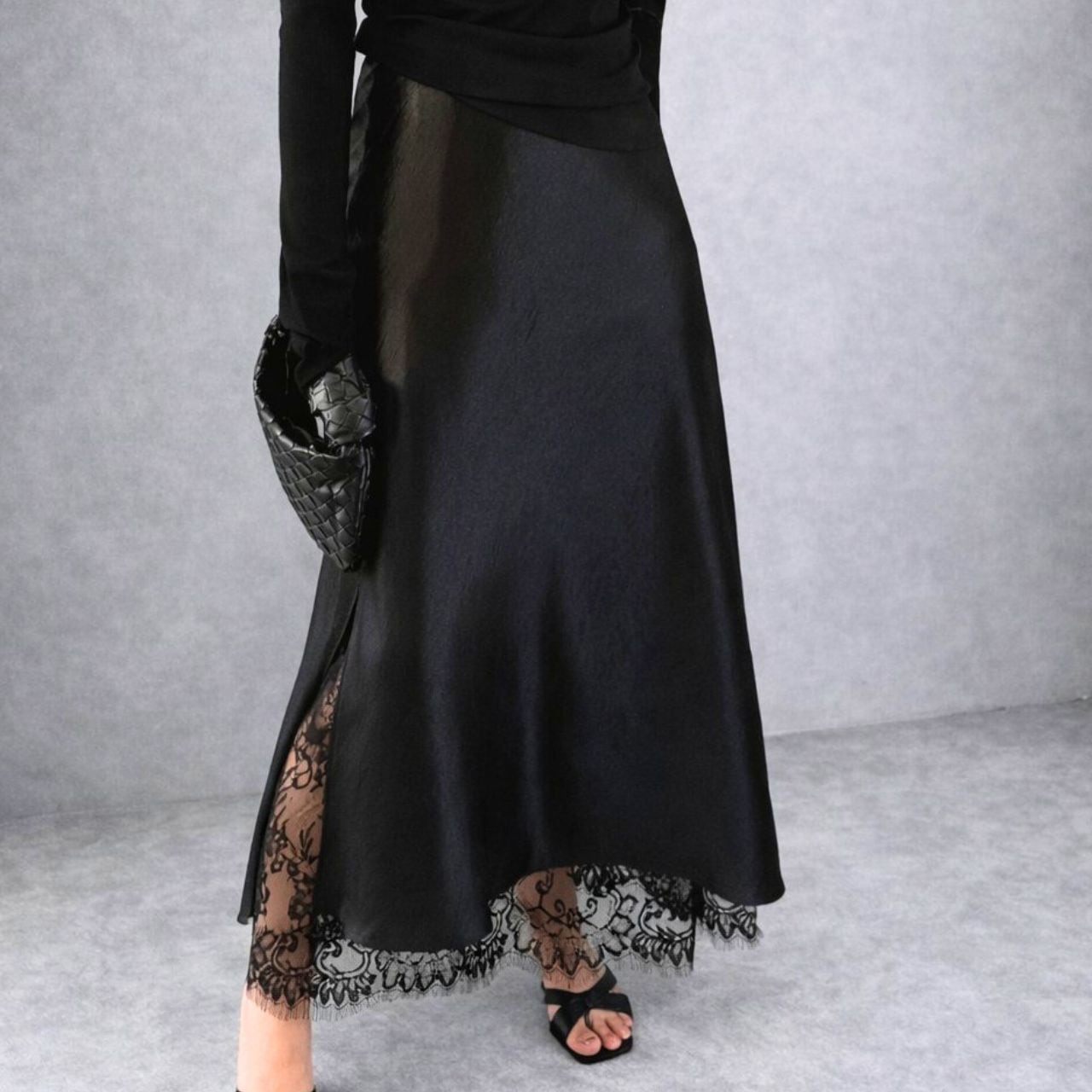 裾とサイドスリットに繊細なレースをあしらった