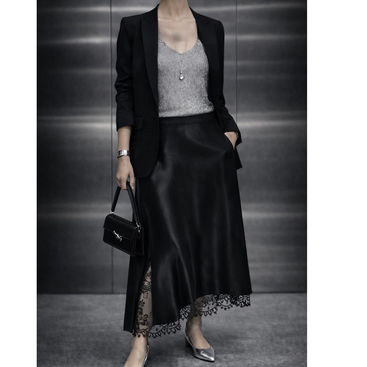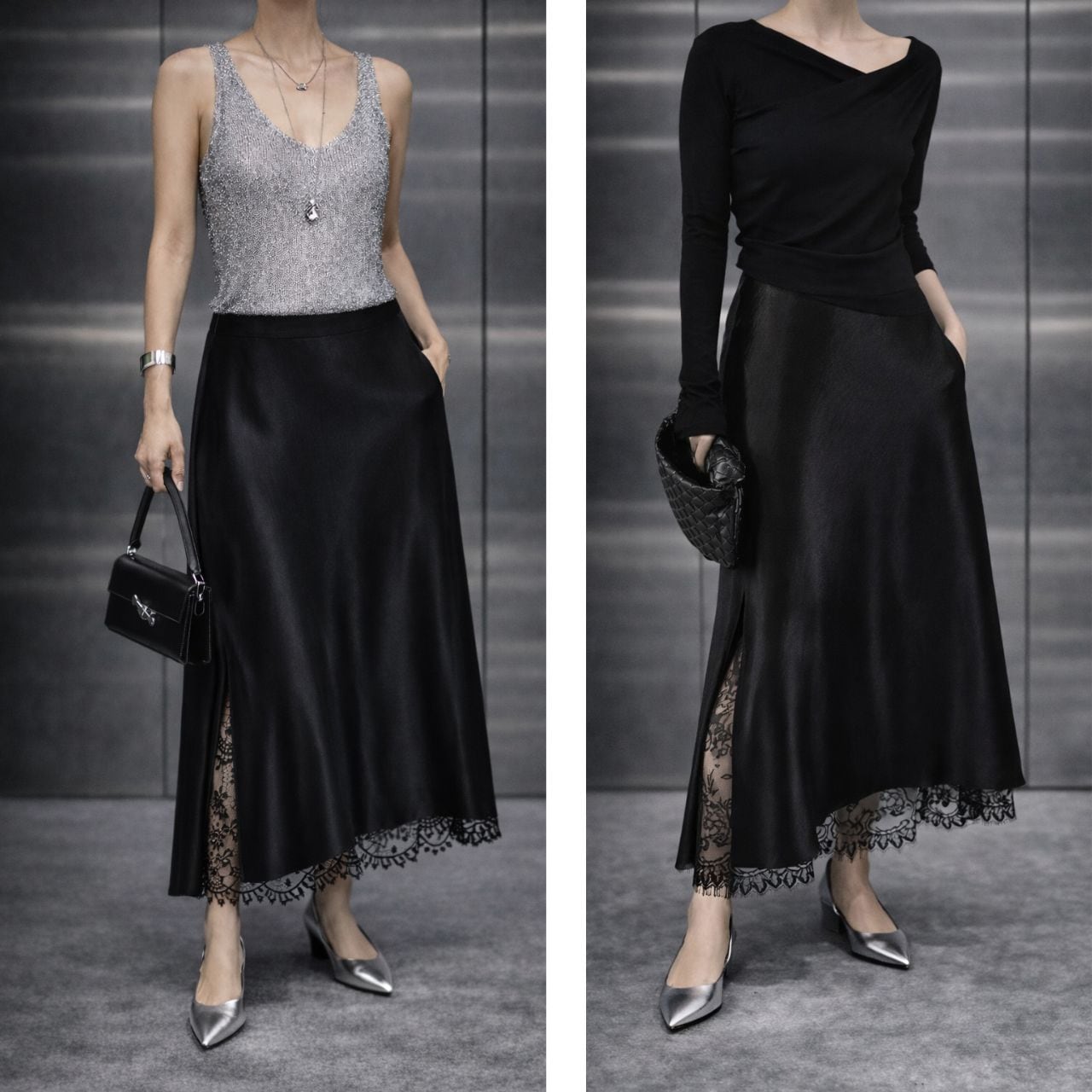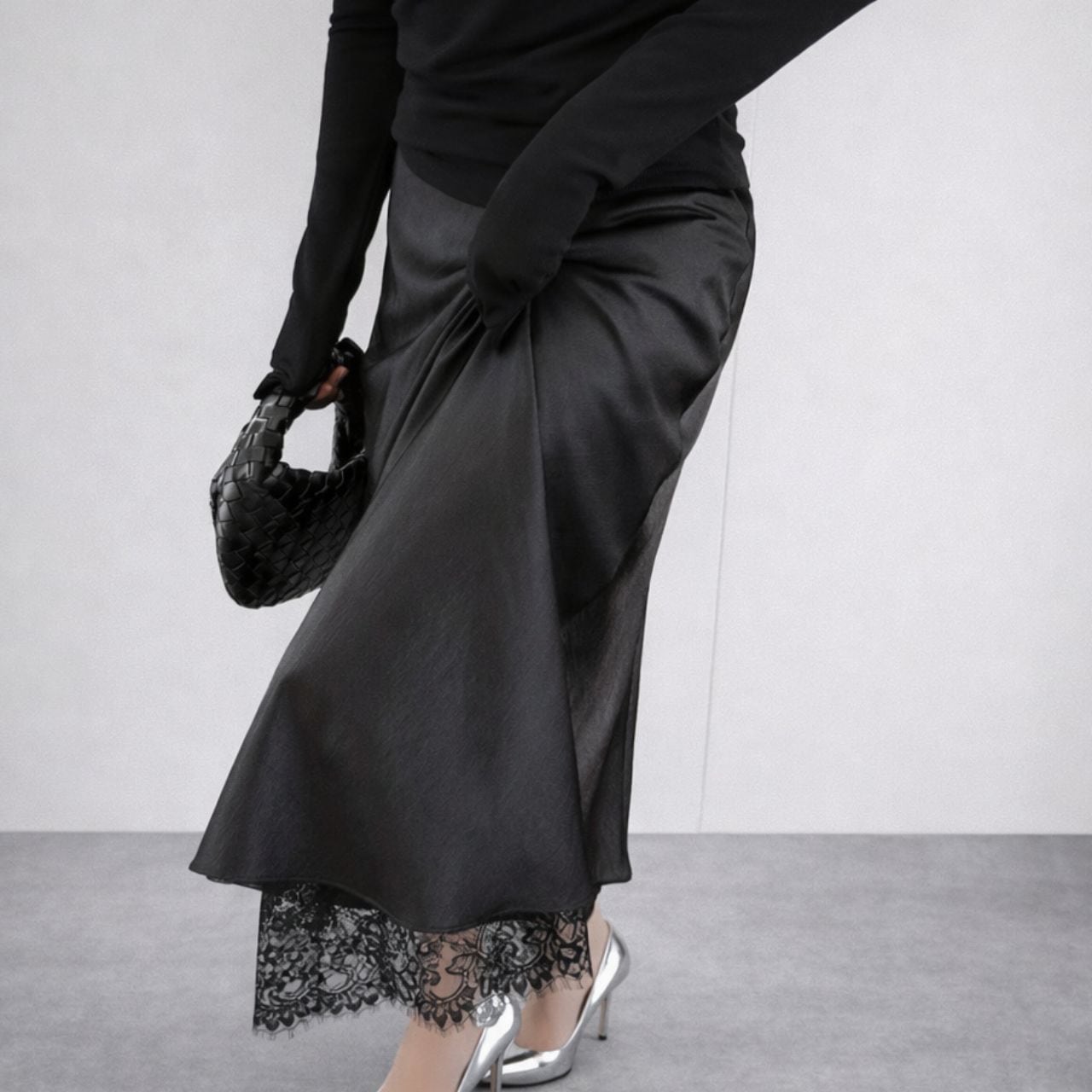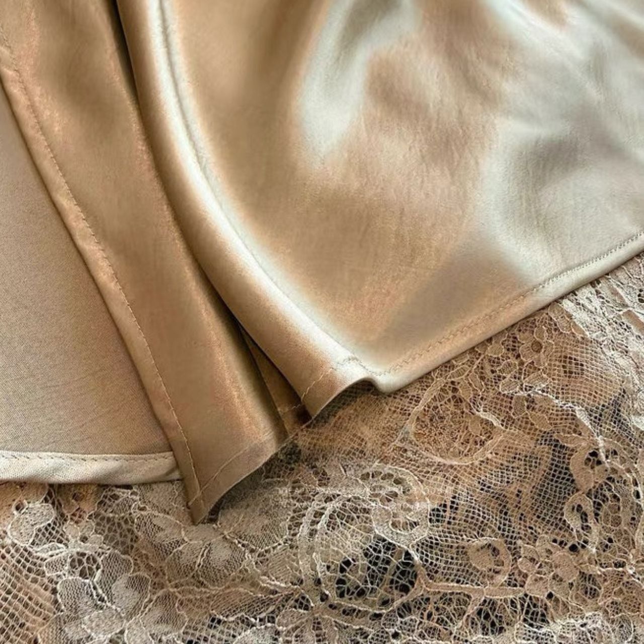 裾とサイドスリットに繊細なレースをあしらった