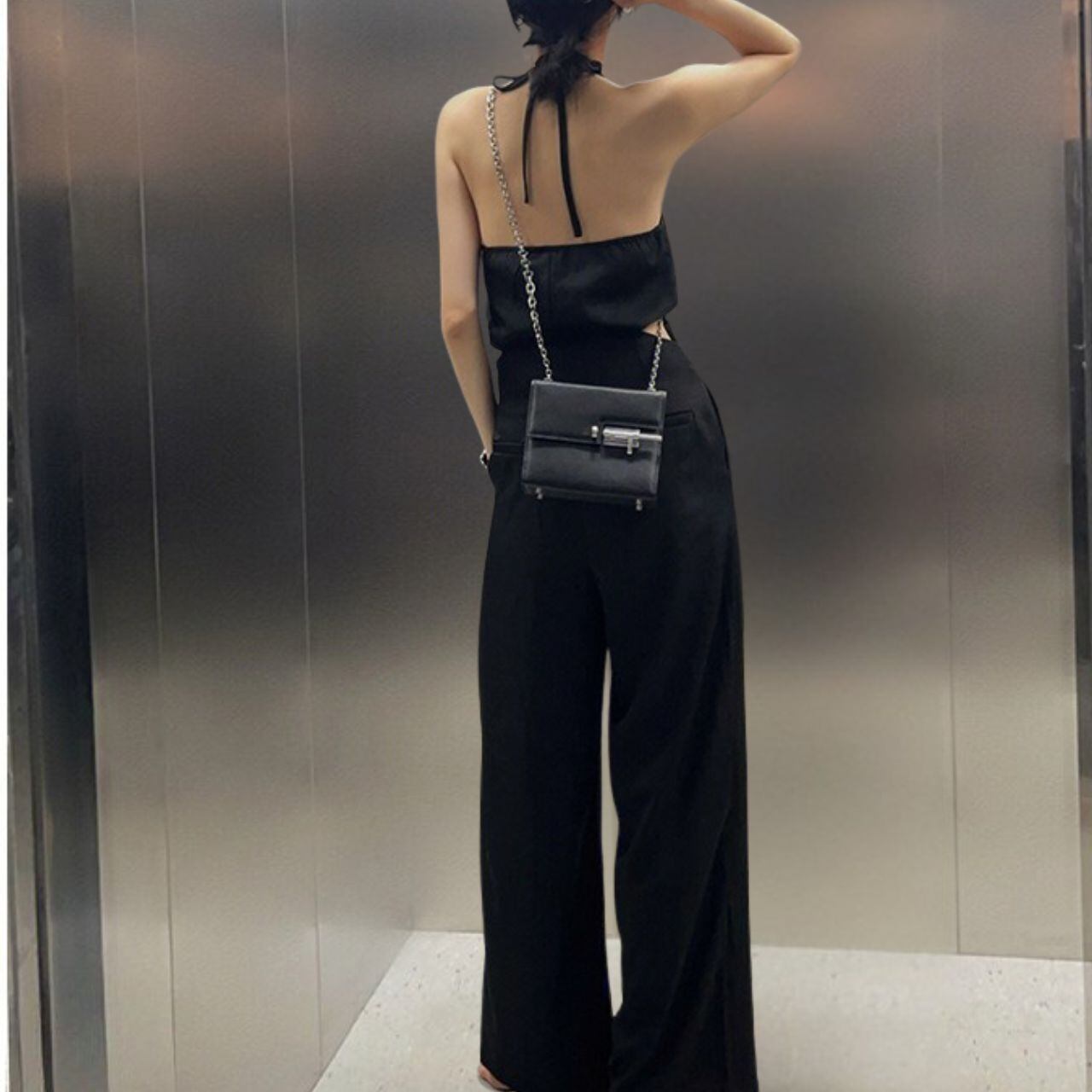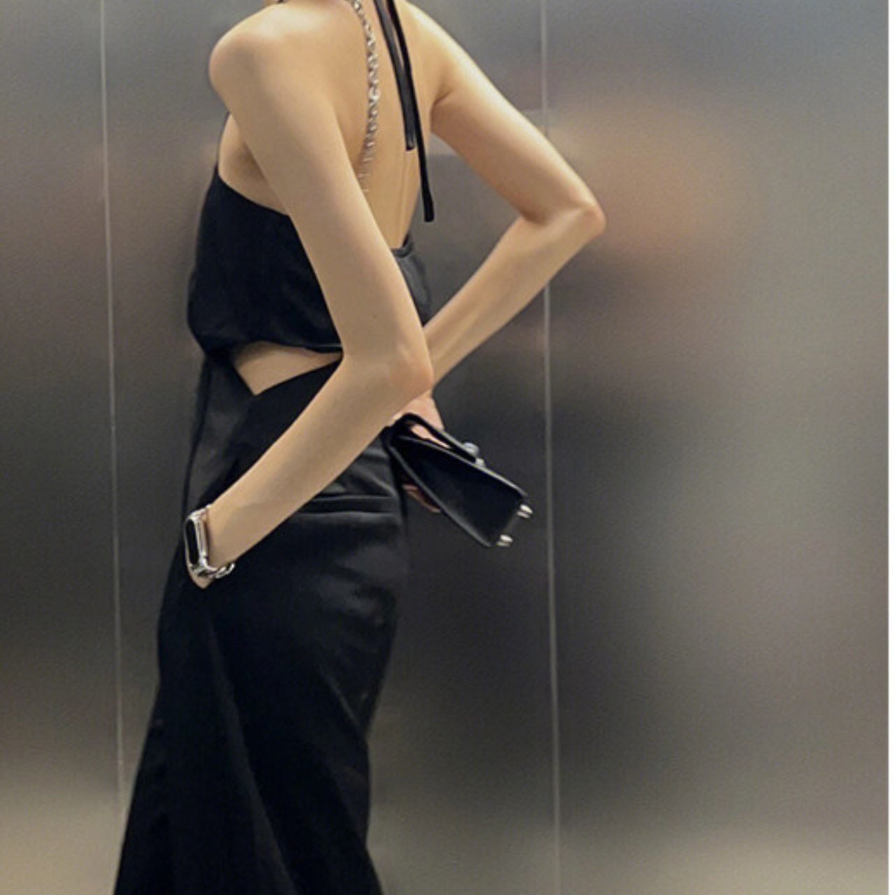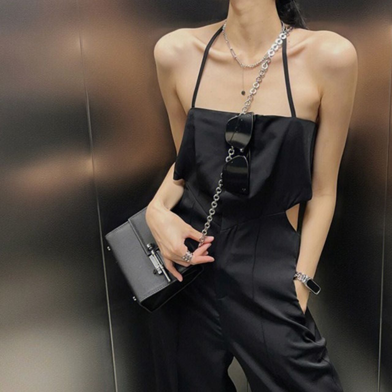 ホルターネックのミニマルなライン。ウエストのカットアウトがさりげないエッジ。