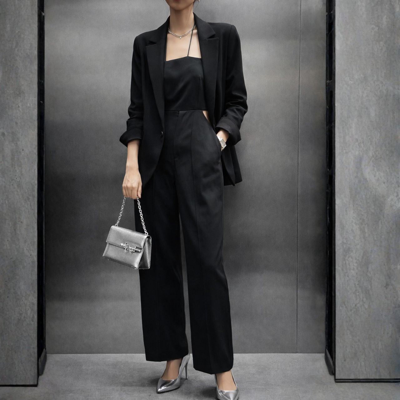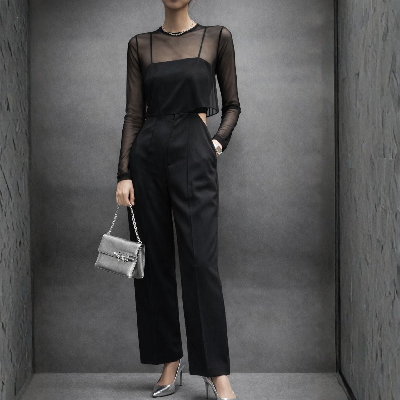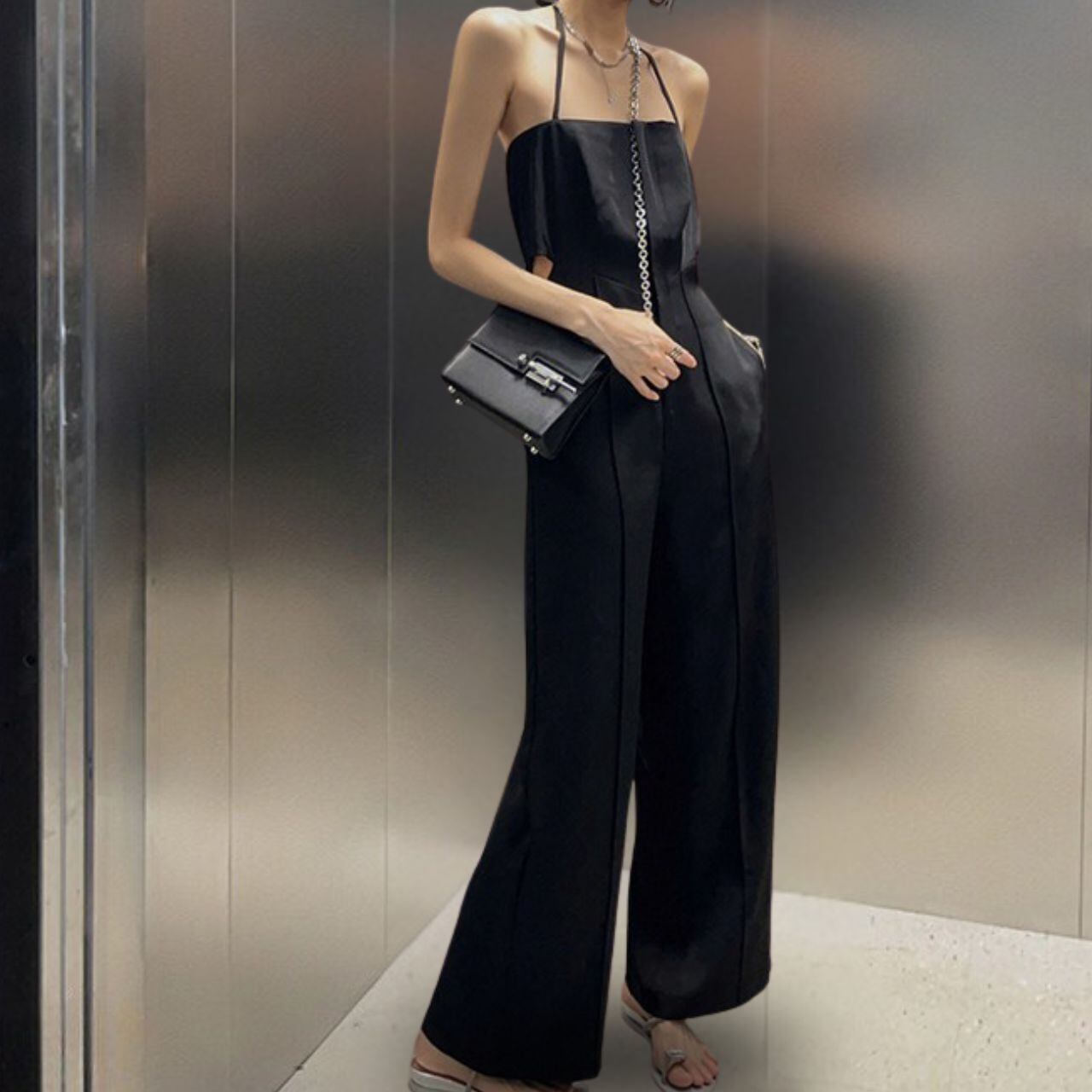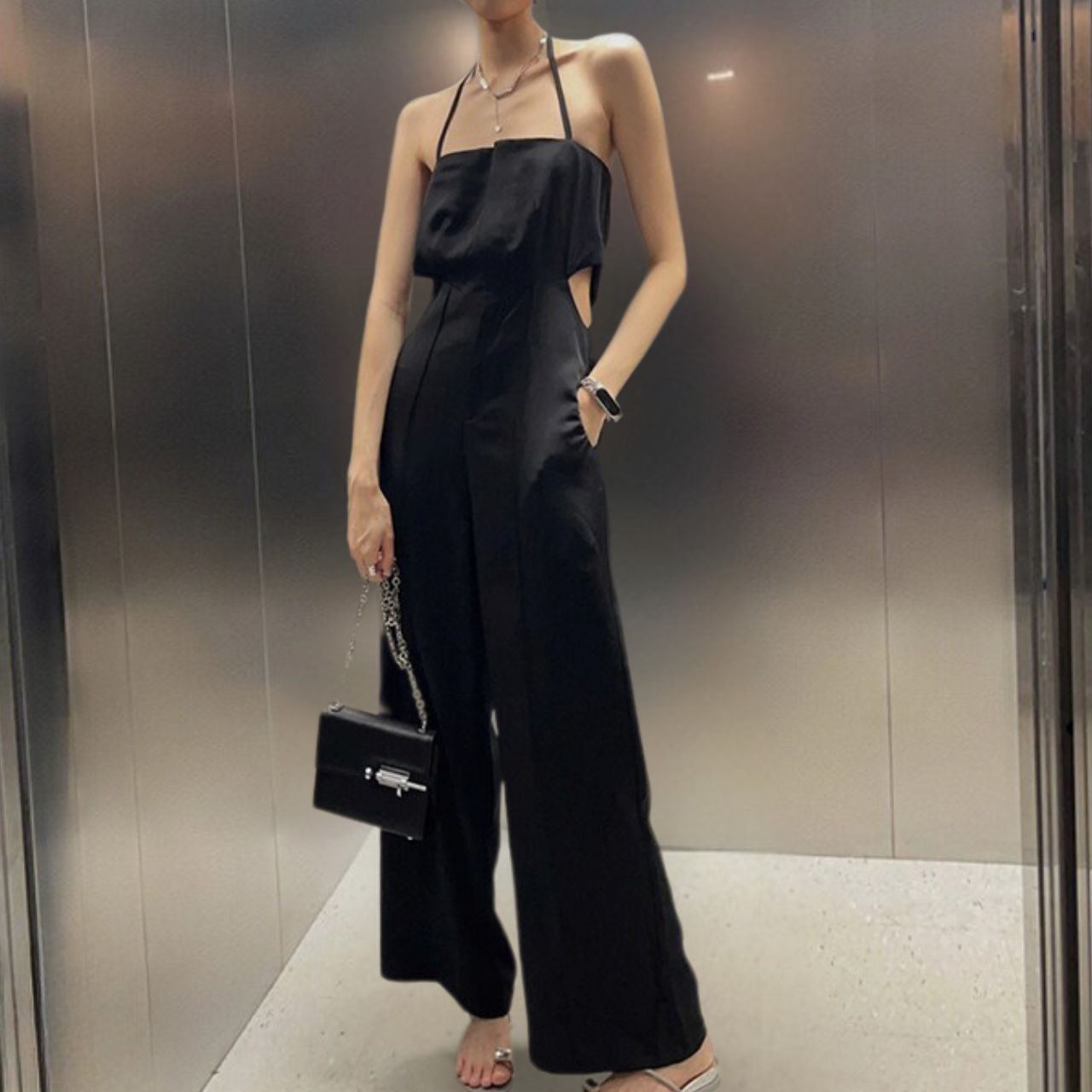 ホルターネックのミニマルなライン。ウエストのカットアウトがさりげないエッジ。