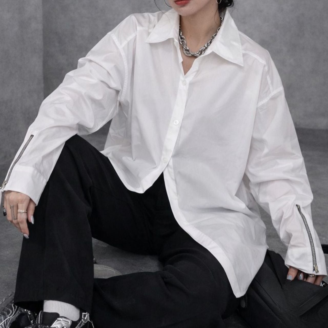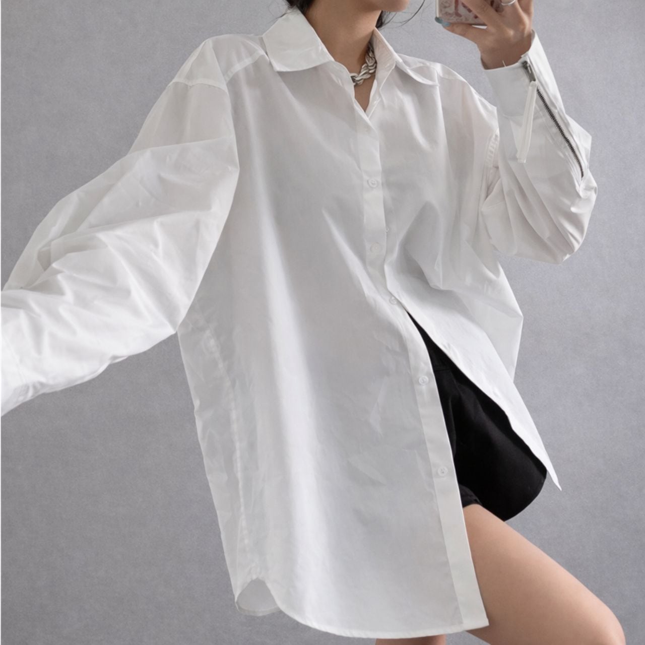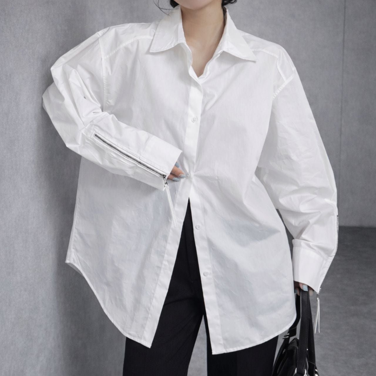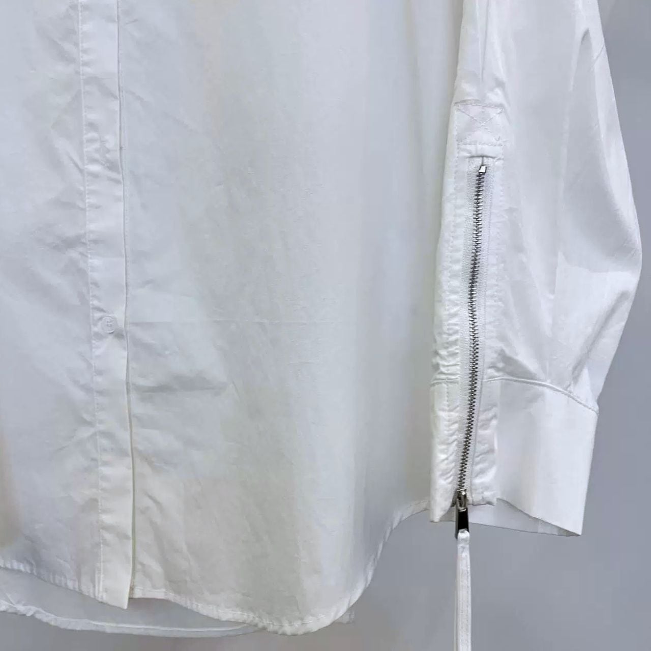 整いすぎない白。袖のジッパーが引き締める。