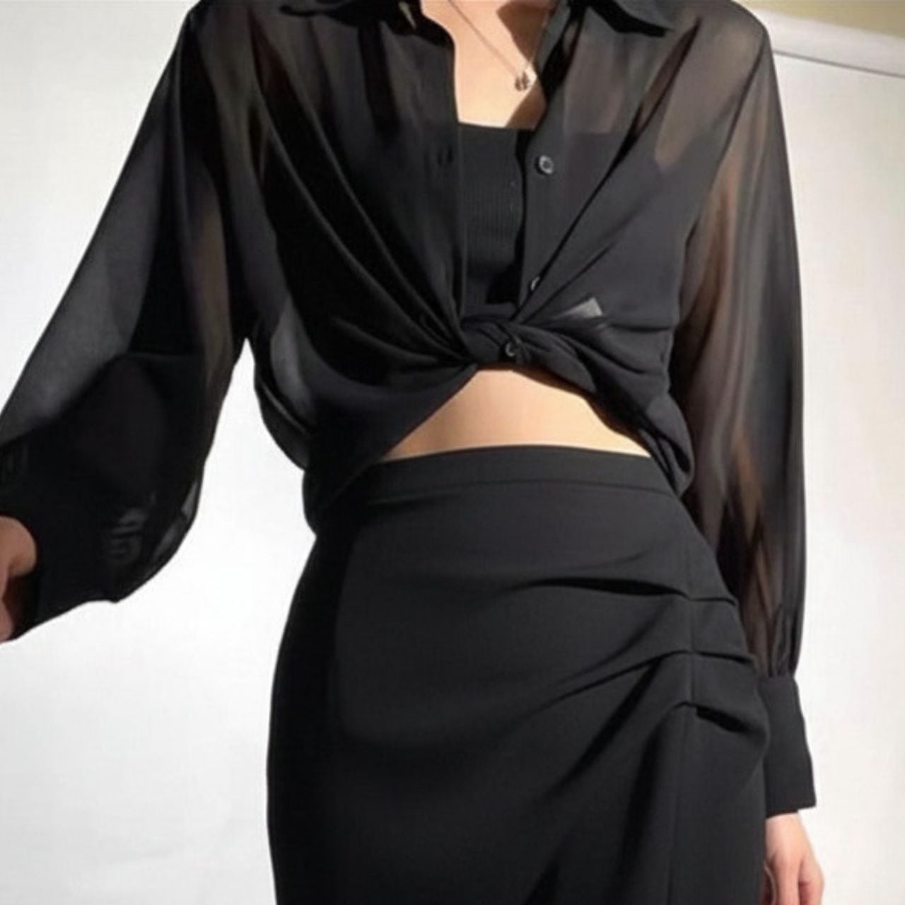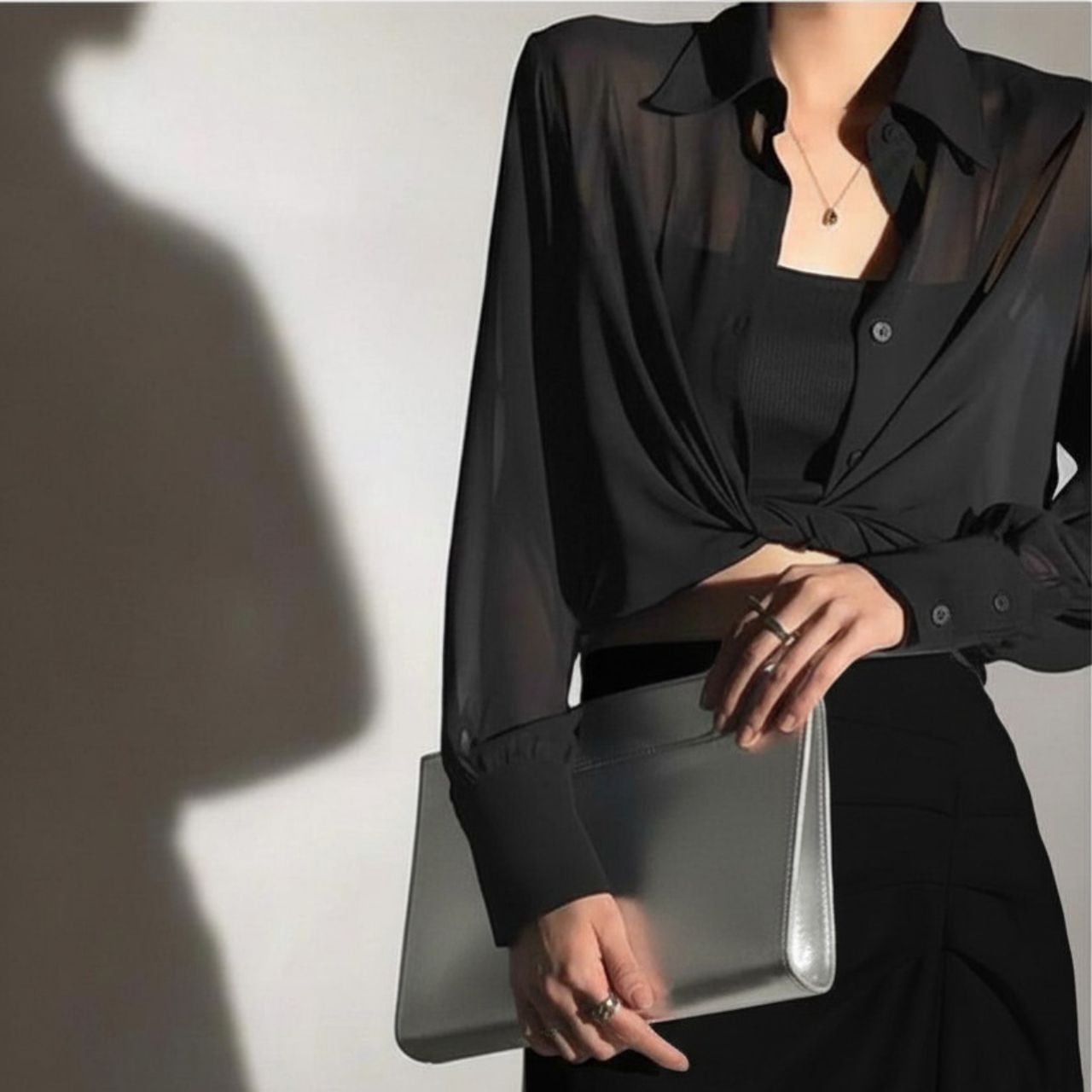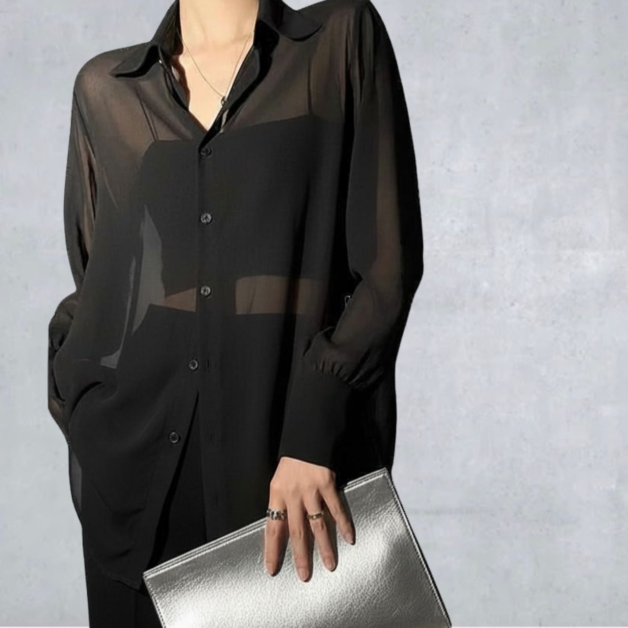 重ねて完成するバランス。インナーとのコントラストでモードを引き出すシアー素材。