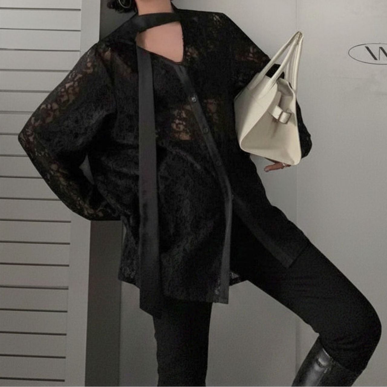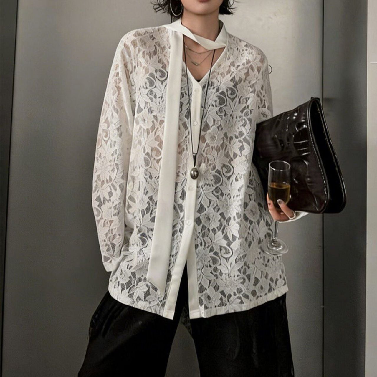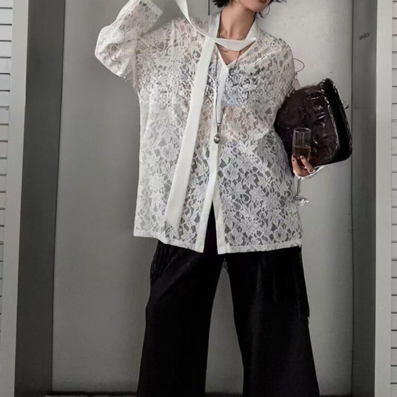 繊細なレースでつくる静かな存在感。首元のタイがアクセント。