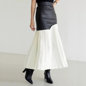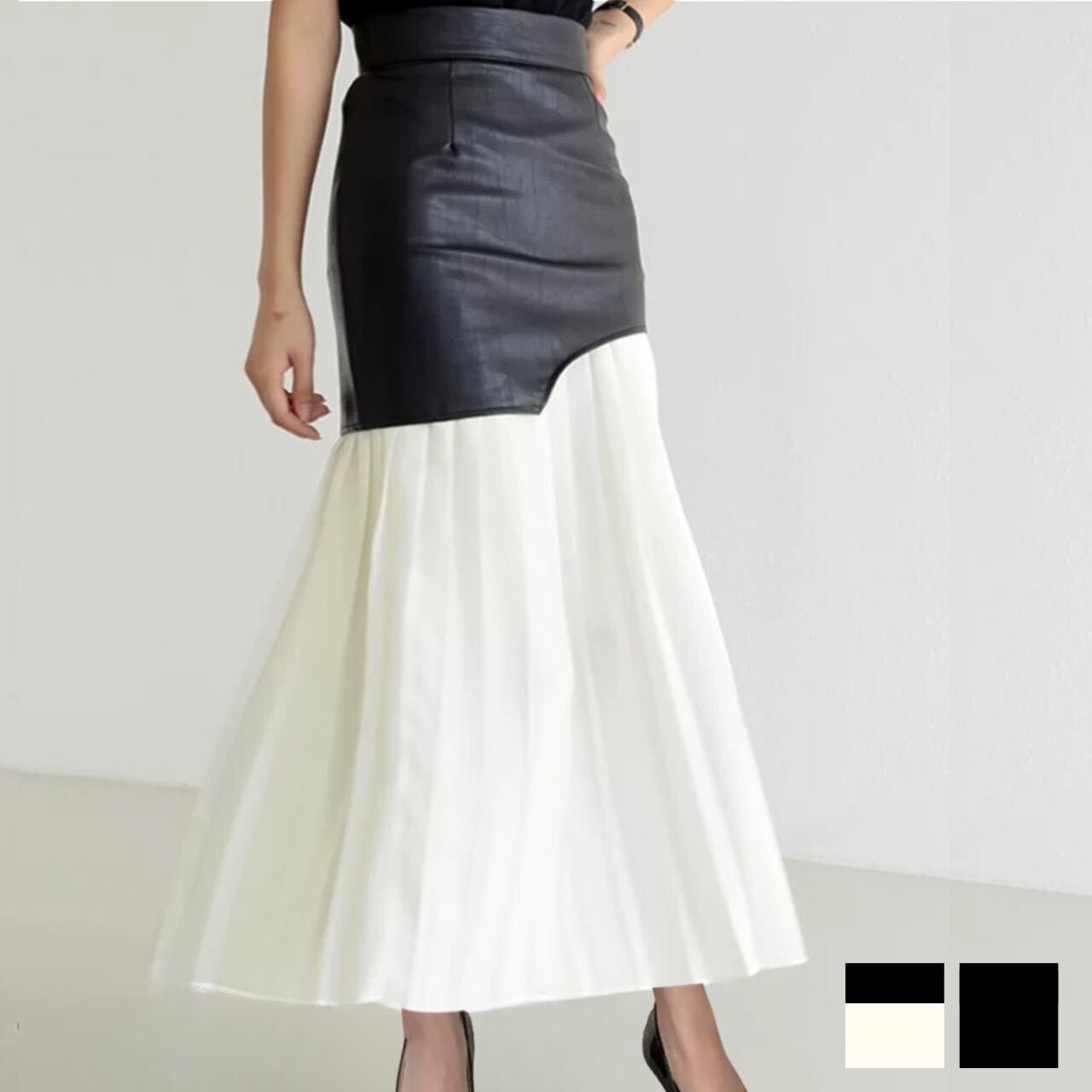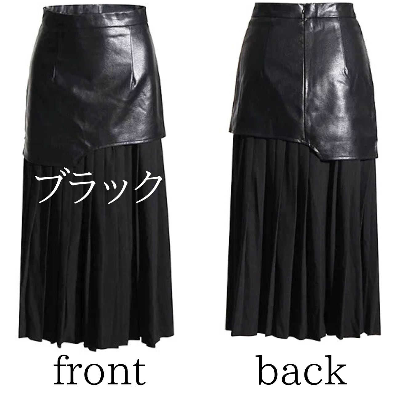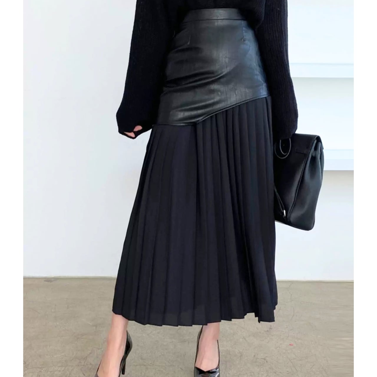 PUレザーとプリーツがモードな印象のアシンメトリースカート。