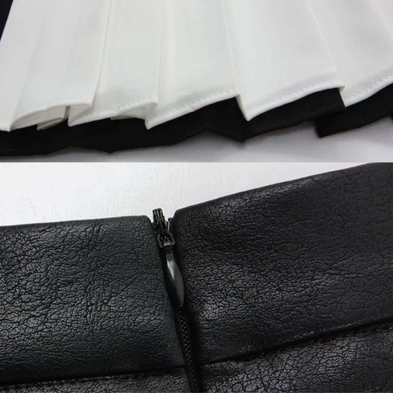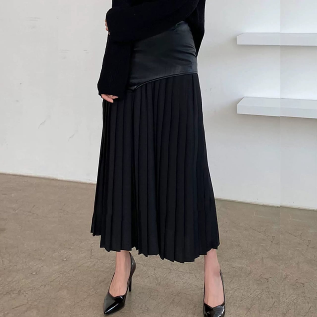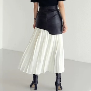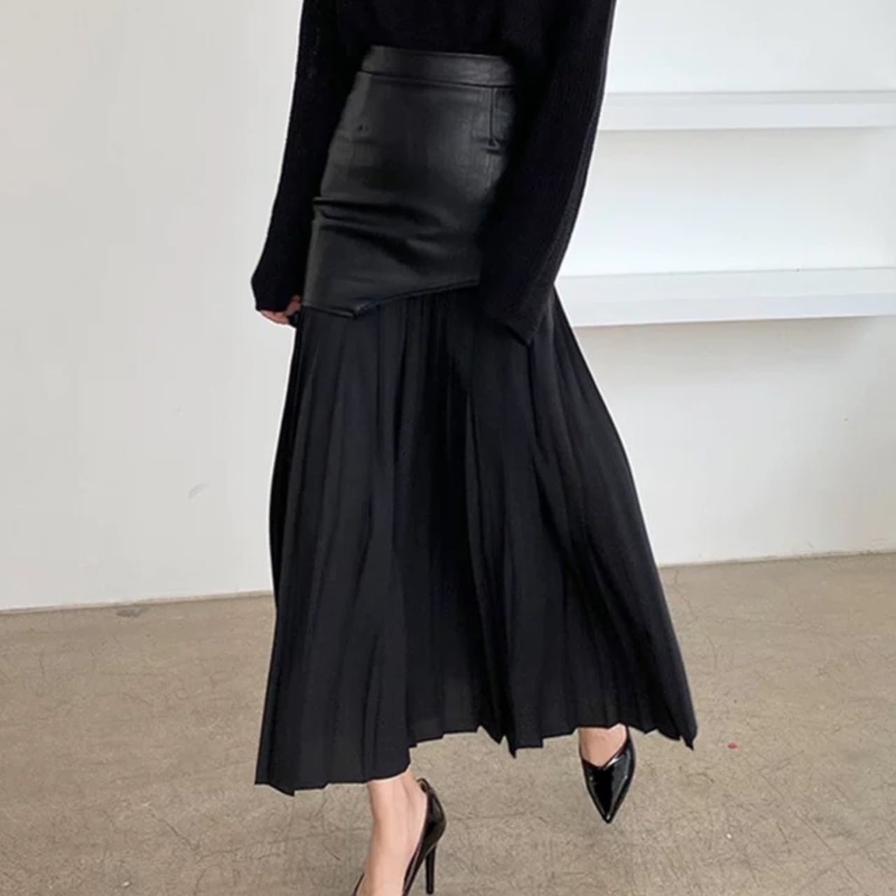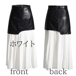 PUレザーとプリーツがモードな印象のアシンメトリースカート。
