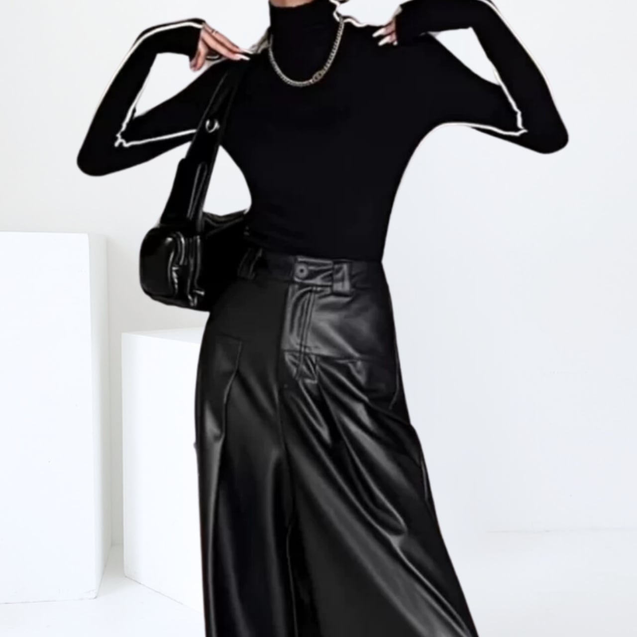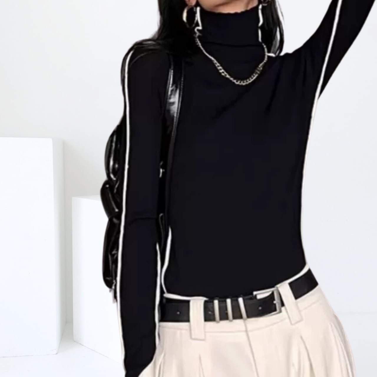パイピングがアクセントになってクールな印象に仕上げてくれるハイネックニット。