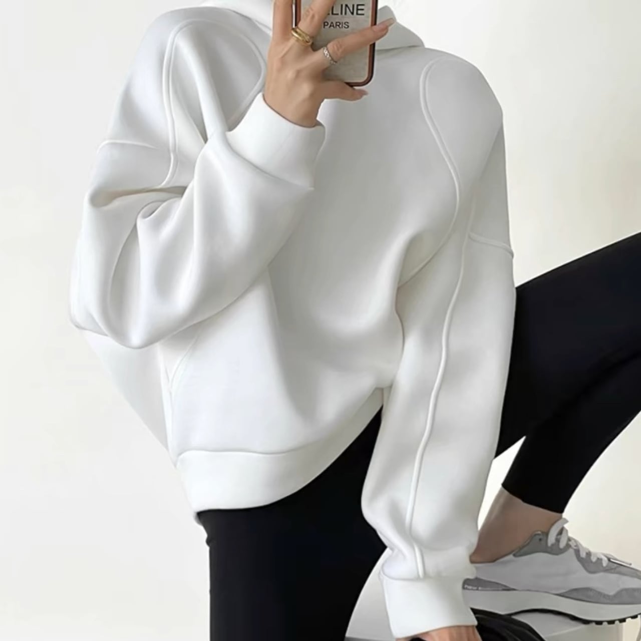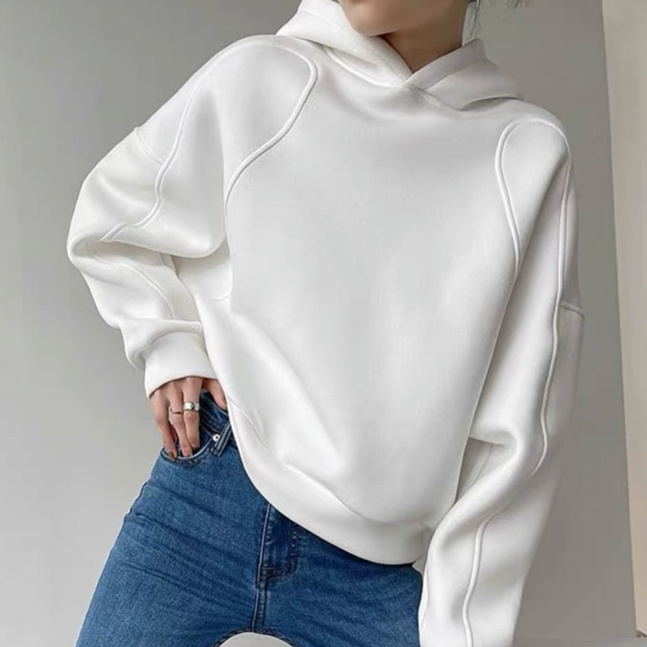 シンプルに見えて袖から脇あたりにカーブを描いたデザインのパーカー。