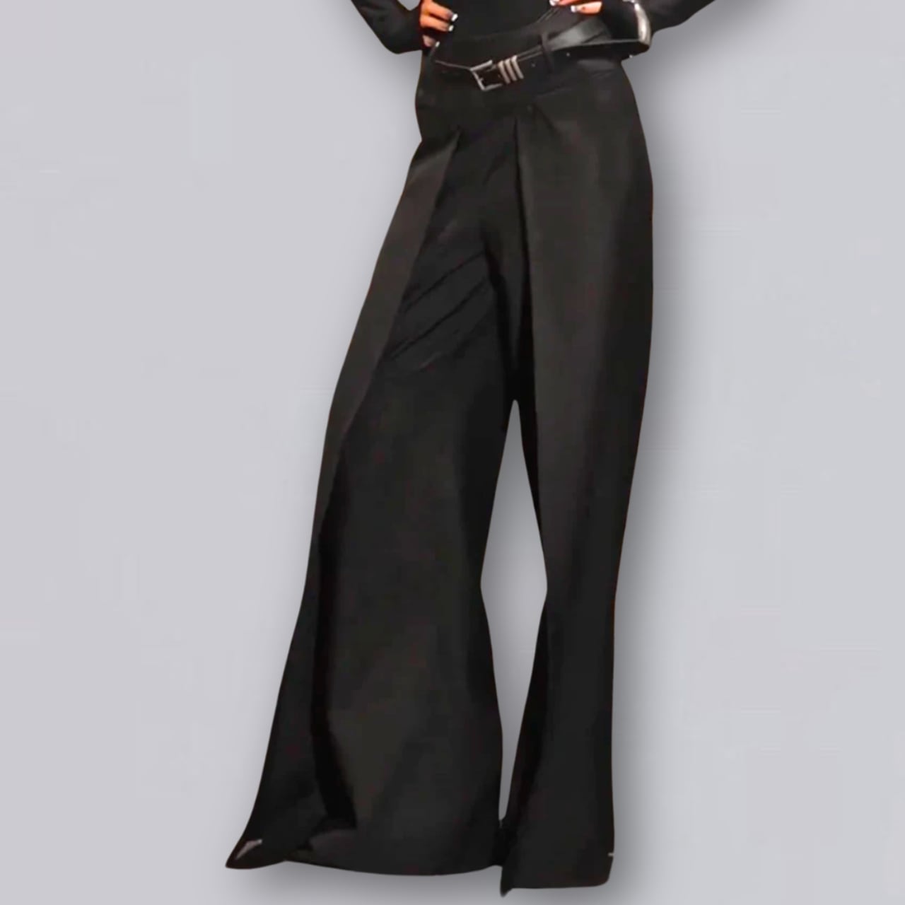 フロントのボタンと外側が長くなったレングスがモードな印象のパンツ。
