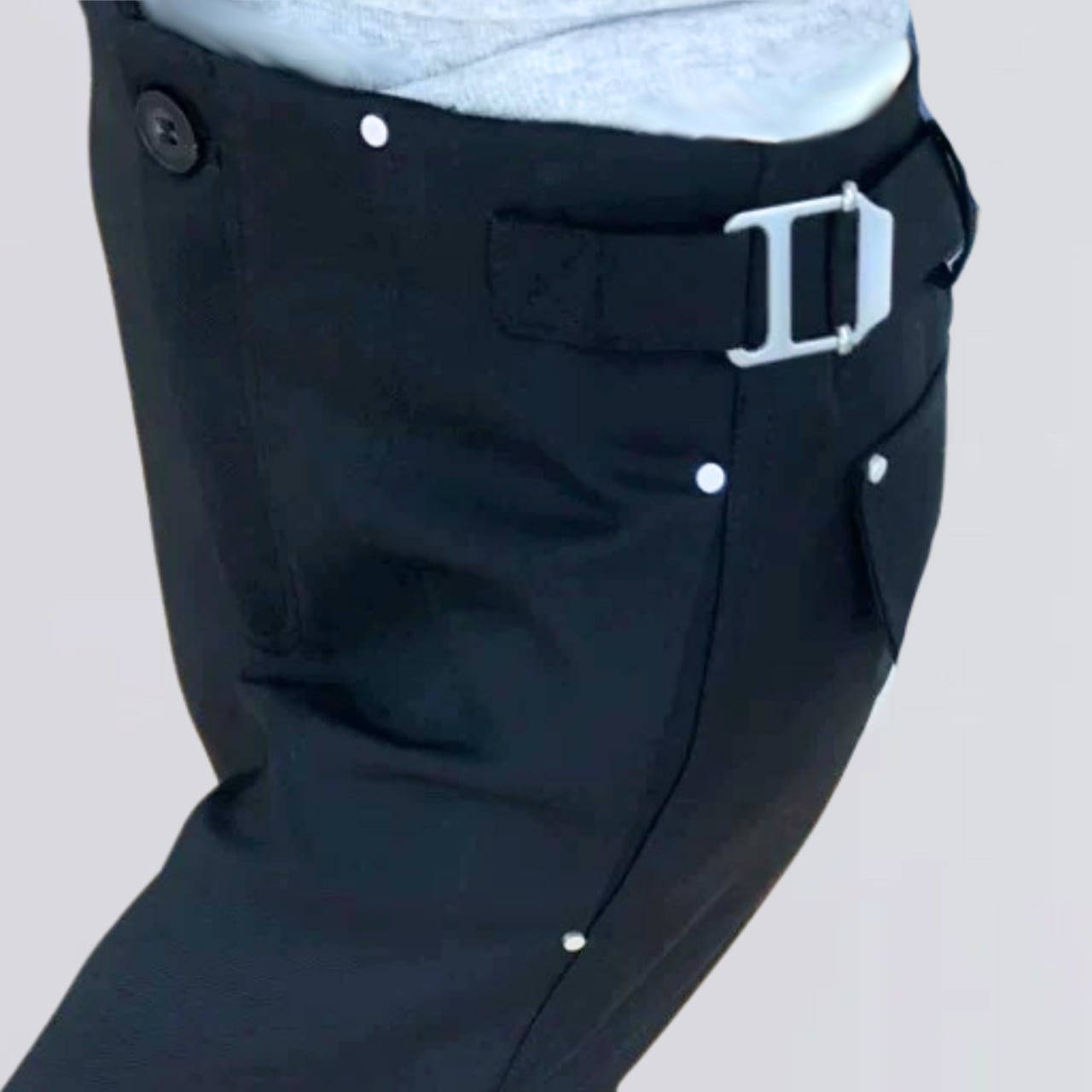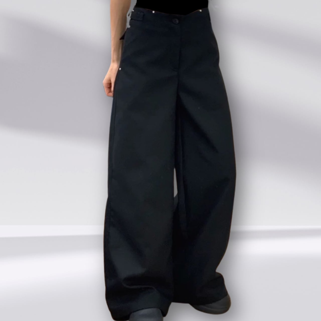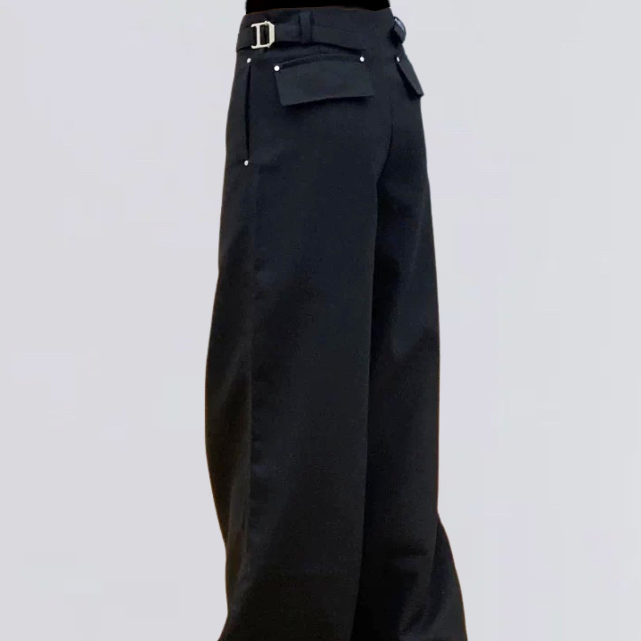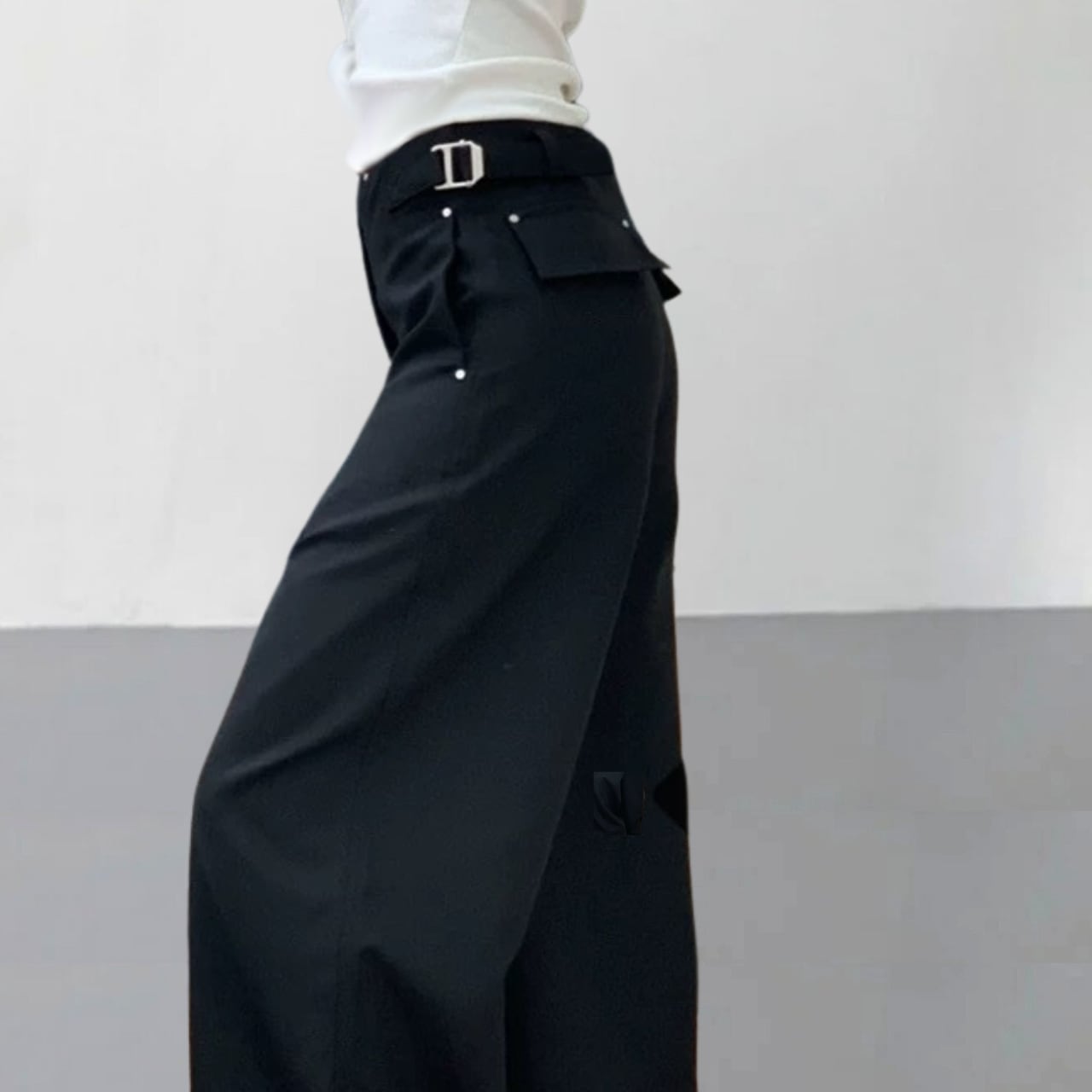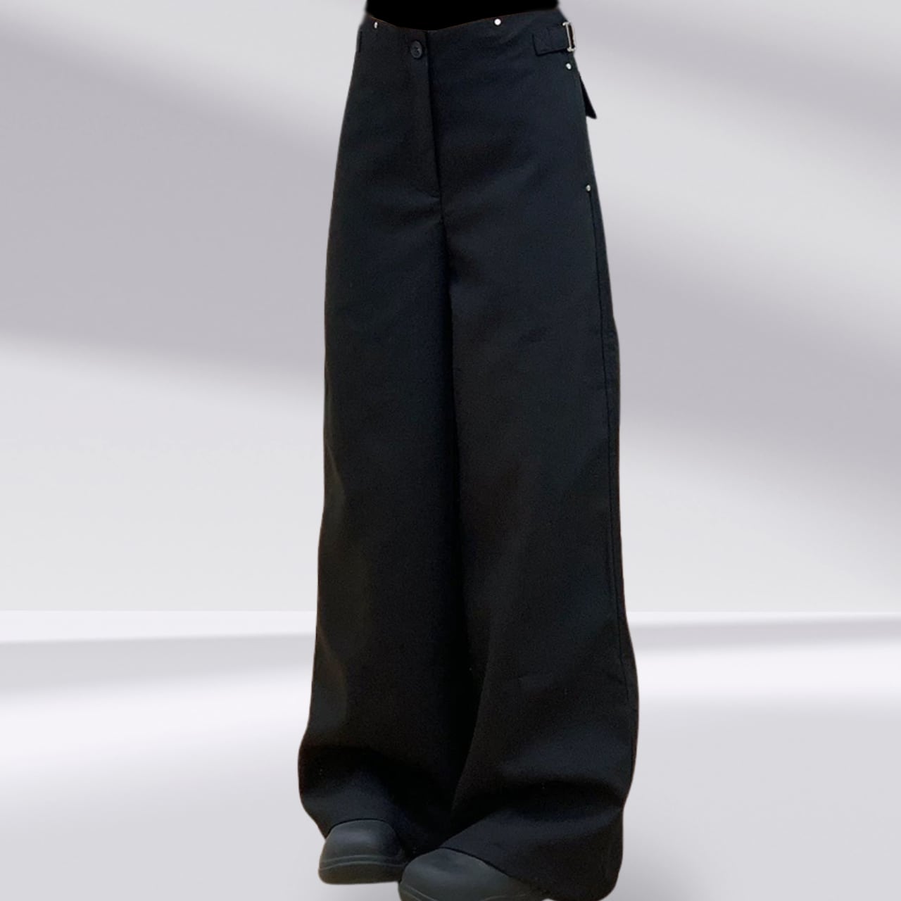 ハイウエストでワイドなシルエットのカジュアルパンツ。ウエストのサイドベルトでさらにスタイルアップ見え。ポケットに施されたスタッズが程よいアクセントに。
